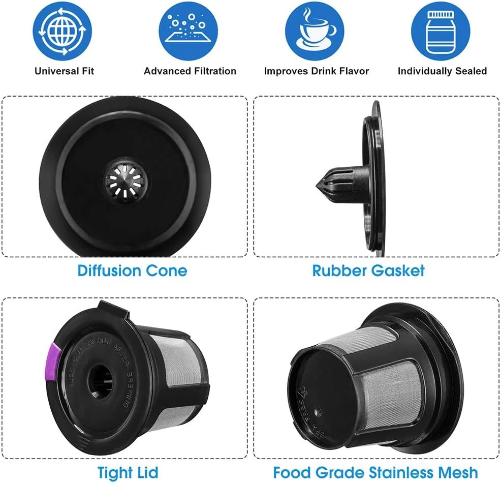 Reusable K Cups, 4 Pack Universal Fit Reusable Coffee Filters with Food Grade Stainless Steel Mesh Eco-Friendly Coffee Pods, for 1.0 and 2.0 Brewers Product Details Material: Plastic Brand: InwodiTeki Shape: Basket,Cone Number of Pieces: 4 Unit Count: 2 Count Manufacturer: InwodiTeki Package Dimensions: 5.24 x 5.08 x 4.45 inches Item Weight: 3.2 ounces Country of Origin: China Item model number: ITK-003 NEWEST DESIGN, UNIVERSALLY COMPATIBLE: Compatible with K- 1.0:K15,K31,K40,K45,K55,K60,K66,K70,K75,K77,K80,K100;B31,B40,B44,B50,B60,B70,B77,B100,B140,B145,B200,B300. K- 2.0 Brewers:K200,K250,K300,K350,K360,K400,K450,K460,K500,K550,K560. As well as the following brewers: K- Elite, K-Select, K-Classic, K- Ultra, K-Special Edition, K- Ultimate, and the K- Platinum. K CUP, Mr. Coffee K CUP. SAVE MONEY: Reusable Coffee Filters suit included 4 packs and each one can use many times. With our refillable k cup coffee filters, you can stop buying disposable K Cups that made out of paper or lower quality plastic! Our k cups will help you minimize all brewing accessories expenditures, allowing you to get more out of your blend purchases, all the while helping you remain environmentally conscious, too! BPA FREE PLASTIC: Reusable Coffee Pods are made from high quality materials, BPA free plastic and food grade stainless steel, which is dishwasher safe and Through the HOT water will not take Hazardous substances! One-piece design with stainless steel high heat resistant mesh system. Helping produce the best brews you ever had! Our ridge-less design on the inside also makes clean up easily. ECO FRIENDLY & SAFE: Reusable k cups are not only excellent for you and your personal enjoyment, they are also extremely helpful to our planet. Help reduce your carbon footprint by reusing your refillable k cups all while enjoying your favorite coffee. Our ridge-less design on the inside also makes cleanup a breeze. EASY TO USE: Our all-in-one single serve coffee pod and built-in filter is all you need. No extra adapter, parts, or tools required.
