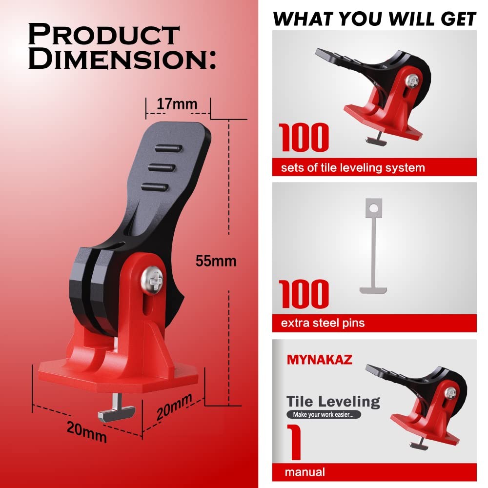 Tile Tools for Leveling Installation, Reusable Tile Leveling System, Floor Leveling Tools, Tile Leveling Clips Tile Spacers (100 Sets) PACKAGE CONTAINING - ① 100 sets of tile leveling system—you can use this tile leveling system directly once you take them out of the package, no need for any further assembling or aiding tools; ② 100 extra steel pins— in case you can not remove the pin successfully, 100 spare pins are included for replacement; ③ 1 manual—clearly show how to use tile leveling system. EASIER & MORE EFFICIENT WORK - tile tool for leveling is much easier and faster to use and remove. Comparing to the traditional leveling system ( a lodge, a wedge and a plier ), our upgraded tile leveler is all-in-one leveling system. This tile leveling system is well thought-out, which makes large amount of leveling very easy to get the tiles lined up and pulled to level. TIME & MONEY SAVED - useful floor leveling compounds can be re-used, meanwhile they are durable and very cost-effective. With this tile tool, everyone can take the guesswork out of leveling tiles. Without the need for any particular skills or experience, this tile leveling system promises you flat and anti-lippage tile surfaces. AMERICAN STANDARD QUALITY - floor leveling tool consists of heavy plastic and sturdy steel pins. As other plastic clips are very fragile and easy to break off, our ingenious tile leveling clips were updated to “T” steel pins, which is much solider and easier to fit into gaps and be removed. Each set of our tile leveling system is under strict quality control, ensuring you receive them without defects. LEVEL TILES & EVEN GAPS - tile leveling system can easily fit into tight gaps and help uneven tiles pulled into alignment. Using these tile clips ensures that all the corners are flush. These tile tools for installation make an expensive tile project turning out professional a breeze no matter whether done by a novice or expert tile installer.