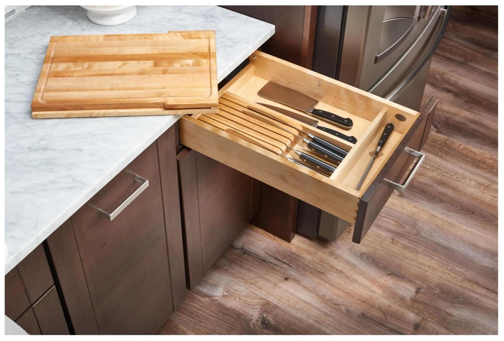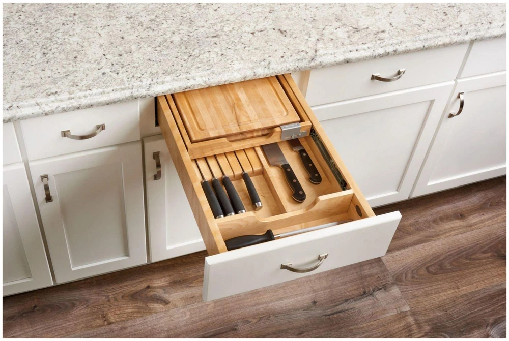 Powered by Frooition All Categories Rev-A-Shelf 4KCB-18HSC-1 Wood Classics 15" Two Tier Kitchen Knife Cutlery Organizer and Cutting Board Full Replacement Drawer System with Soft Close - Prep Station Overview Item Description If you want a professional kitchen with a prep station, then look no further than Rev-A-Shelf's combination knife holder and cutting board. The unique design has additional compartments for storing cutlery, utensils, and more. Available in varying sizes for multiple cabinet applications, this complete drawer has you covered from preparation to serving. Features: Undermount soft close full extension concealed slide system Cutting drawer slides back into cabinet for easy access to knives Pre-assembled drawer box replaces your existing drawer Simply add your own drawer front (not included) Cutting board removes for easy use and cleaning Designed for cabinet drawer opening width of 15" Adjustable door mount brackets are included and required for operation Fully assembled maple wood construction for durability Entire drawer fits into existing cabinet drawer space 90 lb full-extension BLUMOTION slides with soft-close Covered by Rev-A-Shelf's limited lifetime warranty Specifications: Depth: 21-3/4" Height: 4-3/8" Width: 15" Minimum Opening Width: 15" Minimum Opening Height: 4-1/2" Includes: One (1) wood drawer One (1) pair of Blum slides One (1) wood cutting board Why Choose BuildInc? OUR PROMISE TO YOU About Us At Build, we promise to provide the best selection we can, most competitive pricing, and unmatched customer service. Our store has quality home improvement products from trusted manufacturers like Moen, American Standard, Delta, Kraus, Kichler, Progress Lighting, Schlage, Kwikset, Baldwin, Broan, NuTone, Air King, and Rev-A-Shelf. With over 200,000 home improvement products for you to choose from, we have just what you need to get your project done. Fast & Free Shipping We promise to make it our priority to get you your items as fast as we can. We ship from 440 warehouses around the country, ensuring that your product will get to you as soon as possible. We know you're eager to get your hands on your new purchase, we would be too. As a bonus, most items ship for free. Returns We are happy to accept returns of unused or defective items for a refund within 30 days from the date of delivery. For returns outside 30 days, please contact our Customer Service team to go over our options. For full details, please view the Shipping and Payments tab above. To initiate a return simply go to the eBay Returns Portal and submit a return request. We ask that all items be returned with all original components via a traceable method. Once your return is received and processed, we will quickly get your refund or replacement issued. If for any reason you are unsatisfied with your purchase or for product or warranty questions, please contact Customer Service team for assistance. More Items! View more great items! About Us | Shipping | Returns | Contact Us | FAQ | Collections | Special Offers! Powered by Frooition Frooition Frooition | No-js Template | eBay design, eBay store design, eBay shop design, eBay template design, eBay listing design (ver:froo_no_js) This listing is currently undergoing maintenance, we apologize for any inconvenience caused.