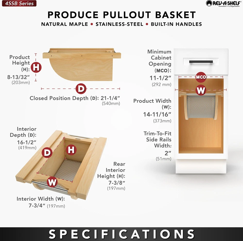 Powered by Frooition Top Products Kitchen Bathroom Lighting Fans Hardware Decor & Organization Rev-A-Shelf 4SSB-15 Modern 14-11/16" Wide Cabinet Door Organizer with Produce Basket Overview Item Description Store your produce in style with the 4SSB Series stainless-steel produce baskets! These removable baskets are designed for base cabinets and intended for use without cabinet doors. The perforated design promotes ample air circulation and prevents moisture buildup, keeping your fruits and vegetables fresher for longer. Enjoy simple installation with trim-to-fit side rails and easy transportation using the built-in handles. Features: Unique perforated design allows for proper ventilation when storing produce Stainless-steel is rust-resistant Baskets are fully removable and feature built-in handles for easy transport Designed for 15” base cabinets Intended for use without cabinet door Installs easily with trim-to-fit side rails and (6) No. 8 flat head screws (not included, length is based on cabinet construction) Minimum cabinet opening for a face frame cabinet is 12.00"W x 21.75"D x 9.50"H Minimum cabinet opening for a frameless cabinet is 12.00"W x 21.75"D x 9.50"H Covered by Rev-A-Shelf's Limited Lifetime manufacturer warranty Includes: (1) wood produce basket (2) trim-to-fit side rails (screws not included) Specifications: Depth: 21-1/4" Height: 8-7/16" Width: 14-11/16" Minimum Opening Depth: 21-3/4" Minimum Opening Height: 9-1/2" Minimum Opening Width: 12" Materials: Hardwood and Stainless Steel Why Choose BuildInc? OUR PROMISE TO YOU About Us At Build, we promise to provide the best selection we can, most competitive pricing, and unmatched customer service. Our store has quality home improvement products from trusted manufacturers like Moen, American Standard, Delta, Kraus, Kichler, Progress Lighting, Schlage, Kwikset, Baldwin, Broan, NuTone, Air King, and Rev-A-Shelf. With over 200,000 home improvement products for you to choose from, we have just what you need to get your project done. Fast & Free Shipping We promise to make it our priority to get you your items as fast as we can. We ship from 440 warehouses around the country, ensuring that your product will get to you as soon as possible. We know you're eager to get your hands on your new purchase, we would be too. As a bonus, most items ship for free. Returns We are happy to accept returns of unused or defective items for a refund within 30 days from the date of delivery. For returns outside 30 days, please contact our Customer Service team to go over our options. For full details, please view the Shipping and Payments tab above. To initiate a return simply go to the eBay Returns Portal and submit a return request. We ask that all items be returned with all original components via a traceable method. Once your return is received and processed, we will quickly get your refund or replacement issued. If for any reason you are unsatisfied with your purchase or for product or warranty questions, please contact Customer Service team for assistance. More Items! View more great items Amerock BP37808 Farewind 10-1/16" Center to Center Fluted Bar - Bronze $34.99 Innovations Lighting 516-3I Caledonia Caledonia 3 Light 36"W - Brushed Brass / $572.00 Innovations Lighting 716-3CR-17-18 Brookhaven Cloche Chandelier - Antique Brass $715.00 Innovations Lighting 716-3CR-11-27 Caledonia Chandelier Caledonia - Black $583.00 About Us | Shipping | Returns | Contact Us | FAQ | Collections | Special Offers! Powered by Frooition Frooition Frooition | No-js Template | eBay design, eBay store design, eBay shop design, eBay template design, eBay listing design (ver:froo_no_js) This listing is currently undergoing maintenance, we apologize for any inconvenience caused.