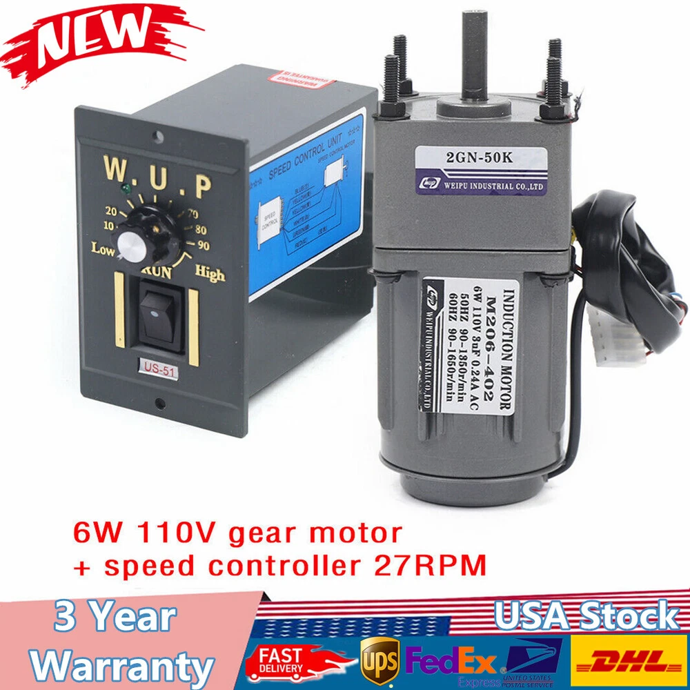 110V Reversible AC Gear Motor Electric Variable Speed Controller 50K 27RPM Specification: Name: geared motor Rated voltage: AC110 V Rated speed: 27RPM/MIN Reduction ratio: 1:50(50K) 6W geared motor:88mm*60mm*50mm Reducer size: 43m*60mm*50mm 6W gear motor Output speed: 27~0RPM Features: Flexible installation Efficient works Torque large Smooth operation Long working life Note: Under different deceleration ratio, the output shaft speed is different. The output shaft speed is equal to the motor speed of 1500 rpm divided by the deceleration ratio. Packages: 1 * Gear Motor 1 * Speed Governor 1 * reducer Note:Based on the industrial standard, to meet different needs of customers, our motor does not include the power cord, you need to purchase the power cord to connect. Reversible AC Gear Motor Electric Variable Speed Controller 27 RPM/MIN 1:50 110V 110V Reversible AC Gear Motor Electric Variable Speed Controller 50K 27RPM Specification: Name: geared motor Rated voltage: AC110 V Rated speed: 27RPM/MIN Reduction ratio: 1:50(50K) 6 W geared motor :88mm*60mm*50mm Reducer size: 43m*60mm*50mm 6W gear motor Output speed: 27~0RPM Features: Flexible installation Efficient works Torque large Smooth operation Long working life Note: Under different deceleration ratio, the output shaft speed is different. The output shaft speed is equal to the motor speed of 1500 rpm divided by the deceleration ratio. Packages: 1 * Gear Motor 1 * Speed Governor 1 * reducer Note:Based on the industrial standard, to meet different needs of customers, our motor does not include the power cord, you need to purchase the power cord to connect. Payment Delivery details Terms of sales About us Contact us Payment We accept ebay payment 。 Fees such as import duties, taxes are not included in the item price or shipping costs. These charges are the buyer's responsibility. Delivery details Shipping: 2-9 working days to: USA Terms of sales We maintain high standards of excellence and strive for hundred percent customer satisfaction. Feedback is very important to us. We hope that you contact us immediately before you give neutral or negative feedback, so that we can address your concerns. It is impossible to address issues if we do not know about them! About us Your satis faction is our ultimate goal. We work hard to earn your trust and future business. Our certified technicians have tested each item before shipping. The unit comes with 1 year limited warranty on all manufacturing defects. a) If you receive a defective item, you may return it or ask for a discount. Please contact us within 14 days after you receive the package. b) What you returned must be intact and in its original packaging as re? u. Customer is responsible for shipping costs of the returned item. c) We will cover the cost of shipping back t with the shipping rate indicated in the registration page. We will send you a new unit or refund the full payment you paid. Thank you. Contact us Business Hour Business Hour: Monday To Friday: 8:30 AM to 5:00 PM (Beijing China time) Due to time zones, our reply to your questions may not be immediately. But within above working time, we will reply your email within 24 hours. If it's non-workdays, please kindly be patient and wait till Monday. Please contact us with ebay message. Please feel free to contact us if you have any questions. Monday To Friday: 8:30 AM to 5:00 PM (Beijing China time) Due to time zones, our reply to your questions may not be immediately. But within above working time, we will reply your email within 24 hours. If it's non-workdays, please kindly be patient and wait till Monday. Please contact us with ebay message. Please feel free to contact us if you have any questions. Brand Unbranded Feature 1 Great Durability,Exquisite Appearance,High-quality Features Compact Design and Beautiful Appearance *Feature*1 High-performance,Good stability,Easy Operation Features: Easy installation,Convenient Use,Easy Operation MPN Does Not Apply Name geared motor Rated voltage AC110 V Rated speed 27RPM/MIN Reduction ratio 1:50(50K) Power Phase single-phase Reducer size 43mm*60mm*50mm 6W gear motor Output speed 27~0RPM 6W geared motor 88mm*60mm*50mm Nominal Rated Input Voltage 110 V Current Type AC Rated Load (HP) N/A Reversible/Non-Reversible Reversible Shaft Angle N/A EAN Does not apply UPC Does not apply ISBN Does not apply