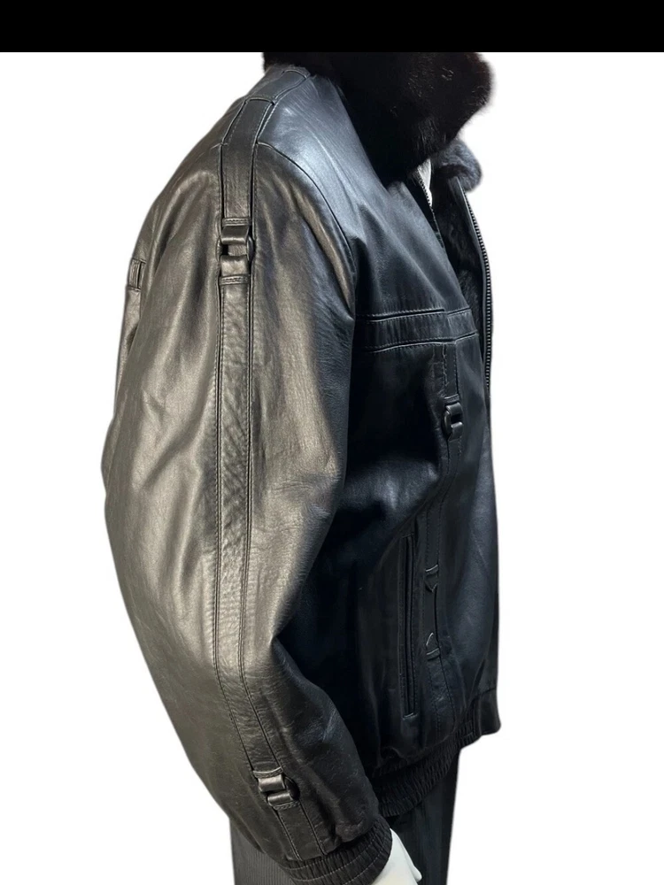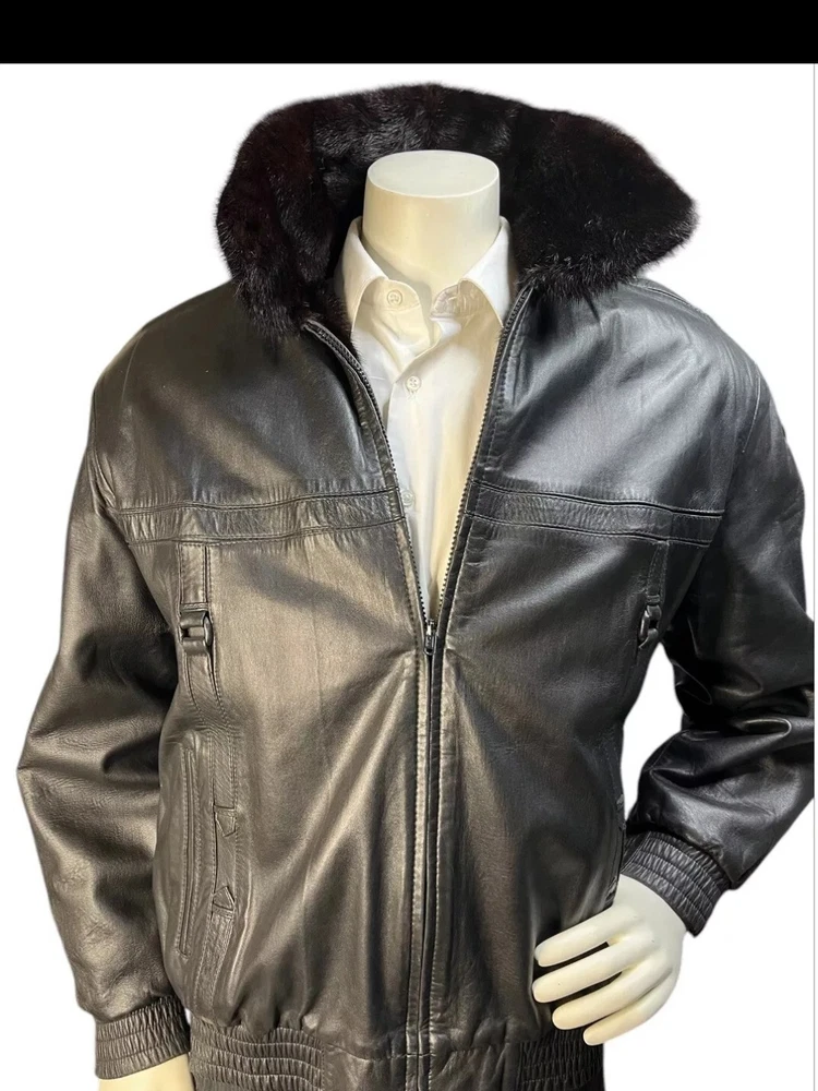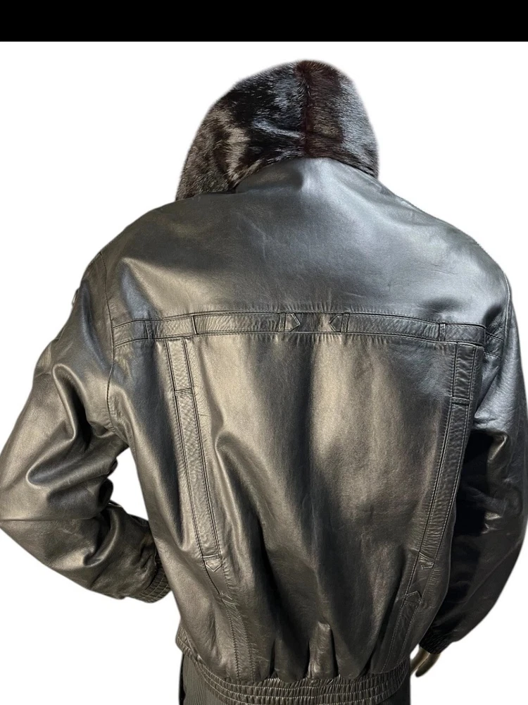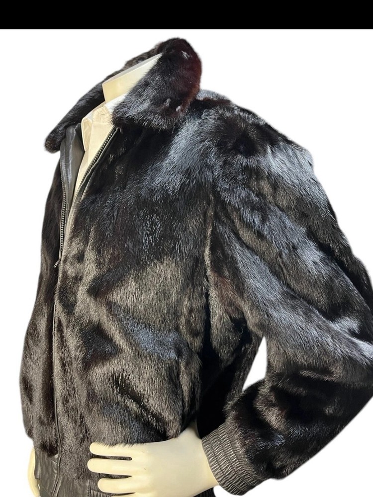 This custom made black reversible men's mink leather bomber jacket in size large is a stylish and luxurious outerwear option. Made in the United States, the jacket features a mid-length design with a classic fit and a zip closure. Perfect for various occasions such as parties, formal events, and business meetings, this jacket is both versatile and sophisticated. The unique reversible feature adds an extra touch of practicality, making it a versatile addition to any wardrobe for the winter season.