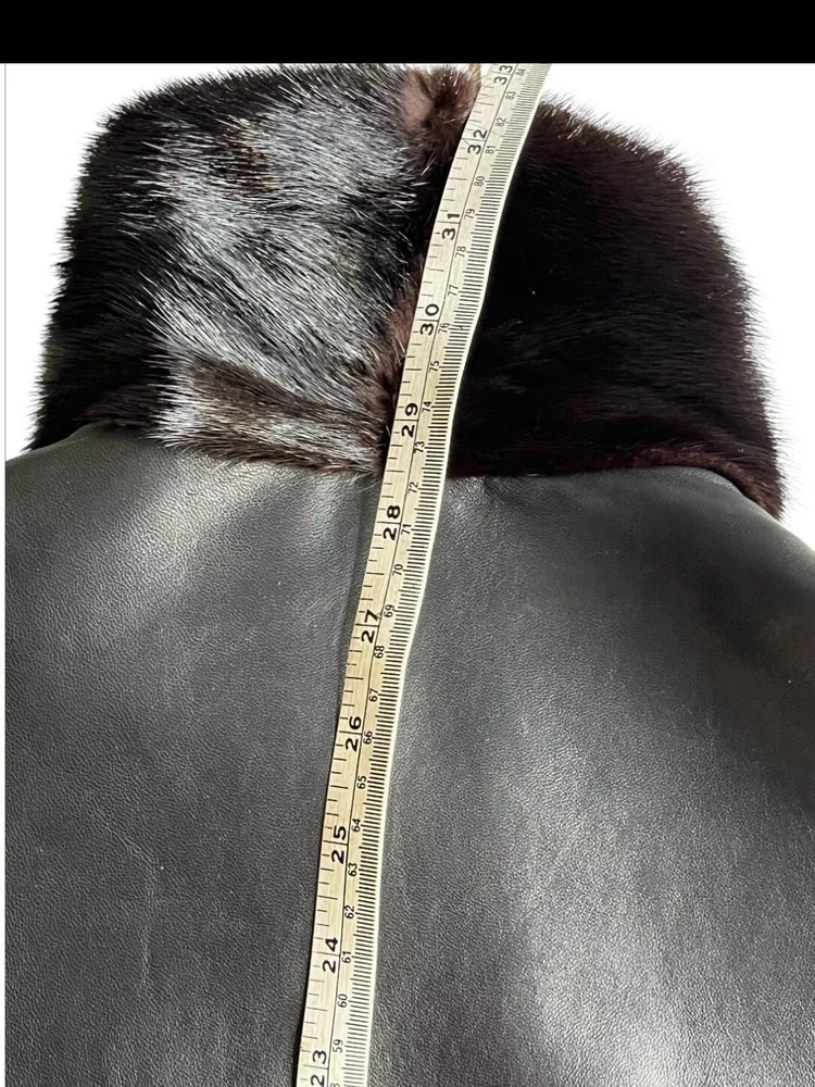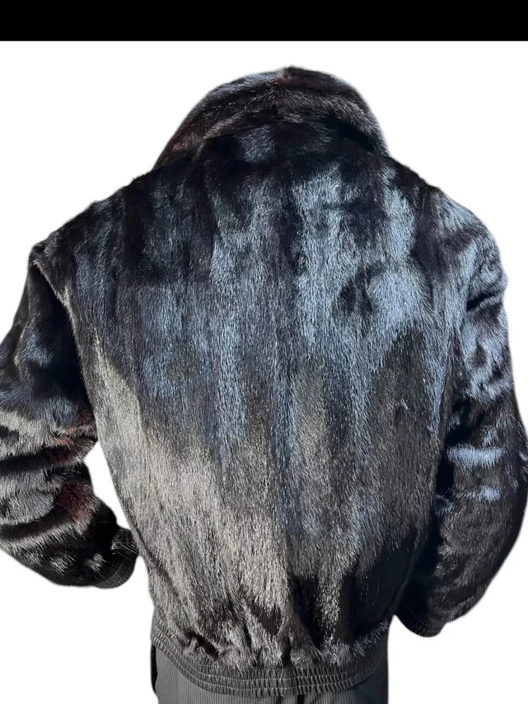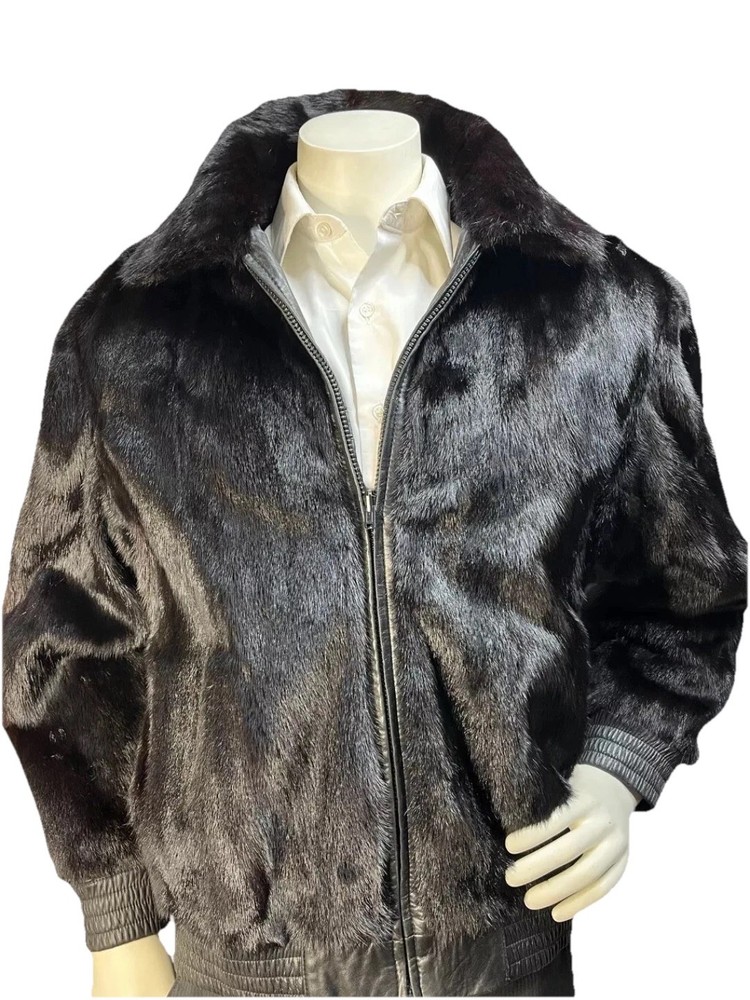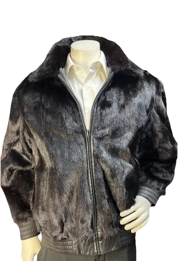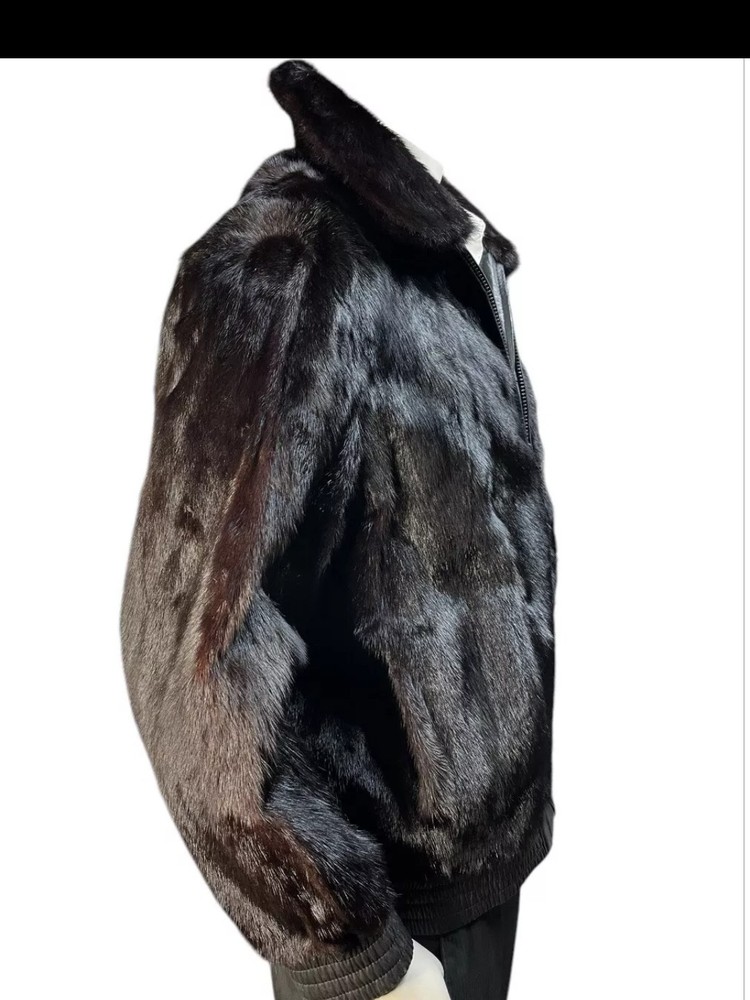 This custom made black reversible men's mink leather bomber jacket in size large is a stylish and luxurious outerwear option. Made in the United States, the jacket features a mid-length design with a classic fit and a zip closure. Perfect for various occasions such as parties, formal events, and business meetings, this jacket is both versatile and sophisticated. The unique reversible feature adds an extra touch of practicality, making it a versatile addition to any wardrobe for the winter season.