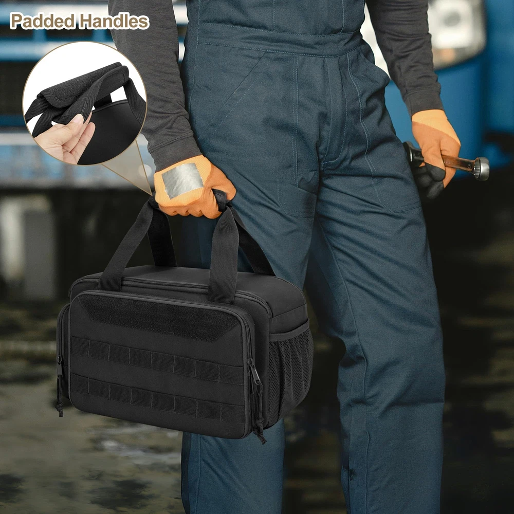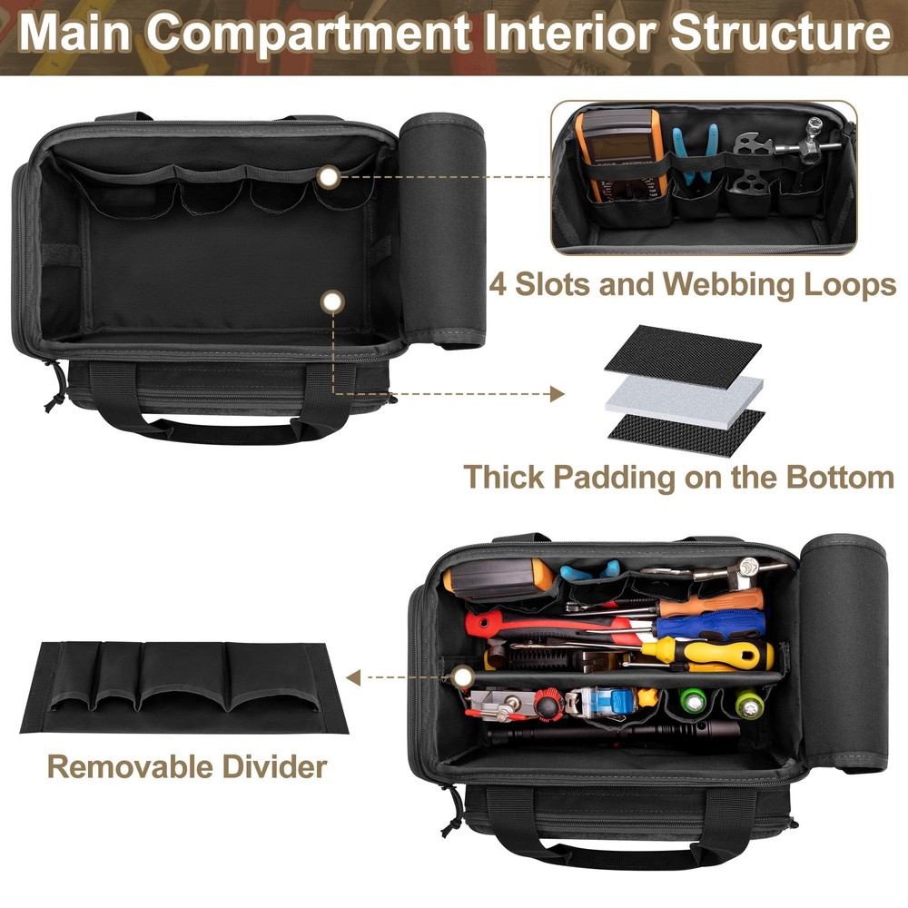 Rexmica 12-Inch Tool Bag with Anti-friction Bottom, Hand Tool Storage Organizer Bag for Men, Tactical Bag, Range Bag, Multi-purpose Work Bag for Repairman, Electrician, Carpenters, Handyman, Black DIMENSIONS - L 12.2” x W 6.7 x H 7.5”. This tool storage made of outstanding quality nylon material, the bottom with PU coated anti-slip fabric, which can reduce friction between the tool tote and the ground ensure long-term service. (Patented Design) WELL ORGANIZED - Main compartment with 1 removable divider and multiple slots for organizing various hand tools or small power tools, such as wrenches, pliers, screwdrivers, digital multimeter, small electric screwdrives. ACCESSORY POCKETS - Left side zipper pocket and right side mesh pocket suitable for adhesive tape, tape measure, gloves, etc. The front accessory pocket for some short tools. HAND TOOL BAG - The top handle with padded wrap for comfortable grip and relieve stress on hands.The full-opening design allows you to access the tools you want with one hand while working. Suitable as a daily tool bag at home, in the tool room or in the car trunk. MULTIPURPOSE - Rexmica tool organizer bag can meet your most daily demand, keeps hand tools and accessories organized. Multi-function work bag can also be used as an electrician tool bag or garden tool bag. A must-have tool bag for repairman, electrician, carpenters, handyman DIMENSIONS - L 12.2” x W 6.7 x H 7.5”. This tool storage made of outstanding quality nylon material, the bottom with PU coated anti-slip fabric, which can reduce friction between the tool tote and the ground ensure long-term service. (Patented Design) WELL ORGANIZED - Main compartment with 1 removable divider and multiple slots for organizing various hand tools or small power tools, such as wrenches, pliers, screwdrivers, digital multimeter, small electric screwdrives. ACCESSORY POCKETS - Left side zipper pocket and right side mesh pocket suitable for adhesive tape, tape measure, gloves, etc. The front accessory pocket for some short tools. HAND TOOL BAG - The top handle with padded wrap for comfortable grip and relieve stress on hands.The full-opening design allows you to access the tools you want with one hand while working. Suitable as a daily tool bag at home, in the tool room or in the car trunk. MULTIPURPOSE - Rexmica tool organizer bag can meet your most daily demand, keeps hand tools and accessories organized. Multi-function work bag can also be used as an electrician tool bag or garden tool bag. A must-have tool bag for repairman, electrician, carpenters, handyman Shipping from the USA All of our products are shipped from the USA, ensuring quick delivery to your destination. Payment We offer the following payment methods: PayPal, credit card, bank transfer, and eBay's secure payment system. Free Shipping & Free Returns Shipping within the USA is FREE. Additionally, any return is absolutely free for you. Risk-Free Purchase You have the option to return an item within 30 days without any justification. We cover the return shipping costs! Fast Shipping We ship immediately upon receipt of payment. Generally, the package is delivered within 2-3 days in the USA. If it takes longer, we will contact you. Quality and Costs Made in Europe, USA, China No customs fees or additional charges Total satisfaction guarantee Invoice with declared VAT available upon request in .pdf format Feedback Your feedback is very important to us. After you pay for your purchase, you will automatically receive positive feedback from us.