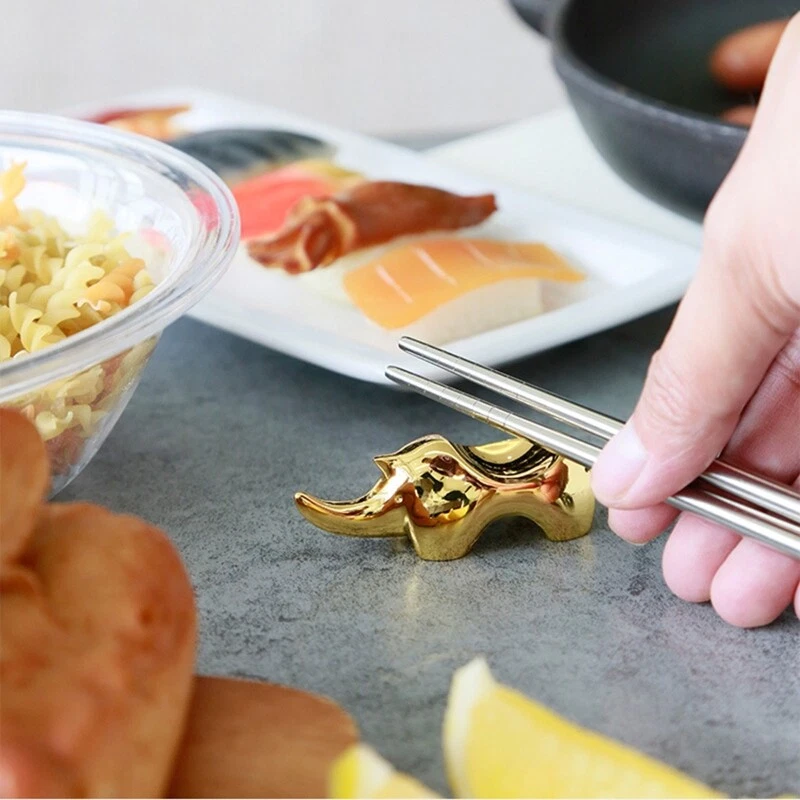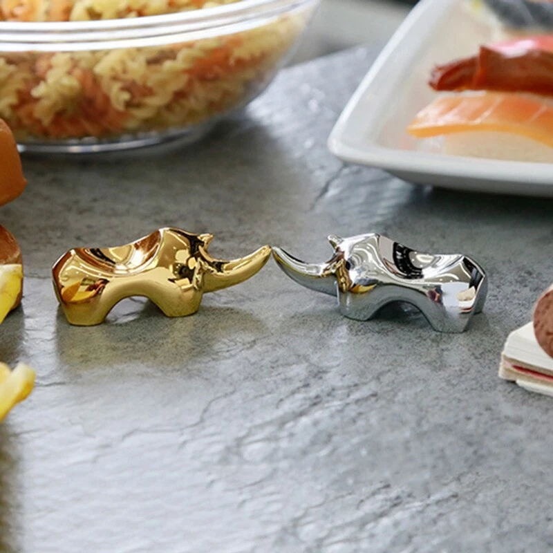 Rhino Chopsticks Rest Dinner Spoon Stand Knife Fork Holder Storage Rack and high Features: The rhino is not more than rests, they are also ornaments, adding more fun to our everyday life. Spoons, forks chopsticks are able to be held and these rests can hold two or more. As a result, they must be as a kind of holiday decors. Suitable for holding chopsticks, forks, spoons, or other tablewares. It can help many housewives reduce burden that they are essential at the table, and they look gorgeous for formal dining. zinc alloy material, good-looking and easy to for everyday use or gifts. Specification: Zinc Alloy Size: approx.6x2.1x2.3cm/2.36x0.83x0.90in Optional Colors: Golden, Silver Quantity: 1 Pc Note: Please allow 0-1cm error due to manual measurement. pls make sure you do not mind before you bid. Due to the difference between different monitors, the picture may not reflect the actual color of the item. Thank you! Package Contents: 1 x Chopsticks Rest (other accessories in the picture is not included!)