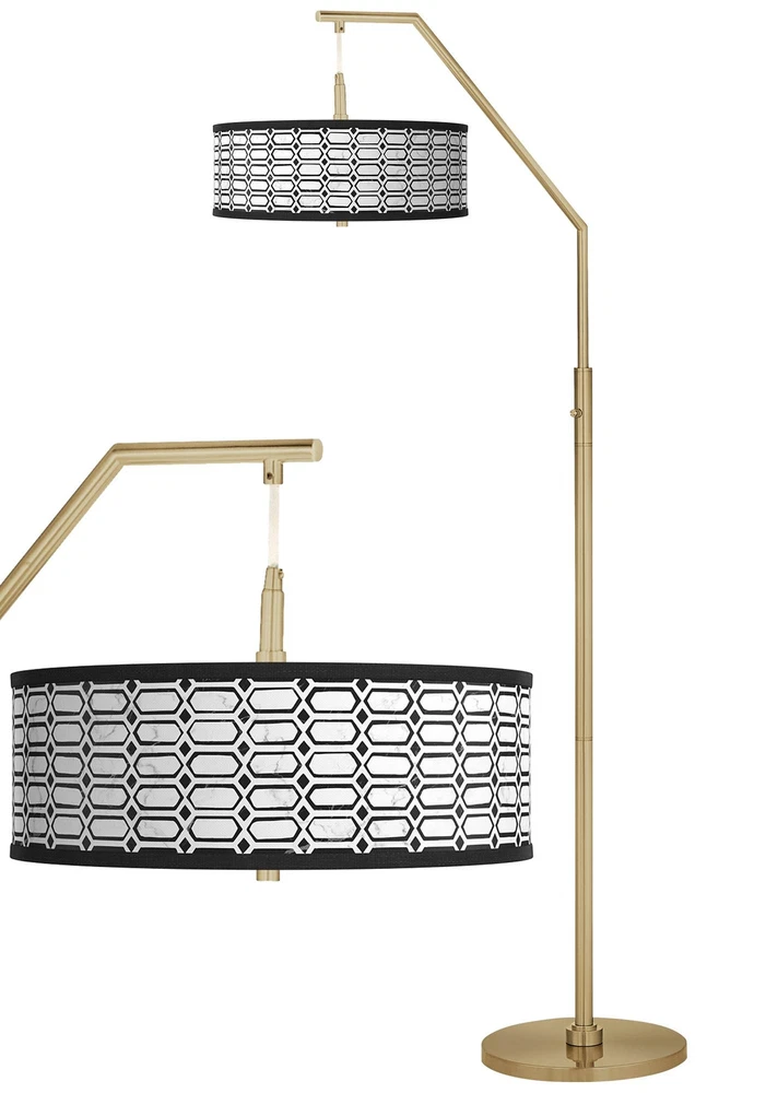 Shop Sale > Chandeliers Ceiling Lights Lamps Wall Lights Outdoor Lights Fountains Ceiling Fans Furniture Decor Rhombi Giclee Warm Gold Arc Floor Lamp Style #943X9 PRODUCT DETAILS: 71 1/2" high overall. Base is 14" wide. Shade is 16" across the top x 16" across the bottom x 5 1/2" high. Weighs 23 lbs. Uses two maximum 100 watt standard-medium base light bulbs (not included). 4-position stem column switch. Switch positions: Right bulb on, left bulb on, both on, both off. Contemporary arc floor lamp from the Giclee Glow brand. Translucent Rhombi shade with diffuser. Shade has the exclusive pattern and is custom made to order. Shade printing process U.S. Patent # 7,347,593. Warm gold finish. Metal construction. 8-foot long cord. DESCRIPTION: Add style with this contemporary arc floor lamp design. It features a warm gold finish and a shade with a bottom diffuser to prevent glare. The shade shows off an exclusive Rhombi shade pattern and is giclee printed and made to order. Stem switch allows for two different lighting levels for ultimate convenience. Shade printing process U.S. Patent # 7,347,593. *Free Shipping applies only to orders shipping to the 48 continental United States that qualify and meet the minimum purchase requirement; standard shipping only and select products excluded, including freight and oversized items. Free Returns valid on select items in United States only; does not apply to freight, clearance, Daily Sale, designs with giclee art shades, Color Plus and Tiffany Color Plus brand items, or certain items with designer shades.