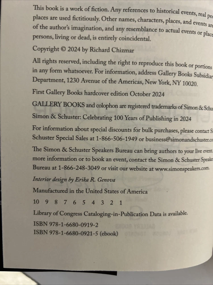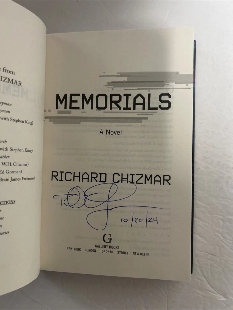 Offered is the just released 2024 soon to be popular bestselling hardcover book Memorials by Richard Chizmar. Book is SIGNED and DATED (2 days before official release date) on the title page. Book is a first edition first printing in brand new condition. Great gift idea!! Spine is tight and square. All pages are clean, no creases or tears. No writing or markings. Dust jacket is excellent, no creases and no tears. Look closely at photos (sorry for any glares) to see the brand new condition of this just released book. Always a full refund if not completely satisfied. Ships to U.S. only via USPS media mail with tracking and delivery confirmation. State sales tax may be required depending on state where buyer resides. Thanks for looking.