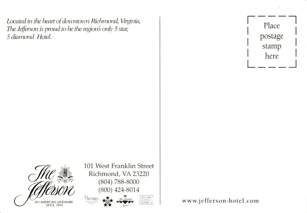 The Jefferson is a historic 5-star, 5-diamond hotel located in downtown Richmond, Virginia. It has been an American landmark since 1895 and is the region's only hotel with this prestigious rating. The hotel is situated at 101 West Franklin Street in Richmond, VA 23220.