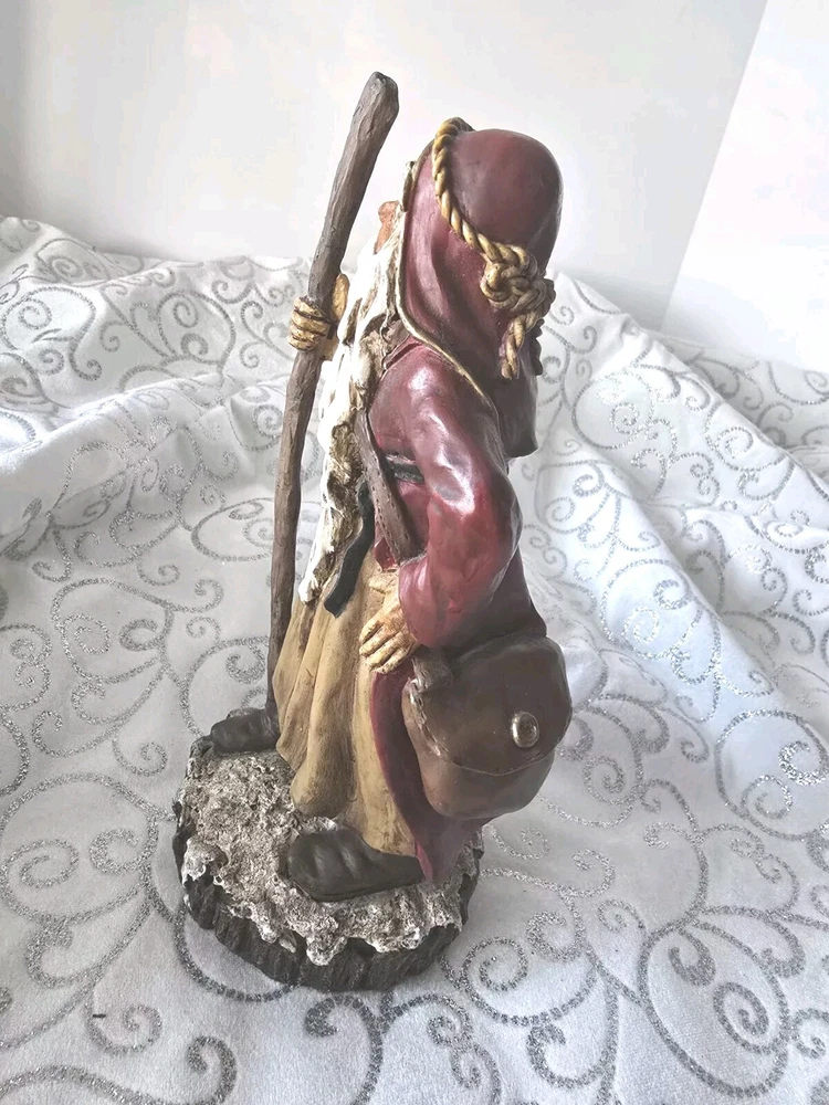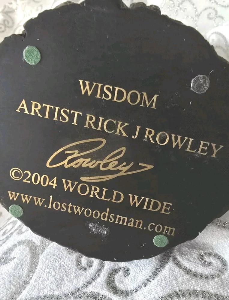 This beautiful sculpture titled "Wisdom" depicts an old man with a wise look on his face. The statue stands 9 inches tall and is made of plastic. It features intricate details and is artist signed by Rick J. Rowley. The sculpture has a abstract style and represents the culture of "Lost Woodsman". It is a perfect addition to any art collection.