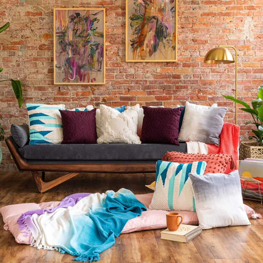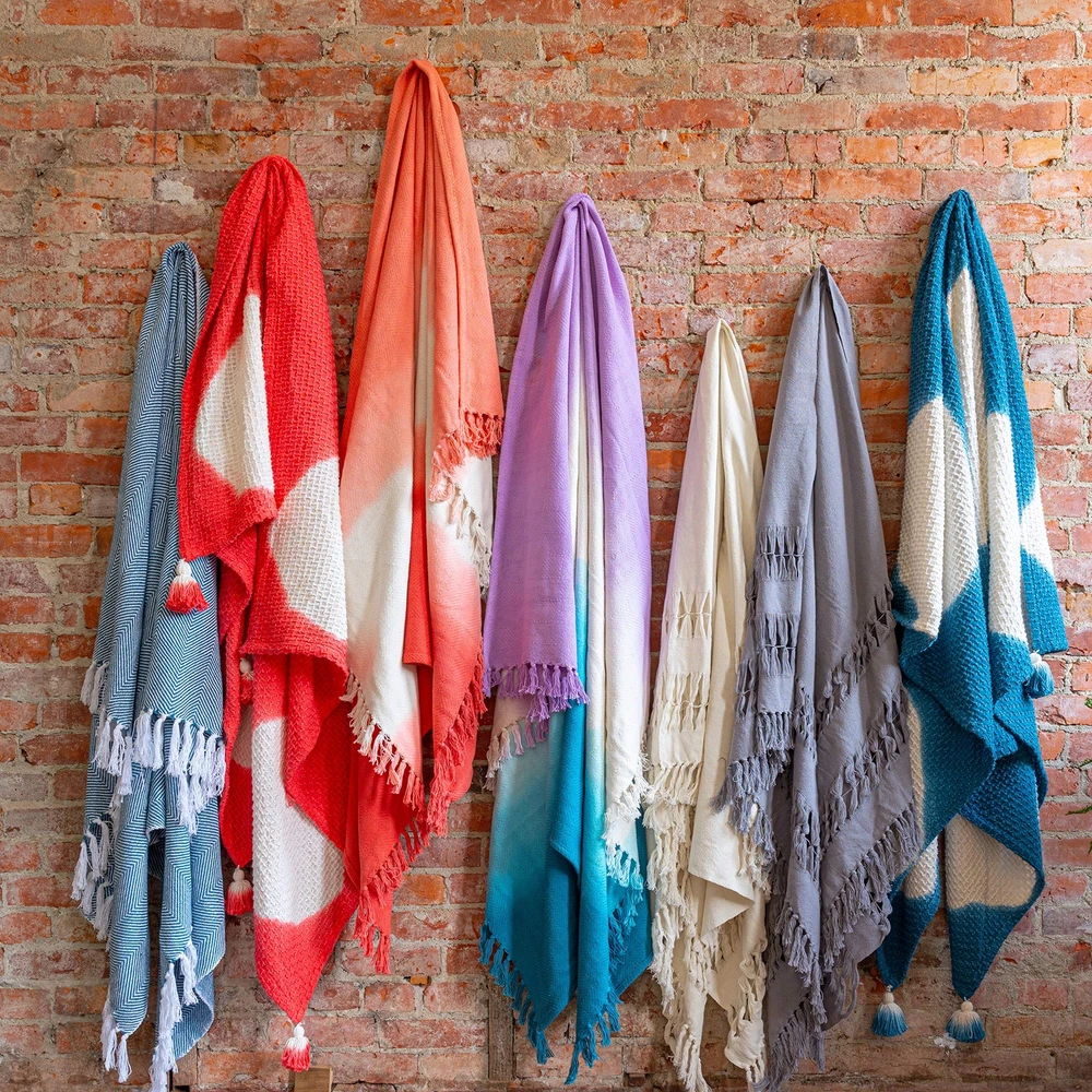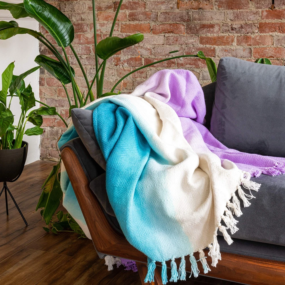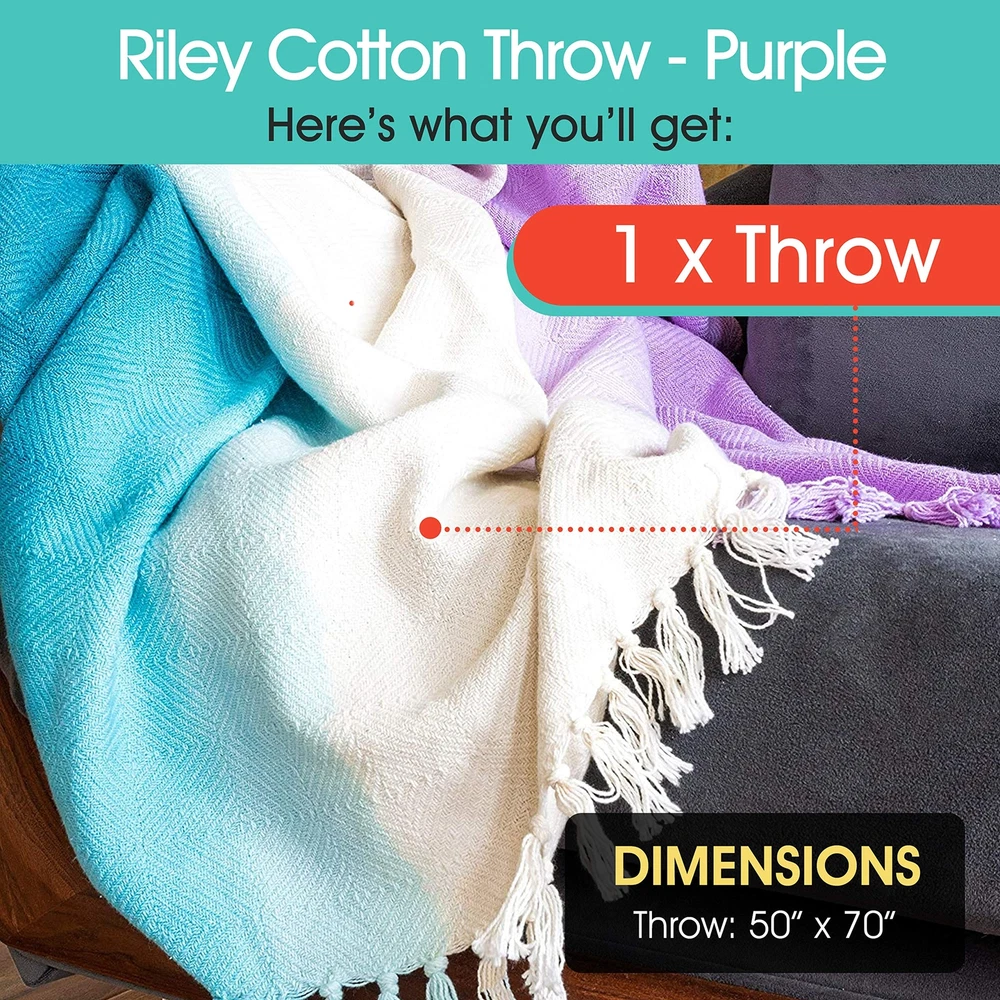 Riley Dip Dye Cotton Fringe Throw Blanket, 50 x 70, Purple INCLUDES: 1 throw blanket DIMENSIONS: 50 inches x 70 inches FABRIC DETAIL: Add an unexpected pop of color to your bed, couch, or favorite chair with this cozy throw, which features a dyed colorblock design and fringe. DURABLE: Made of 100% cotton for lightweight comfort. EASY CARE: Hand Wash