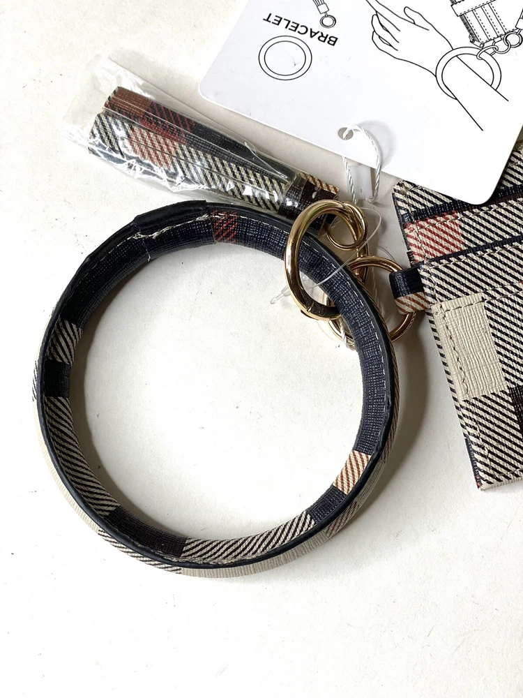 This is a Gangnam Print Ring Loop Cardholder Wristlet made of Faux Leather in Multicolor. It features a Vegan Leather fabric, a Key Ring, Coin Accent, and Tasseled design. The item is a small size (S) and has a Lanyard Style Bracelet with a length of 4.5 inches and width of 3.5 inches. It is designed for women, with a focus on functionality as a Card Wallet.