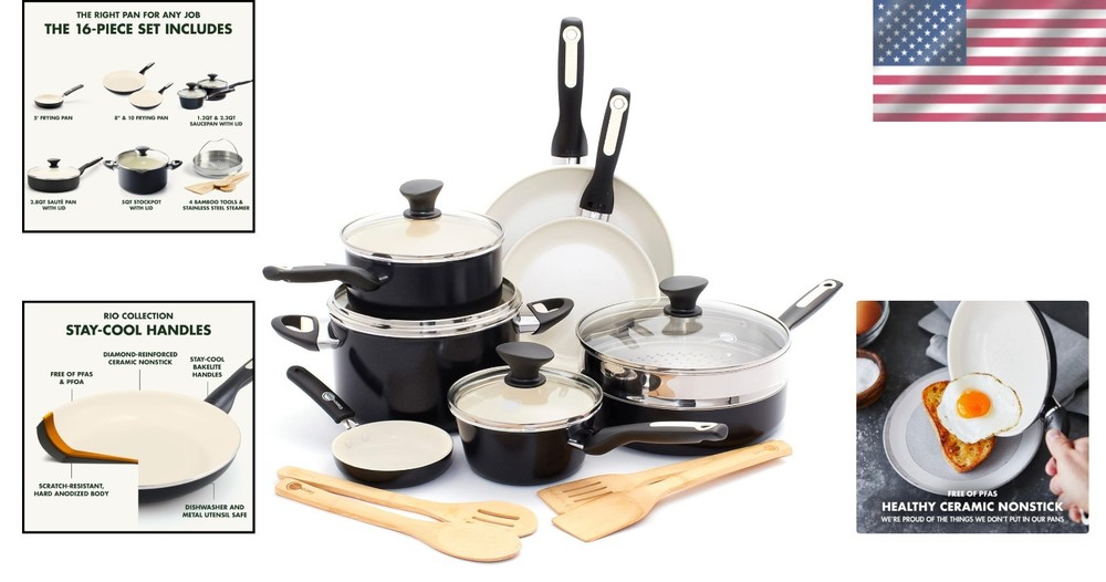 Rio 16-Piece Nonstick Cookware Set - Healthy Ceramic, PFAS-Free, Dishwasher Safe ‹ › ‹ › ‹ › ‹ › ‹ › ‹ › ‹ › ‹ › ‹ › ‹ › ‹ › Rio 16-Piece Nonstick Cookware Set Transform your culinary experience with the vibrant and elegant Rio 16-Piece Nonstick Cookware Set, designed for health-conscious chefs and cooking enthusiasts alike. This exquisite set not only adds a splash of color to your kitchen but also represents the pinnacle of functionality and safety in cooking. Key Features: Complete Set: Includes 5”, 8”, and 10” frying pans; 1QT and 2QT saucepans with lids; 3QT sauté pan with lid; 5QT stock pot with lid; stainless steel steamer; and bamboo utensils. Reinforced with Diamonds: Metal utensil safe, diamond-infused nonstick coating ensures durability and effortless cleanup. Toxin-Free: Experience worry-free cooking with a Thermolon healthy ceramic nonstick coating free of PFAS, PFOA, lead, and cadmium. Tough Aluminum Bodies: Heavy-duty aluminum construction guarantees extreme strength and quick, even heating every time. Oven Safe: Suitable for oven and broiler use, up to 350°F, and compatible with all stovetops except induction. Ergonomic Handles: Stay-cool Bakelite handles offer a sturdy and comfortable grip, preventing overheating during cooking. View Your Cuisine: Durable glass lids lock in heat and moisture while providing a view of culinary creations in progress. Easy to Clean: Dishwasher safe for effortless cleanup, with most messes wiping clean easily. Why Choose the Rio Cookware Set? Cooking is not just about preparing meals; it's about creating experiences. The Rio 16-Piece Cookware Set marries functionality with elegance, allowing you to sauté, simmer, and sear with grace. Its eco-friendly design promotes a healthier kitchen environment, while the diamond-reinforced nonstick surface ensures longevity and performance. Whether you’re an aspiring chef or a seasoned cook, this set meets all your cooking needs, empowering you to serve gourmet dishes with confidence. Elevate your kitchen game and enjoy every moment spent cooking with the Rio 16-Piece Nonstick Cookware Set. Embrace the beauty of healthy cooking today! Shipping Free & Fast Shipping - We offer free shipping to most of the USA with a normal delivery time of 3-7 days. However, due to the current situation, additional delivery time (up to 3 weeks) may be required for some items. Alternative Carriers - We may use alternative carriers (e.g. USPS, FedEx, UPS, etc.) to ensure your package arrives safely and on time. Due to the use of multiple carriers, we are unable to provide a tracking number automatically. Handling Time - Orders are processed and shipped within 1-2 business days of receiving cleared payment. Shipping Restrictions - Shipping to Alaska, Hawaii, Puerto Rico, Guam, and other US territories may incur shipping charges or delivery restrictions. Please contact us before ordering, or your order can be refunded/cancelled. State Restrictions - There may be restrictions based on your state of purchase. For example, certain items may not be shipped to California due to state regulations. Contact for Tracking Updates - If you require tracking updates or have any concerns about the delivery of your order, please feel free to contact us, and we will be happy to assist you. Return 30-Day Hassle-Free Returns - We want you to be completely satisfied with your purchase. If you are not, you can return the item within 30 days of receiving it for a full refund or exchange. Easy Return Process - To start a return, simply contact us and we will provide you with a prepaid return shipping label and detailed instructions. Restocking Fee - There are no restocking fees for returns. However, the buyer is responsible for return shipping costs if the return is not due to a seller's error. Refund Processing Time - Refunds will be processed within 5 business days of receiving the returned item in its condition. Payment We accept all major credit cards, PayPal, and Apple Pay for your convenience. Your payment information is secure and encrypted to ensure a safe and seamless transaction. Please complete your payment within 3 days of purchase to avoid any delays in shipping. Feedback Your feedback is extremely important to us. We strive to provide the best products and customer service possible. If you are satisfied with your purchase, please take a moment to leave us a positive review. If you have any concerns or issues with your order, please contact us before leaving negative feedback. We are committed to resolving any problems and ensuring your satisfaction. Contact Us If you have any questions or concerns, please feel free to out to our customer support team. You can contact us through the eBay messaging system. We are available Monday to Friday, 9:00 am to 5:00 pm EST, and we will do our best to respond to your inquiry within 24 hours. Buy it now and enjoy a pleasant shopping experience! Unit Quantity: 1.0 count Stove Type Compatibility: Electric,Gas,Induction Set Includes: Frying Pan,Lid,Saucepan,Saute Pan,Stockpot,Stock Pot,Stainless Steel Steamer,Bamboo Solid Spoon,Bamboo Slotted Spoon,Bamboo Solid Turner,Bamboo Slotted Turner Material: Aluminum,Bamboo,Ceramic,Glass,Plastic Type of Oven: Electric,Gas,Oven,Broiler Features: Dishwasher Safe,Easy Clean,Non-Stick,Oven-Safe,Transparent,Ergonomic Handles Type: Cookware Set Color: Black Surface Coating: Ceramic Item Diameter: 10 in Number of Items in Set: 16-Piece Item Depth: 6.7 inches Heat Resistance: 350°F Item Weight: 8.89 kg Shape: Various Item Height: 6.7 Inches