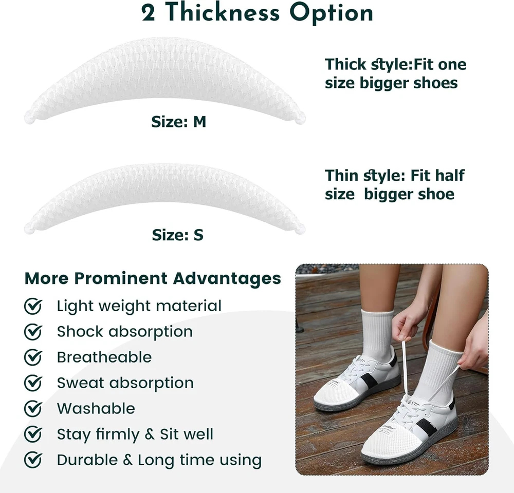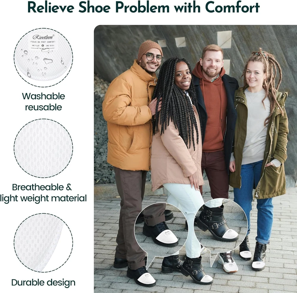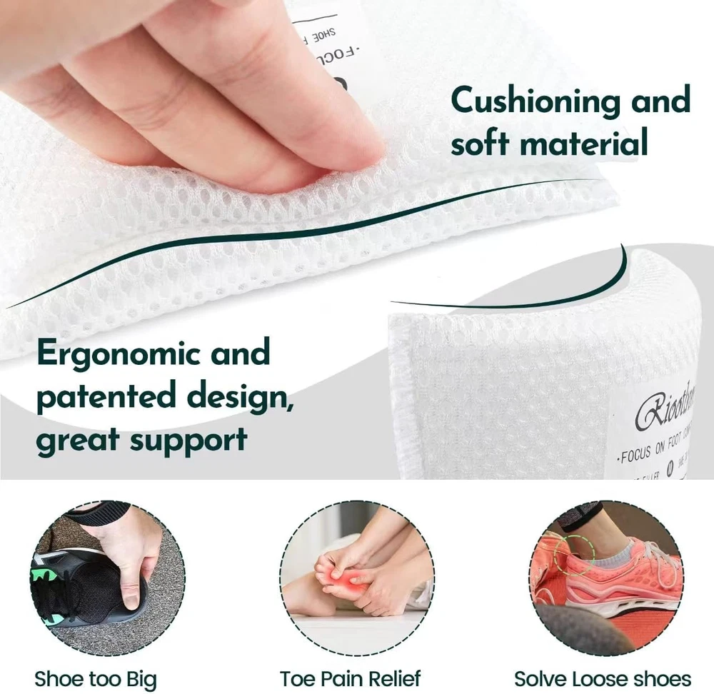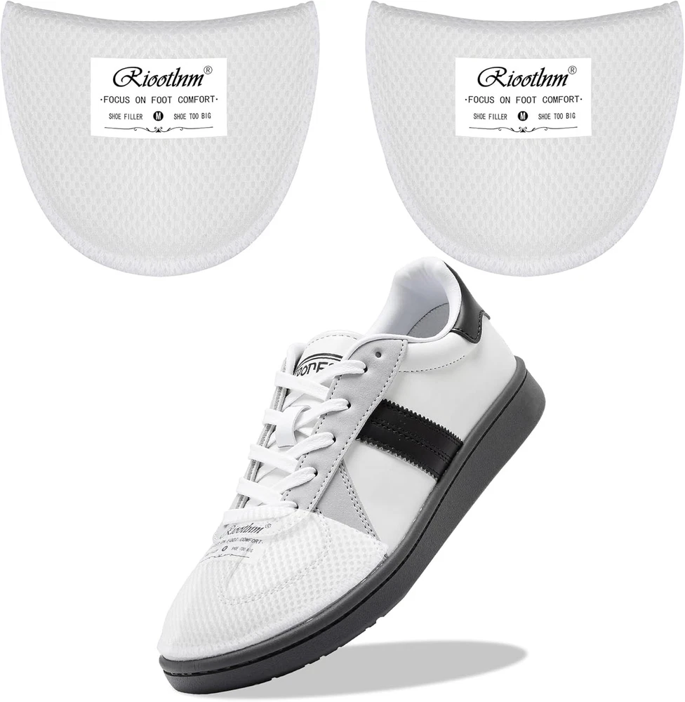 Riootlnm Comfort Shoe Fillers for Too 1Pair(Half Size Bigger), White Product Details Package Dimensions : 5.39 x 4.84 x 0.94 inches; 0.63 ounces Manufacturer : Riootlnm Country of Origin : China Brand: Riootlnm Color: White Product Benefits: Pain Relief Material: Foam Recommended Uses For Product: Shoe COMFORTABLE & BREATHEABLE SHOE FILLER INSERTS--Riootlnm shoe fillers focus on foot comfort, soft material and flexible shape, get rid of the hard shoe inserts, our memory foam shoe fillers are breatheable, provide cushioning and support for your feet all the time, skin friendly, no worry the desigh will harm your feet/toes, and you can wear them walk or running comfortable. SOLVE YOUR SHOE PROBLEM--2 thicknesses options, great ideal to solve your shoe too big problem, the thick( M size) one is great ideal for 1to 2 size bigger shoes, the thin( S size) one is great ideal for half size bigger shoes. These shoe too big inserts relieve your loose shoes, rubbing shoes problem, prevent shoes from slip. Heel pads, heel grips, tongue pads replacement that make shoe smaller, make shoes fit, anti-slip. STAY FIRMLY IN YOUR SHOES--Honeycomb surface design, not only breatheable for your feet, and provide anti-slip function, no worry the shoe pads will move arround, they will stay firmly in your shoes, even if you take off your shoes, they won't move. Fit most of shoes, such as, sneakers, leather shoes, casual shoes, boots, etc.( Please do not use them into your high heel, flat shoes) MORE ADVANTAGES AND HIGH PERFORMANCE--Firstly, they are very breathable and will not add any discomfort to your feet, and secondly,Riootlnm shoe too big inserts are so easy to use, just tuck them in against the toe of your shoe and they will work inside your shoe, they are super memory or flexible and know how big your shoes are to make them fit your feet and make your shoes more stable or firmly. WASHABLE & DURABLE TOE FILLERS--They are made of washable material, so you can easily take them out of your shoes to clean, wait for the sun to dry naturally, and then put them back into your toe of shoes. Long time use material, they can work well even if you wear them for running, walking, fitness, shopping, work, etc, because our design keeps your dear toes from rubbing against the shoe too big inserts, so you don't have to worry about your toes wearing them out .