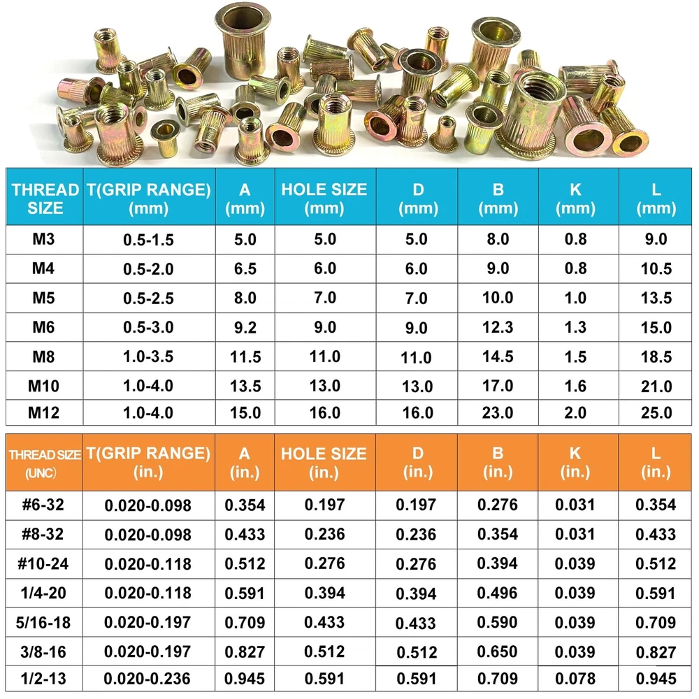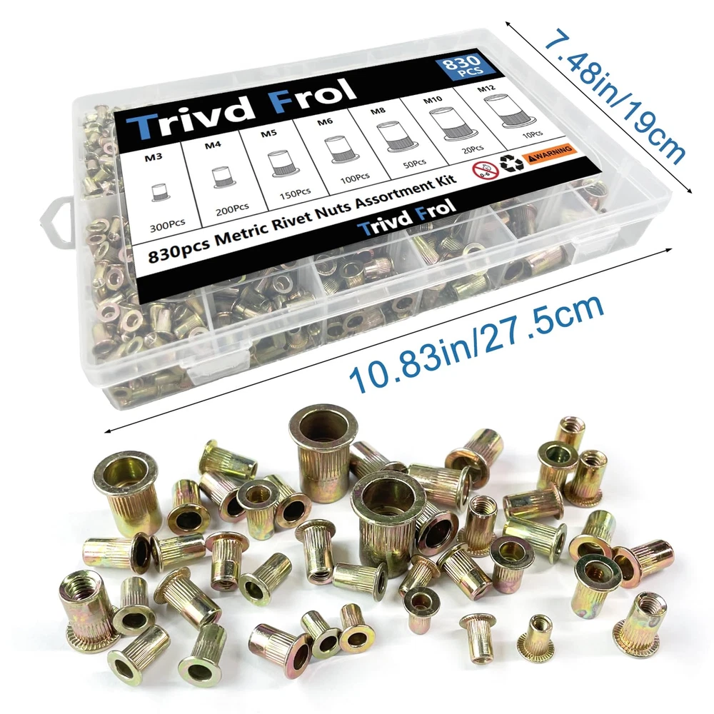 【Specification】 Name: Rivet nut Material: Carbon steel, zinc plated Type: Flat head, Knurled body Package: Durable plastic box 【Warning】 The product doesn’t suitable for children, please keep them away from kids. 【Application】 Perfect for automotive, furniture, decoration and other electrical and industrial products. 【RIVET NUT SIZE】: In this set, we provide 7 size of rivet nut, includes: M3---300pcs, M4---200pcs, M5---150pcs, M6---100pcs, M8---50pcs, M10---20pcs, M12---10pcs, total 830pcs. 【FEATURE】: Head Type: Flat Head; Nuts have a work-hardened surface providing high-strength, load-bearing threads. 【WIDE APPLICATION】: Our rivet nuts are used to provide firm and problem-free attachment for screws and bolts in home improvement and for a wide range of manufacturing including automobiles, aircraft, appliances, furniture, decoration, and more. 【DURABLE QUALITY】: These rivet nuts boast superior strength and offer corrosion-free, rotation-resistant performance and acid resistant thanks to their precision threading and quality construction from galvanized carbon steel.You will no longer worry about them rusting and breaking when installing. 【THICKENE AND CLEARLY-LABELED TOOL BOX】: These nuts kit is lightweight, very convenient to carry. Meanwhile, the transparent storage box had been thickened, more durable and sturdy than others, enough to accommodate all items safely.