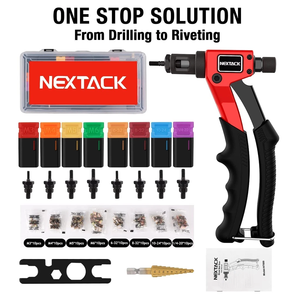 【Compact Design for Tight Space】The 8 inch right angle style make it easy for grab-and-go to solve out-of-reach riveting projects for confined narrow spots. it is ideal solution for small rivnut with single hand riveting, and for bigger rivnut attached like M6 & 1/4-20, it is better to use both hand operating. 【One-Stop-Solution】The nutsert tool kit is packed in a well-organized compartmented case for safe storage and convenient portability. It comes with a step drill bit, 8 universal interchangeable mandrels (4 SAE 6-32, 8-32, 10-24, 1/4-20 and 4 Metric M3, M4, M5, M6), 80 carbon steel threaded nuts (10 for each mandrel), & a professional user manual. 【Built to Last】The threaded insert hand riveter consists of quality steel arm with blacken and heating treatment, aluminum alloy body, and thick non-slip PVC grips. It prevents from corrosion and deformation and prolongs the lifecycle to ensure the strength, durablity and reliablity. 【Easy to Use】The nutsert rivet gun features single hand operation and modular detachable design for easy riveting, mandrels changing and maintenance, rotary knob structure for easy nut loading and releasing. 【Versatile Application】The threaded insert riveter tool kit can help you add attachedment with bolt on working piece like metal, fiberglass in different occasion like van wall, metalworking, railway, aviation, bicycle, off-road, RV and home modification. 【Warm Tips】Please note the mandrels are consumable and may be damaged with uneven pressure and improper use. We have addtional replacement mandrels M3 M4 M5 M6 6-32 8-32 10-24 10-32 1/4-20 here in our store. If any issue during using please message us.