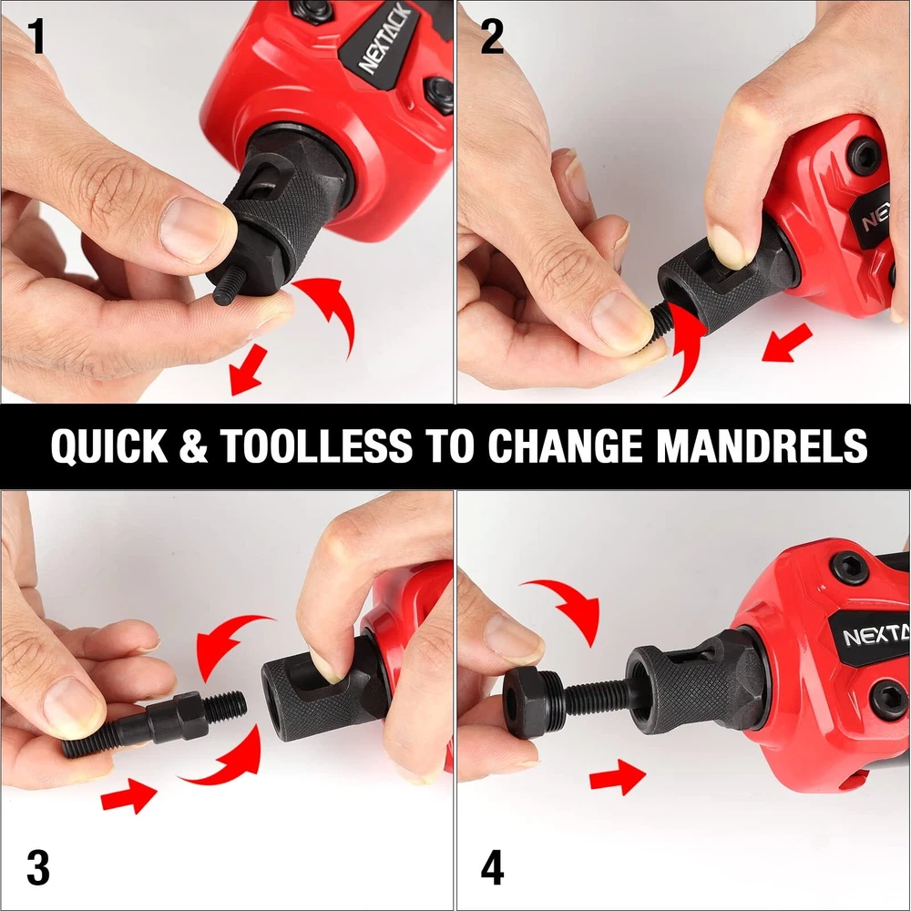 WARM TIPS: it may not fit your rivnut tool, please check the outlook carefully to make sure everything is identified same as the mandrel in your tool before buying. Meanwhile the mandrels are consumable and may be damaged with uneven pressure and improper use. SAE inch 1/4-20 rivet nut tool mandrel & nosepiece kit is forged from high quality chrome alloy steel, including 1pcs 1/4-20 mandrel & nosepiece, 20pcs rivet nuts. The rivnut tool mandrel was design for changing mandrels toolless and effortless. Each kit is packed in a color-coded plastic box labeled with size for easy recognition. Supplemental size for rivet nut gun NT600,NT700 & NT800, also for other brand model 607, 618, 1442 & 1443B. But it may not fit for your tool. please check the outlook carefully. Any questions before or after using, please message us freely