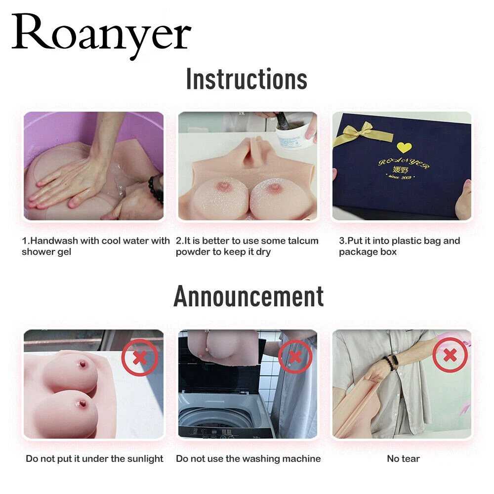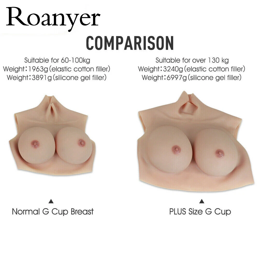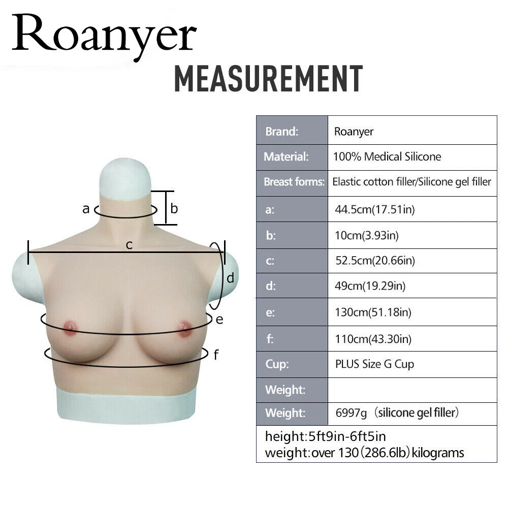 Roanyer Plus G Cup Silicone Breast Form Fake Boobs Drag Queen Crossdresser TG Roanyer silicone breasts are different from conventional silicone breasts. This Huge Cup is suitable for people over 220lb .Roanyer breasts are carefully designed and 100% hand-made to ensure extremely realistic looking and touching. Skin color is natural as real human being with skin texture. Breast shape is more real than tear drop shape.Vest-like design makes the breast very convenient to wear.Bras and glues are not necessary.Low cut dress is not a problem.One could wear them a whole day,feeling comfortable.This is a perfect choice for your female identity and a must part in your female life.Roanyer breast is more than real than ever! NOTE : The Large G cup refers to large measurement, it is not means large G cup size. If you are a large measurement guy, this one is definitely the best choice! Product details ♦Brand:Roanyer ♦Style:Breast Forms ♦Breast filler:Elastic cotton filler/Silicone gel filler ♦Material:100% medical level silicone,can be extended 6 times than original item ♦Cup:Large Size G cup ♦Color:Caucasian/Natural/Tan/Dark ♦Breast size(upper chest/lower chest):58.18in/43.3in ♦Neck circumference:17.51in ♦Intended for:Crossdresser,Transgender,Coser ♦Garment care:Hand wash only ♦Number in pack:1 set ♦Net weight of elastic cotton filler: 7.36lb ♦Net weight of silicone gel filler:15.87lb ♦Suitable weight:Over 220lb ♦Suitable height:5ft3in-5ft11in Neck part Roanyer breast is designed with long neck part to cover men’s Adam’s apple.We make the neck part long enough for all people.You may cut the neck part yourself according to your own neck length and shape.A necklace or silk scarf will be perfect choice to hide the edge. Instructions ♦Clean the product with water or shampoo before first try on.Dry it naturally or with tissue.Don't hang the breast or press it too hard.Don't use any washing machine or dry machine. ♦Be especially carefully for your first try on.Don't stretch it too hard.Don't stretch the edge part.Edge part is very vulnerable.Always handle the product gently and patiently.Be careful about your nails.Nails or sharp tools will hurt the breast. ♦Clean the product and store it in a box or bag.Avoid pressure,stretching or folding for storage. ♦Silicone may give off some oil in the beginning.Silicone oil will disappear after a while.Applying baby powder will help to smooth your body and also the product. Payment It should be completed within 7 days of auction closing,or Unpaid Dispute will be filed. If you can not pay in time ,please do not hesitate to contact with us . International Buyers – Please Note: Import duties, taxes and charges are not included in the item price or shipping charges. These charges are the buyer's responsibility. Please check with your country's customs office to determine what these additional costs will be prior to bidding / buying. Return & Refund The picture is tight for reference, different body type.the effect will not be the same,If you have any question about our product & service, please send email to us and offer us some pictures or vedio. The products must be returned in original, unworn, re-sellable condition.We can gurantee money back on all acceptable returns. Delivery details If the product is sent from China ,we all send it by the expedited shipping way UPS/Fedex/TNT to all over the world.5-12 working days you will receieve it. Every product is hand made with many procedures by our artists.Tan and Dark colors needs 3 days to prepare the product after your payment We ONLY ship to confirmed shipping address for all payment on ebay. Before you pay, please Make sure your address in ebay matches the address you would like us to ship to. We will offer you tracking number when we have. We will not reveal what is really inside on the package. About us We are a professional crossdresser products seller and manufacturer. Established in 2009, we aim at becoming a creative manufacturer and a most considerate seller, proving the best qualified products for crossdressers all around the world. Contact us If you have any questions ,please feel free to contact us at any time via ebay or email ,we respond you ASAP within 24 hours. On 30-Sep-21 at 12:34:05 BST, seller added the following information: On 30-Nov-2023 at 20:02:44 GMT, seller added the following information: