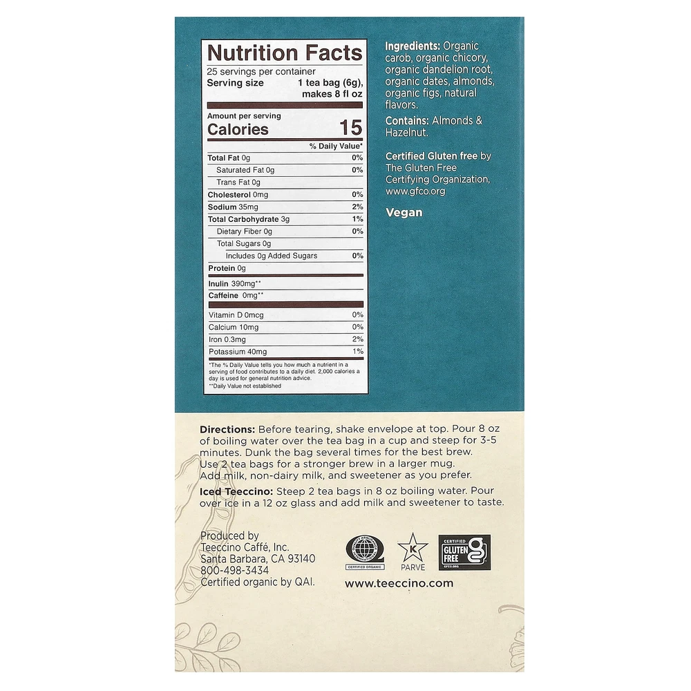 Dandelion Blend 3x More Herbs 87% Organic Made with Organic Herbs Prebiotic Acid Free Kosher Parve Certified Gluten Free Vegan Certified Organic by QAI Rich. Delicious. Detox. Whether you're a tea or coffee drinker, you'll love Teeccino's satisfying, robust flavor that fans describe as smoother, richer, and creamier than coffee. The secret? French chicory, the roasted root often added to coffee, blended with dandelion, the renowned detox herb, and Spanish carob famed for its chocolatey flavor. Enriched with California's almonds, dates, and figs, Teeccino makes a delicious cup of tea.. Our eBay Store About Us Contact Us Add to Favorite Sellers Nutrition Facts Serving Size: 1 tea bag (6 g), makes 8 fl oz Servings Per Container: 25 Amount Per Serving %Daily Value* Calories 15 Total Fat 0 g 0% Saturated Fat 0 g 0% Trans Fat 0 g Cholesterol 0 mg 0% Sodium 35 mg 2% Total Carbohydrate 3 g 1% Dietary Fiber 0 g 0% Total Sugars 0 g Includes 0 g Added Sugars 0% Protein 0 g Inulin 390 mg ** Caffeine 0 mg ** Vitamin D 0 mcg 0% Calcium 10 mg 0% Iron 0.3 mg 2% Potassium 40 mg 1% *The % Daily Value tells you how much a nutrient in a serving of food contributes to a daily diet. 2,000 calories a day is used for general nutrition advice. **Daily Value not established. Expiration Date: 05/21/2027 Disclaimer: Our receiving department does its best to verify and then enter the correct expiration dates for all incoming products. However, discrepancies do occur from time to time. This being said, the exceptionally high turnover at iHerb ensures that our inventory is among the freshest in the industry. Teeccino, Roasted Herbal Tea, Dandelion Caramel Nut, Caffeine Free, 25 Tea Bags, 5.3 oz (150 g) DESCRIPTION: Dandelion Blend 3x More Herbs 87% Organic Made with Organic Herbs Prebiotic Acid Free Kosher Parve Certified Gluten Free Vegan Certified Organic by QAI Rich. Delicious. Detox. Whether you're a tea or coffee drinker, you'll love Teeccino's satisfying, robust flavor that fans describe as smoother, richer, and creamier than coffee. The secret? French chicory, the roasted root often added to coffee, blended with dandelion, the renowned detox herb, and Spanish carob famed for its chocolatey flavor. Enriched with California's almonds, dates, and figs, Teeccino makes a delicious cup of tea...or is it coffee? We'll let you decide! 100% naturally caffeine free Natural energy boost - from nutrients, not stimulants Acid free - helps restore alkaline balance Heart - healthy potassium - for optimal performance Prebiotic - Inulin, a soluble fiber in chicory & dandelion roots, supports gut health to improve digestion, elimination and the immune system More Health Benefits in Every Cup A swirl of sweet and creamy caramel against roasted dandelion and chicory roots, enhanced by dates, figs and almonds. 6 g tea bag = 3X more herbs = Bold flavor and more health benefits! SUGGESTED USE: Enjoy Teeccino Many Ways Hot Low calorie dessert Energizing smoothie base Iced Before tearing, shake envelope at top. Pour 8 oz of boiling water over the tea bag in a cup and steep for 3-5 minutes. Dunk the bag several times for the best brew. Use 2 tea bags for a stronger brew in a larger mug. Add milk, non-dairy milk, and sweetener as you prefer. Iced Teeccino: Steep 2 tea bags in 8 oz boiling water. Pour over ice in a 12 oz glass and add milk and sweetener to taste. INGREDIENTS: Organic carob, organic chicory, organic dandelion root, organic dates, almonds, organic figs, natural flavors. Contains: Almonds & hazelnut. WARNINGS: 10.69