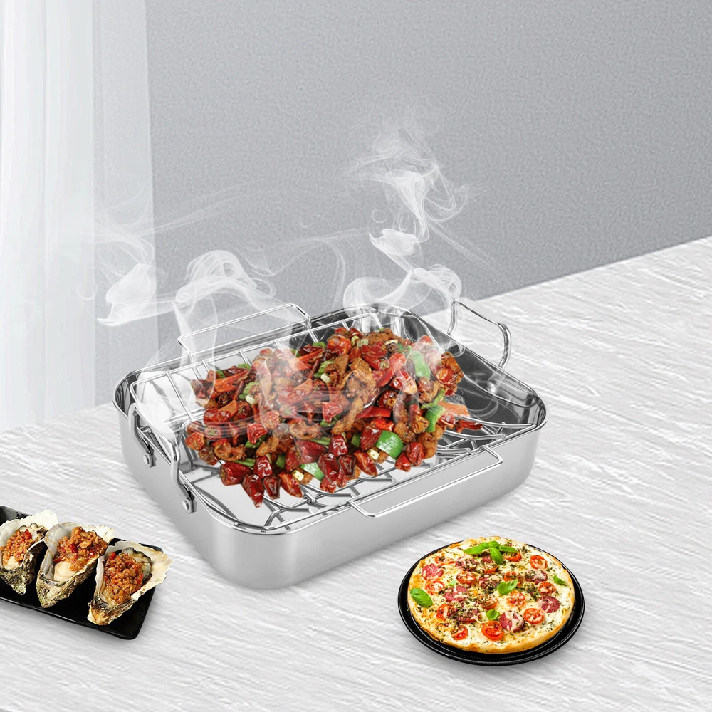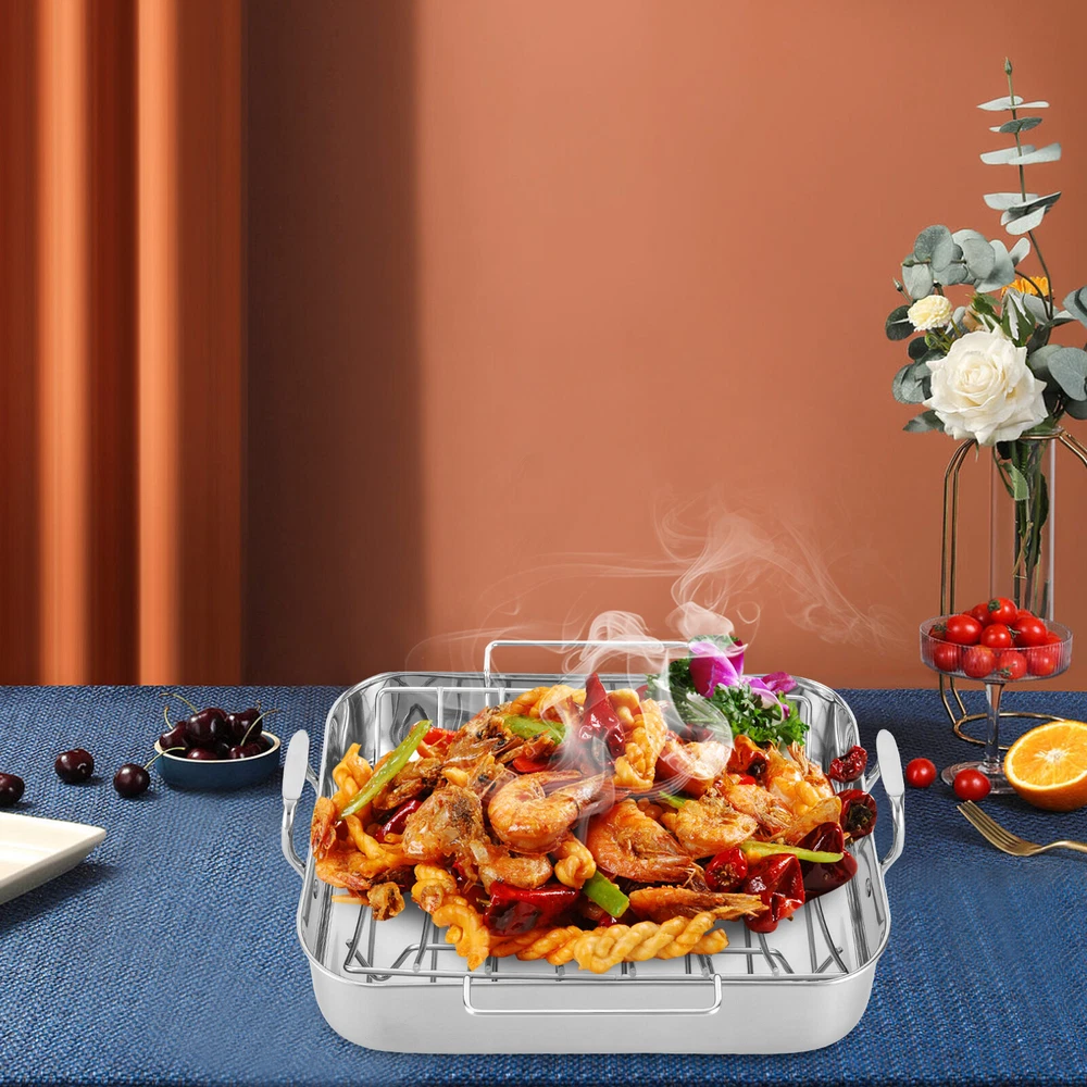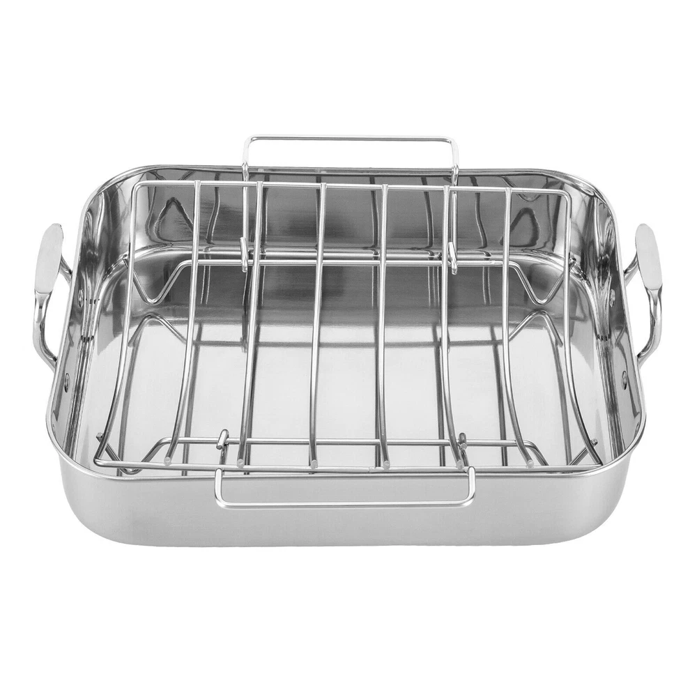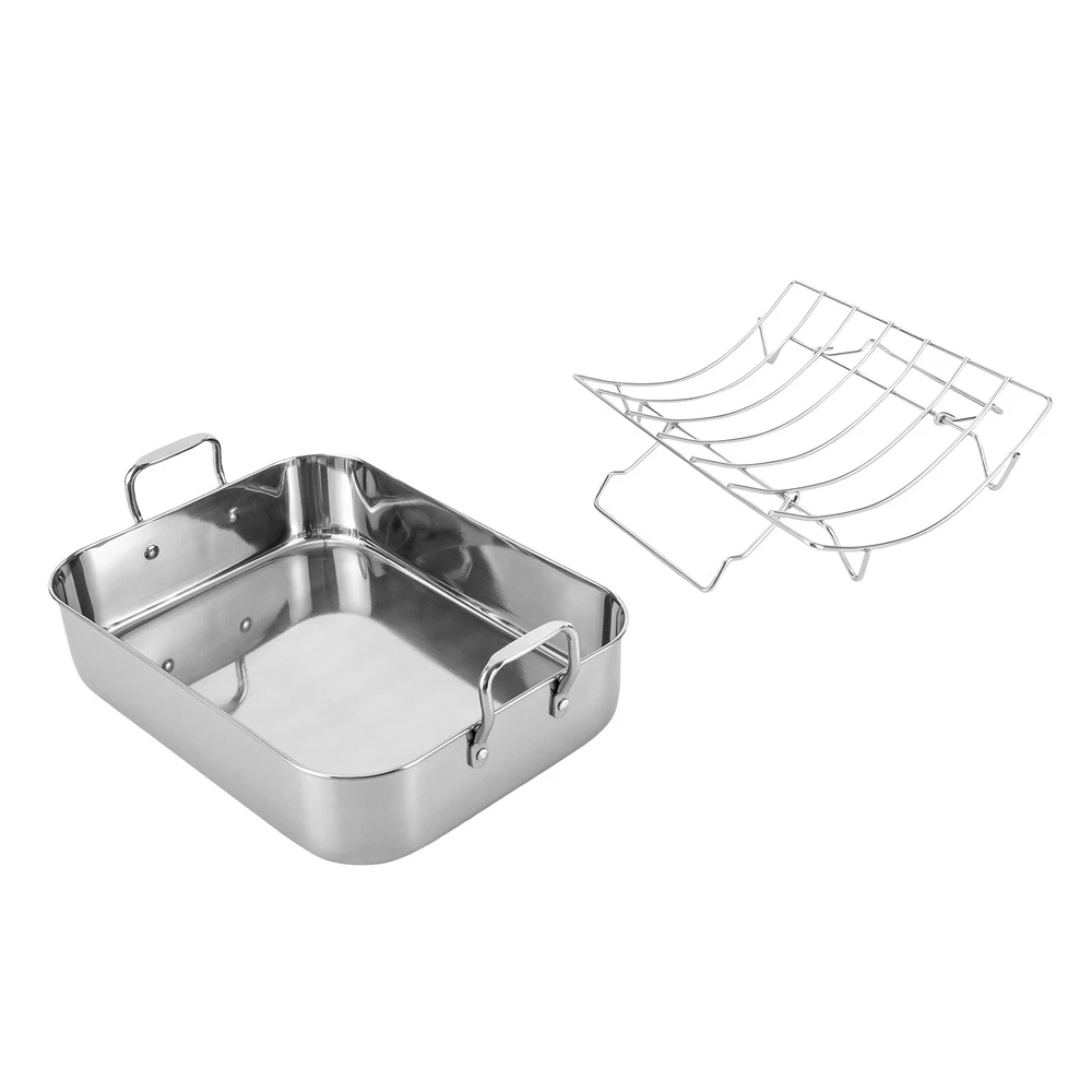 Specification Color: Silver Shape: Rectangular Material: Stainless Steel, Iron Process: Polished, Chrome Plated Maximum Safe Temperature: 375℃/707℉ Assembly Required: No Gross Weight: 2.5kg/ 5.51 lbs Net Weight: 2.3kg/ 5.07 lbs Package Size: 46*33*12 cm/18.11*12.99*4.72 in Rack Size: 35*29*8.4cm/13.8*11.4*3.3in Rack Feet Height: 2.5cm/1in Rack Handle Length: 16.5cm/6.5in Product Base Size(L*W): 40.6*30.5cm/16*12in Product Opening Size(L*W): 42*31.5cm/16.5*12.4in Product Total Height: 14cm/5.6in Pan Height: 9.4cm/3.7in Handle Height: 4.6cm/1.8in Distance Between Handles: 44.5cm/17.5in Package Included 1 * Stainless Steel Roasting Pan 1 * Rack Roasting Pan with Rack 16.5 Inch Stainless Steel Rectangular Turkey Roaster Pan *Description of yybshop02*** *Description of yybshop02** Payment Delivery details Terms of sales About us Contact us Payment We accept ebay payment 。 Fees such as import duties, taxes are not included in the item price or shipping costs. These charges are the buyer's responsibility. Delivery details Shipping: 2-9 working days to: USA Terms of sales We maintain high standards of excellence and strive for hundred percent customer satisfaction. Feedback is very important to us. We hope that you contact us immediately before you give neutral or negative feedback, so that we can address your concerns. It is impossible to address issues if we do not know about them! About us Your satis faction is our ultimate goal. We work hard to earn your trust and future business. Our certified technicians have tested each item before shipping. The unit comes with 1 year limited warranty on all manufacturing defects. a) If you receive a defective item, you may return it or ask for a discount. Please contact us within 14 days after you receive the package. b) What you returned must be intact and in its original packaging as re? u. Customer is responsible for shipping costs of the returned item. c) We will cover the cost of shipping back t with the shipping rate indicated in the registration page. We will send you a new unit or refund the full payment you paid. Thank you. Contact us Business Hour Business Hour: Monday To Friday: 8:30 AM to 5:00 PM (Beijing China time) Due to time zones, our reply to your questions may not be immediately. But within above working time, we will reply your email within 24 hours. If it's non-workdays, please kindly be patient and wait till Monday. Please contact us with ebay message. Please feel free to contact us if you have any questions. Monday To Friday: 8:30 AM to 5:00 PM (Beijing China time) Due to time zones, our reply to your questions may not be immediately. But within above working time, we will reply your email within 24 hours. If it's non-workdays, please kindly be patient and wait till Monday. Please contact us with ebay message. Please feel free to contact us if you have any questions. 1Feature: Exquisite appearance,Durable material Material Stainless Steel Set Includes Rack Color Silver Type Roasting Pan Features Double Handle Shape Rectangle Item Length 16.5 in Stove Type Compatibility Electric EAN dose not apply UPC dose not apply Brand SENDERPICK MPN Does not apply