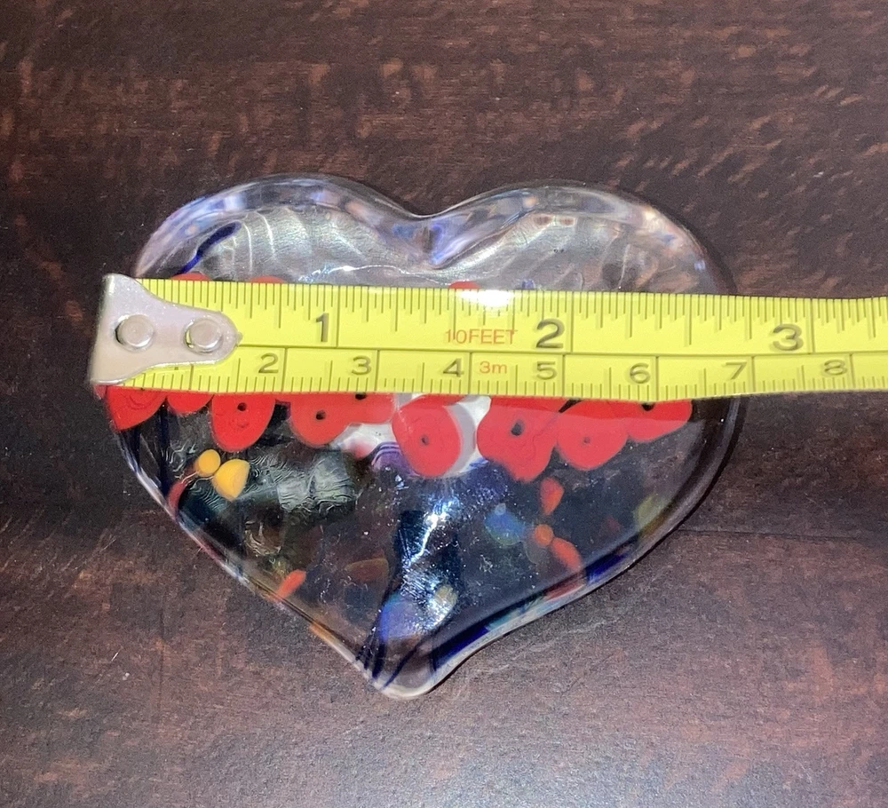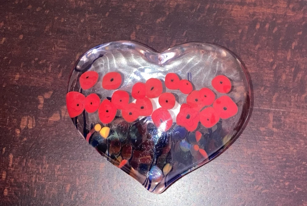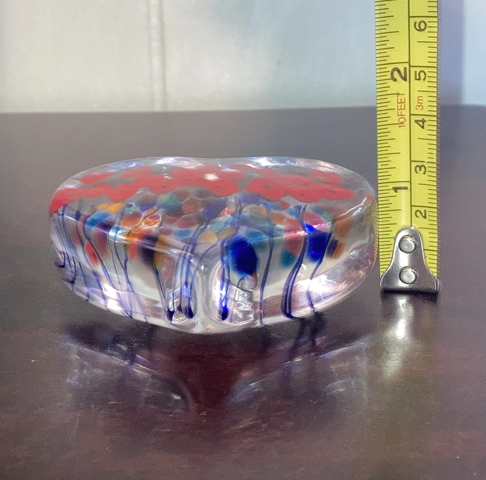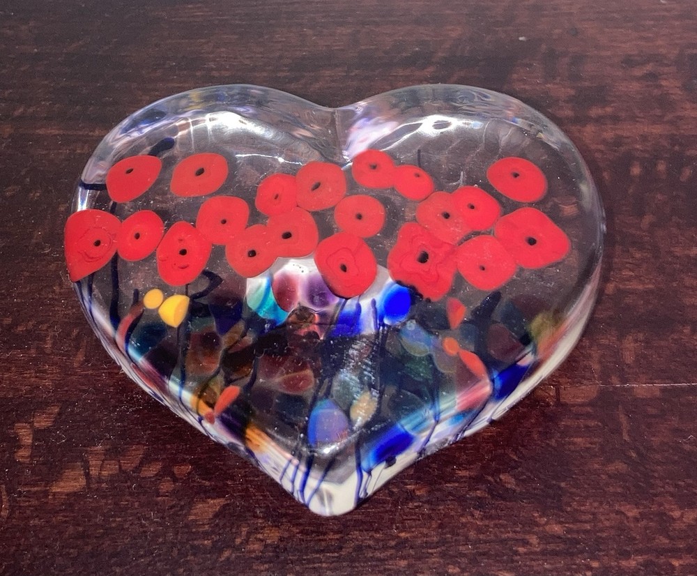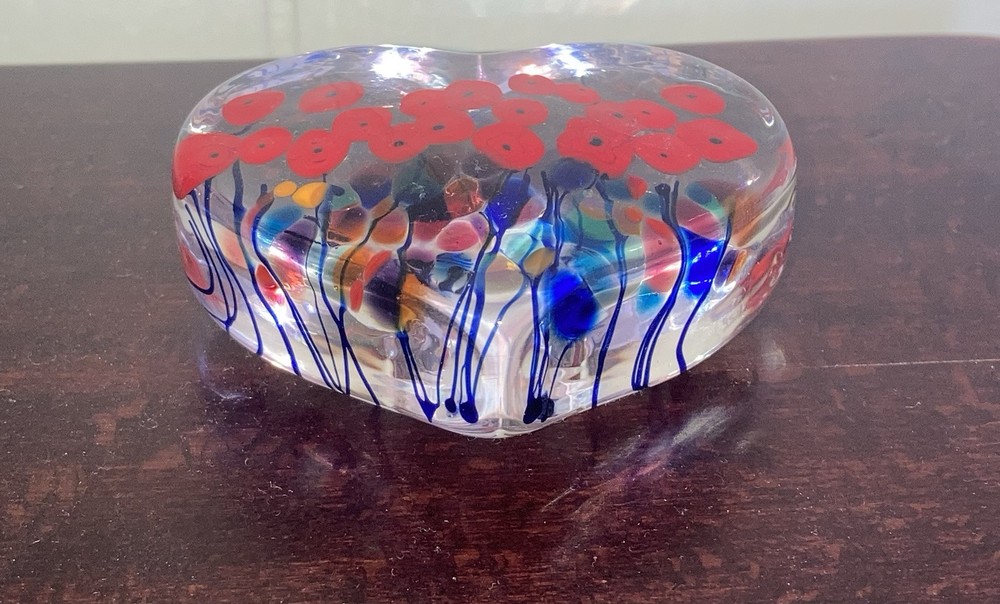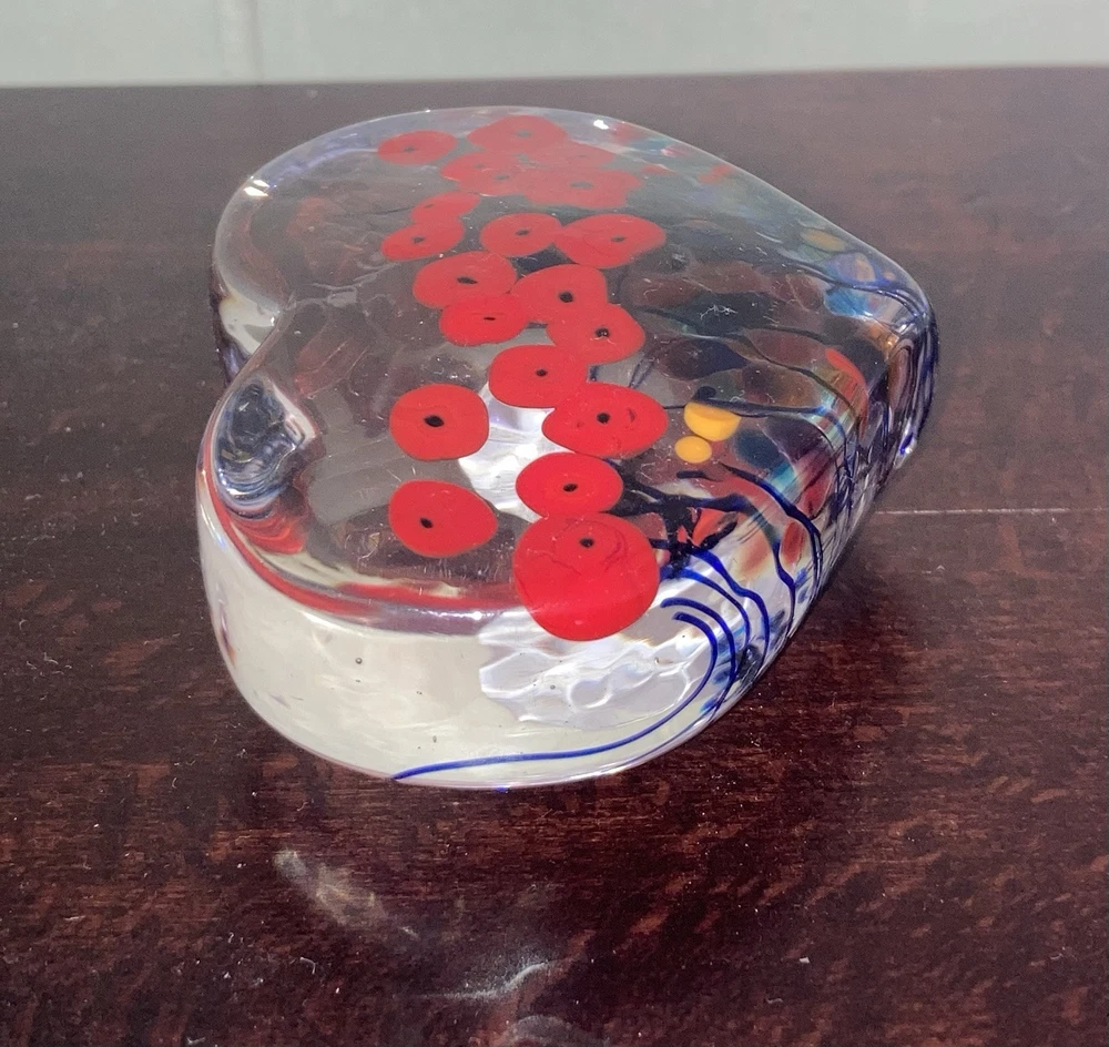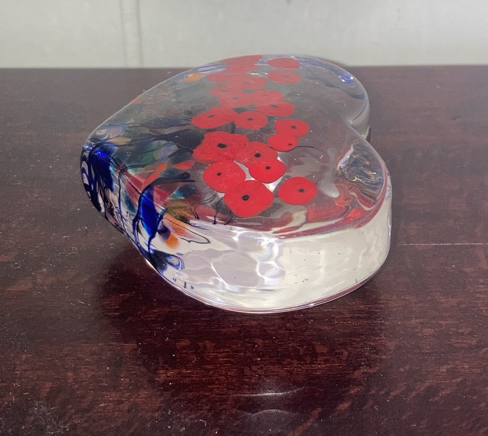 This Robert Held paperweight features a heart shape and is made of multicolored glass, showcasing a contemporary design with California Poppies pattern. Hand-blown in Canada in the late 20th century, this vintage piece is signed by the artist “Held” and is part of the California Poppies product line. The glossy finish and decorative nature make it a charming addition to any collection of art glass paperweights.