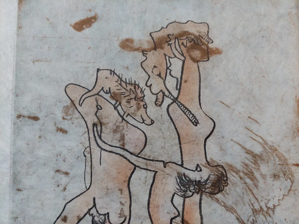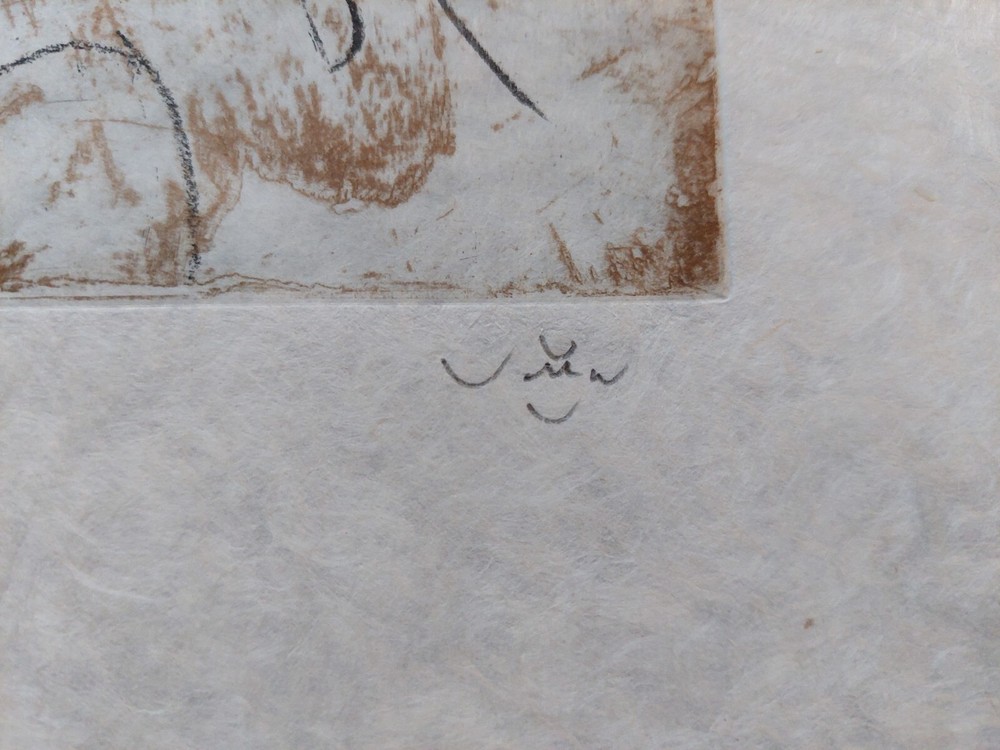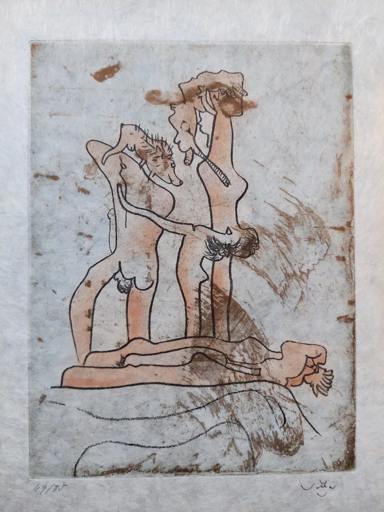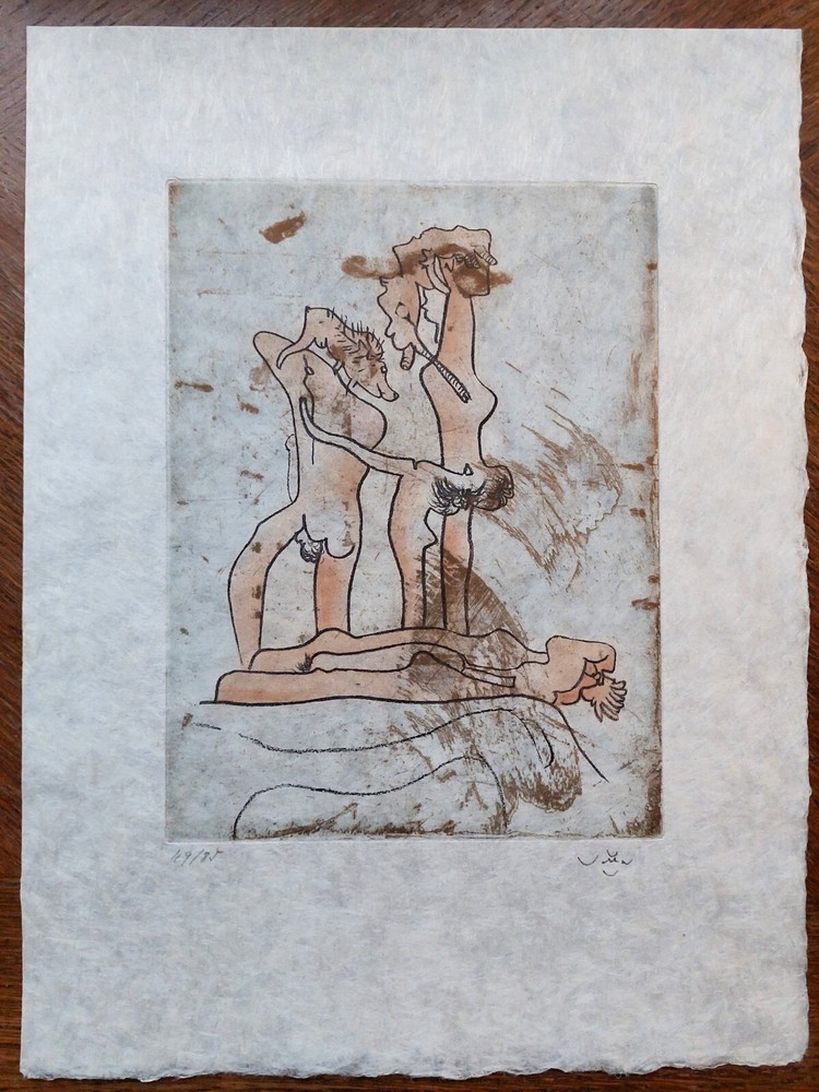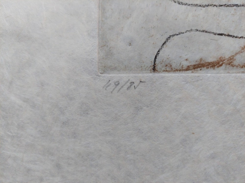 Roberto MATTA - "FMR" Original color etching with aquatint on Japon paper. Signed and numbered 49/85 Edition: Paris, Georges Visat, 1971 Total dimensions 38 x 29 cm. Etching 24 x 18 cm. REFERENCE: MATTA. Catalog raisonne, editions sonet - visat. No. 260 Very good condition. Ship worldwide with tracking and insured shipping. ** Roberto Sebastián Antonio Matta Echaurren (1911 – 2002), better known as Roberto Matta, was one of Chile's best-known painters and a seminal figure in 20th century abstract expressionist and surrealist art. Roberto Matta’s phantasmagorical, large-scale paintings bridged the figurative dreamscapes of Surrealism and the emotive gestures of Abstract Expressionism. The artist’s vivid, imposing canvases feature a melange of geometric and biomorphic shapes that occasionally cohere into representational forms. Matta often employed multiple perspectives to keep his compositions fluid and dynamic, and his style influenced artists including Jackson Pollock and Robert Motherwell. He studied architecture and interior design in his native Chile, then developed his signature style on trips to Europe and the United States, during which he met artists such as Arshile Gorky and Salvador Dalí. Matta’s work has been exhibited widely in cities including New York, London, Santiago, Paris, Berlin, Tokyo, and Rome and belongs in the collections of the Art Institute of Chicago, the Metropolitan Museum of Art, the Tate, the Guggenheim Museum, and Moderna Museet, among many others.