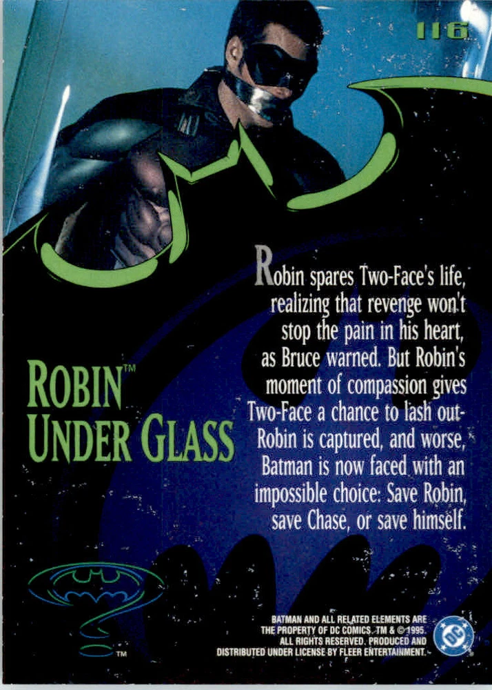 Player/Athlete: Robin Under Glass Type: Non-Sport Trading Card Year Manufactured: 1995 Autographed: No Set: 1995 Ultra Batman Forever Franchise: NON_SPORT Card Number: 116 Season: 1995 Graded: No
