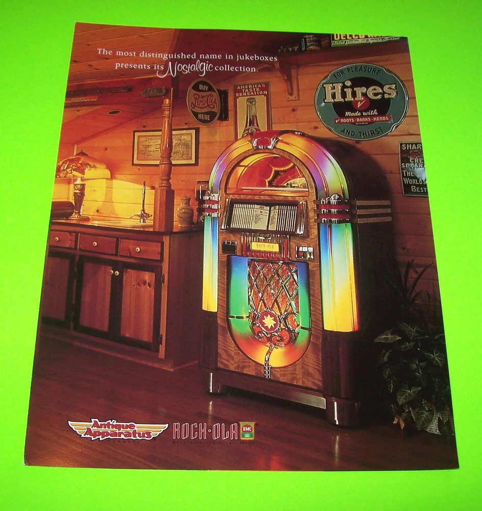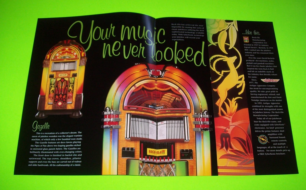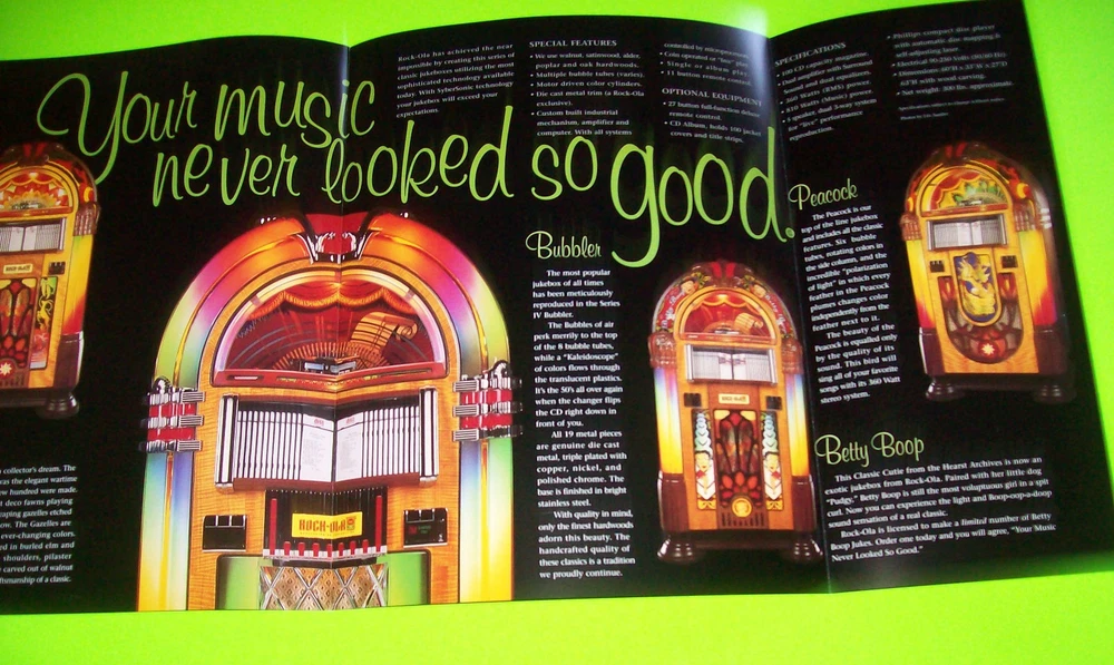 Rock Ola Jukebox FLYER Original 1997 NOS Phonograph Betty Boop Peacock Bubbler Original never circulated new old stock paper promo sales flyer. Four sided foldout artwork sheet with additional half panel. Flyers are paper promotional advertising art print sheets made for coin operated amusement arcade games. Also called a circular, brochure, pamphlet, or flier. All are single sheets unless noted otherwise. If there is artwork on the back side it will be shown. Size is 8.5" X 11". Perfect for framing. Makes great wall art for the man cave or a unique gift idea. Sheet protector included with each flyer sold. Orders are shipped with care. More jukebox, pinball, slot machine, and arcade game items for sale in our store. SHIPPING Bundle and save by using cart and making single payment. International buyers are responsible for any import fees/taxes. ABOUT US Seller of vintage collectibles, gifts, advertising, artwork, original pinball flyers, vinyl records, video arcade flyers, pinball machine translites, game manuals, score cards, magazines, antique Halloween and holiday postcards, Christmas items, super hero memorabilia, horror themed art. Any questions about this item please just ask.