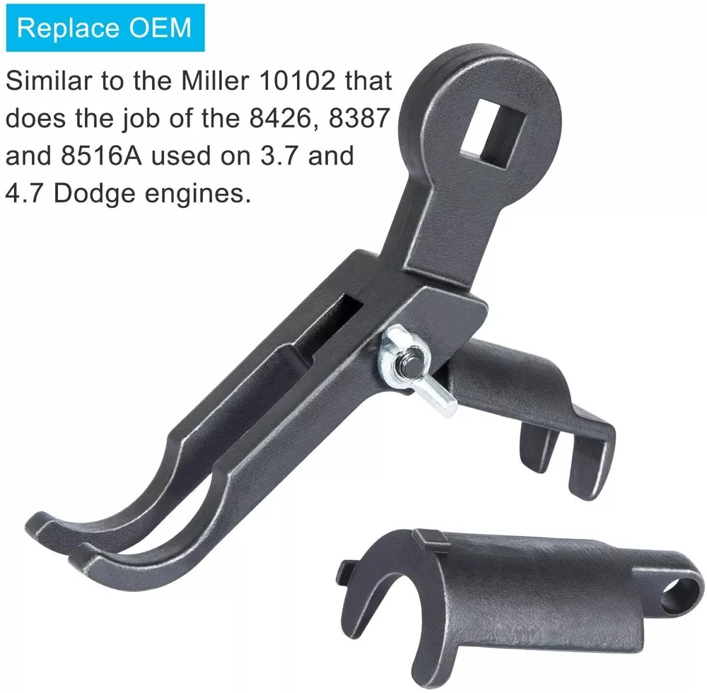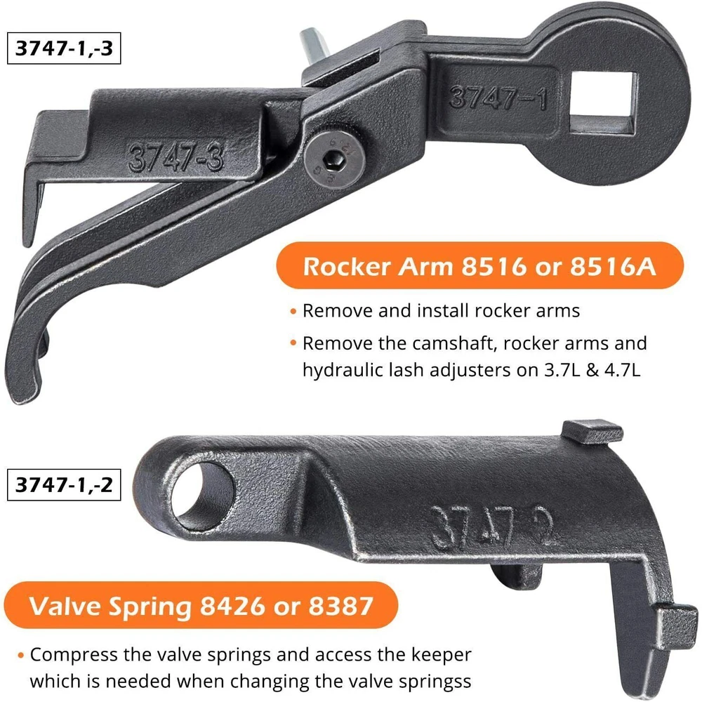 Great Compatibility — Fits for Dodge, Jeep, Chrysler 3.7L and 4.7L engines 1999-2003. This combination tool is similar but stronger than the originals. Superior Quality — Premium grade CNC machined heavy duty steel with black anodized, durability, anti-corrosion and anti-rust, high precision and hardness to provide a much longer service life. Upgrade Design — Specialty used to compress the valve springs and access the keeper which is needed when changing the valve springs. Also can be switched over to the rocker arm remover to remove the camshaft, rocker arms and hydraulic lash adjusters on 3.7L & 4.7L. Easier Work — Replacement for Miller 8426, 8387, 8516A and 10102. Use of this tool is safely done without damage to the camshaft or camshaft lobes. Product Description Valve Spring Tool (3747-1,3747-2) Replacement for Miller 8426 and 8387. Remove and install valve springs safely without damage to the camshaft or camshaft lobes. Compress the valve springs and access the keeper, which is needed when changing the valve springs This special valve spring compressor is used with a 3/8" breaker bar to service valve springs in 4.7 and 3.7 Liter Engines. Rocker Arm Remover Installer (3747-1, 3747-3) Replacement for Miller 8516A or original part 8516. Remove and install rocker arms safely without damage to the camshaft or camshaft lobes Remove the camshaft, rocker arms and hydraulic lash adjusters on 3.7 and 4.7 Liter engines 1999-2013. 8516A Rocker Arm Remover 2006 (Ram Truck, Durango, Liberty, Dakota, Grand Cherokee, Commander) - Systems (9 - Engine, 3.7L, 9 - Engine, 4.7L) 2007 (Ram Truck, Durango, Aspen, Nitro, Liberty, Dakota, Grand Cherokee, Commander) - Systems (9 - Engine, 3.7L, 9 - Engine, 4.7L) 2008 (Ram Truck, Durango, Aspen, Nitro, Liberty, Dakota, Grand Cherokee, Commander) - Systems (9 - Engine, 3.7L, 9 - Engine, 4.7L) 2009 (Ram Truck 1500, Durango, Aspen, Nitro, Liberty, Dakota, Grand Cherokee, Commander) - Systems (9 - Engine, 3.7L, 9 - Engine, 4.7L) 2010 (Ram Truck 1500, Nitro, Liberty, Dakota, Grand Cherokee, Commander) - Systems (9 - Engine, 3.7L, 9 - Engine, 4.7L) 2011 (Ram Truck 1500, Nitro, Liberty, Dakota) - Systems (9 - Engine, 3.7L, 9 - Engine, 4.7L) 2012 (Ram Truck 1500, Liberty) - Systems (9 - Engine, 3.7L, 9 - Engine, 4.7L) 2013 (Ram Truck 1500) - Systems (9 - Engine, 4.7L) 8426 Valve Spring Compressor 2004-2009 Dodge Durango 3.7, 4.7 Engine 2005-2011 Dodge Dakota 3.7, 4.7 Engine 2005-2014 Jeep Grand Cherokee 3.7, 4.7 Engine 2005-2010 Jeep Commander 3.7, 4.7 Engine 2007-2009 Dodge Aspen 3.7, 4.7 Engine 8426 Valve Spring Compressor 2006 (HB, ND, WK, XK) - Systems (9 - Engine, 3.7L) 2007 (HB, HG, ND, WK, XK) - Systems (9 - Engine, 3.7L, 9 - Engine, 4.7L) 2008 (HB, HG, ND, WK, XK) - Systems (9 - Engine, 3.7L, 9 - Engine, 4.7L) 2009 (HB, HG, ND, WK, XK) - Systems (9 - Engine, 3.7L, 9 - Engine, 4.7L) 2010 (ND, WK, XK) - Systems (9 - Engine, 3.7L) 2011 (ND) - Systems (9 - Engine, 3.7L) 8387 Valve Spring Compressor 2006 (DR, HB, KJ, ND) - Systems (9 - Engine, 3.7L, 9 - Engine, 4.7L) 2007 (DR, KA, KJ) - Systems (9 - Engine, 3.7L) 2008 (DR, KA, KK) - Systems (9 - Engine, 3.7L) 2009 (DS, KA, KK) - Systems (9 - Engine, 3.7L) 2010 (DS, KA, KK) - Systems (9 - Engine, 3.7L) 2011 (DS, KA, KK) - Systems (9 - Engine, 3.7L) 2012 (DS, KK) - Systems (9 - Engine, 3.7L)
