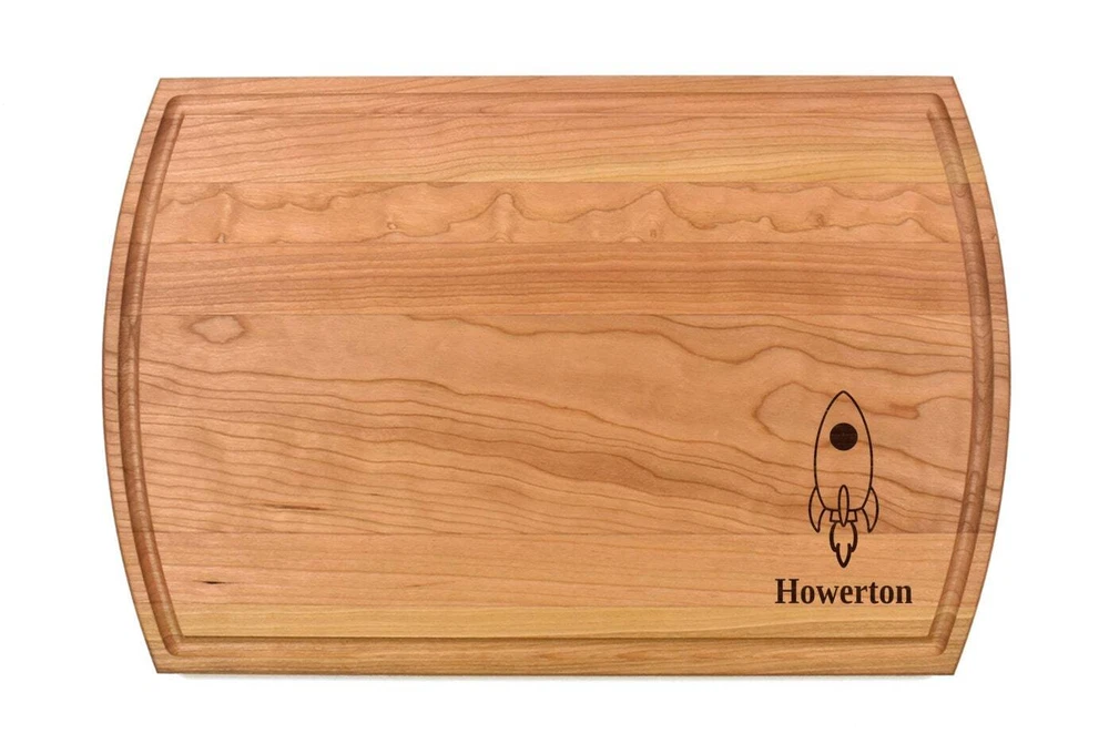 Design: Personalized Rocket Cutting Board or Charcuterie Serving Tray All items ship via USPS - please make sure your address is correct :-) Whether used as a charcuterie serving tray for snacks or cutting board, our bamboo, walnut and cherry custom boards are the perfect addition for the home and make the perfect gift for your loved one celebrating a birthday, anniversary, new home, wedding, etc! *** FEATURES *** • SIZES: We have multiple styles and sizes available. To see our current sizes available, click the drop-down menu. The photo slide contains a photo showing each side by side. Please note, the board with the juice groove only has the groove on the front side of the board. • THICKNESS: Bamboo Boards - Approximately 1/2" Thick; Walnut & Cherry Boards - Approximately 3/4” Thick • UNIQUE: Every board is unique with the grain and coloring varying throughout - no board is the same! • CARE INSTRUCTIONS: Hand wash only with warm water. Do not soak. Please apply mineral oil throughout the board’s life. • PERSONALIZATION/CUSTIMIZATION: Do you want the text placed differently on the board? Please don’t hesitate to contact us. All personalization notes can be entered in the personalization box when checking out. • SHIPPING: All cutting boards ship within 2 to 5 business days. • WHOLESALE ORDERS: Please don’t hesitate to contact us for information about wholesale orders. Processing times for larger orders may change. • NOTE: Colors can vary a bit on different monitors and screens. Any props included in photos are not included. Please be sure to double-check your address to make sure it is accurate for USPS delivery. If a package is returned to us due to an invalid address, the buyer is responsible for all additional shipping charges. We appreciate you supporting small business – best wishes! For items ordered with simple edits, we do not send proofs since the layout doesn't change from the example(s). However, in the event there are requests that change the layout from the example(s), we do send proofs for approval before making the product. If you'd like a proof before we make the product, please note so in the personalization box.
