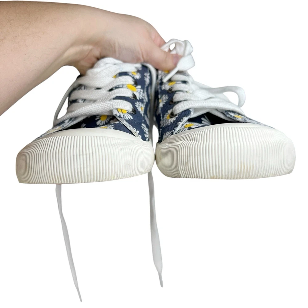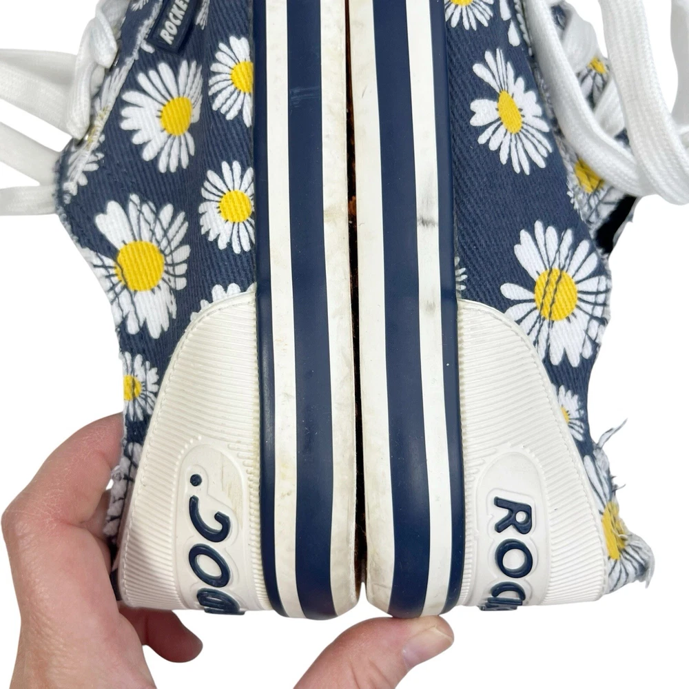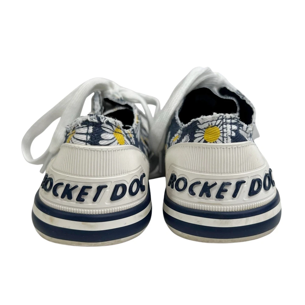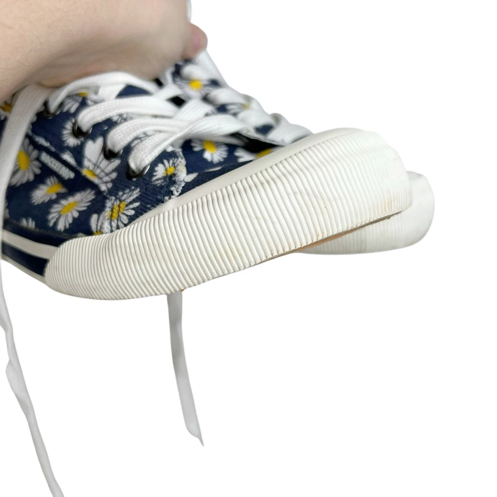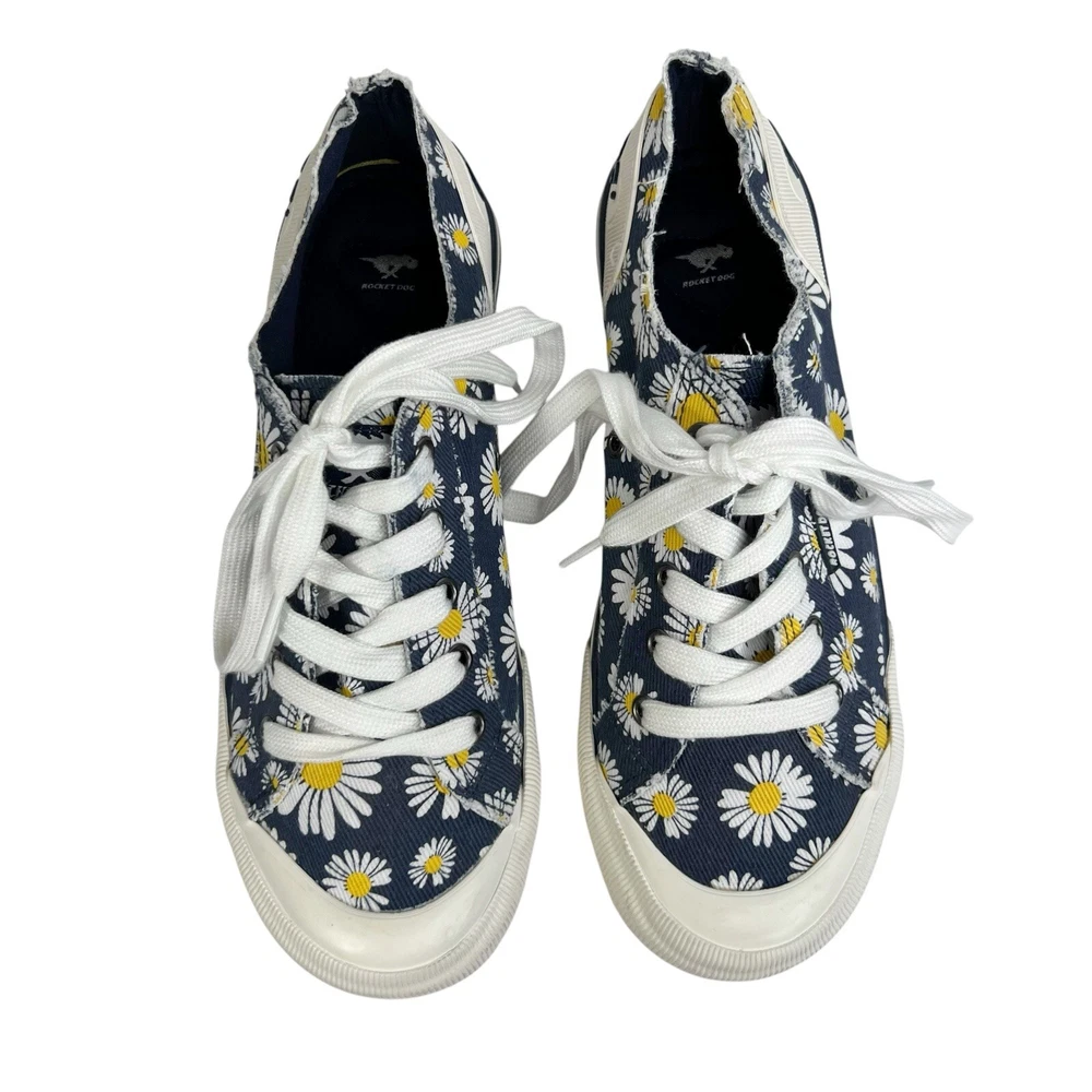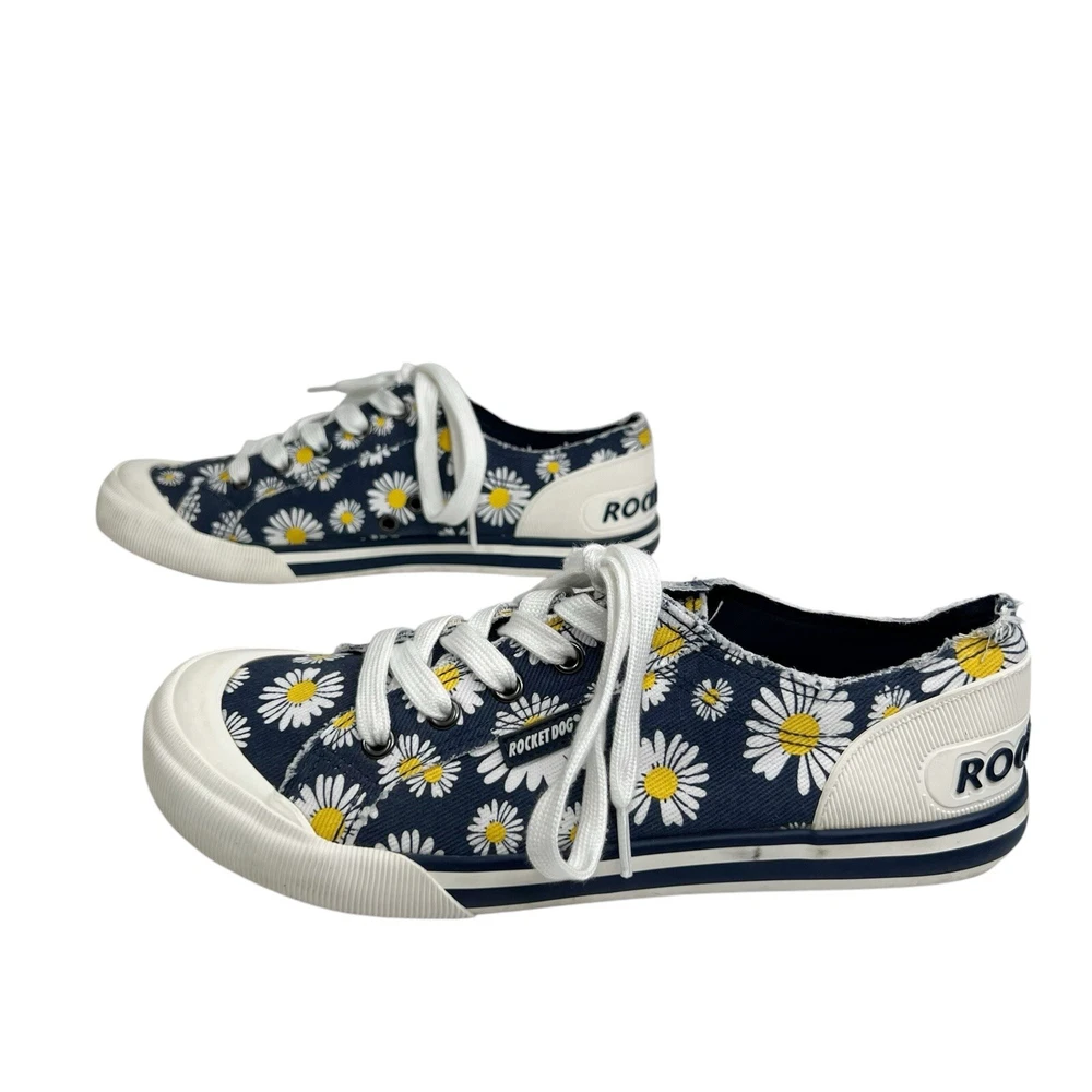 Rocket Dog Jazzin Navy Daisy Plush Foam Sneakers Shoes. Size 9. In gently preowned condition with some scuffing to the sides, wear to the soles and faint color transfer on the laces. Colorful daisy print with a navy blue background. Low top, lace up, cotton upper, rubber toe cap, Rocket Dog logo heel cap and plush foam comfort insole.