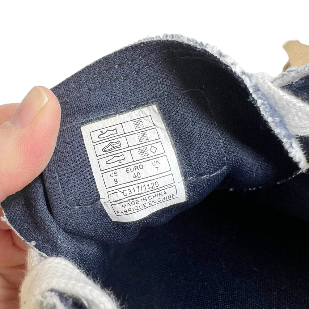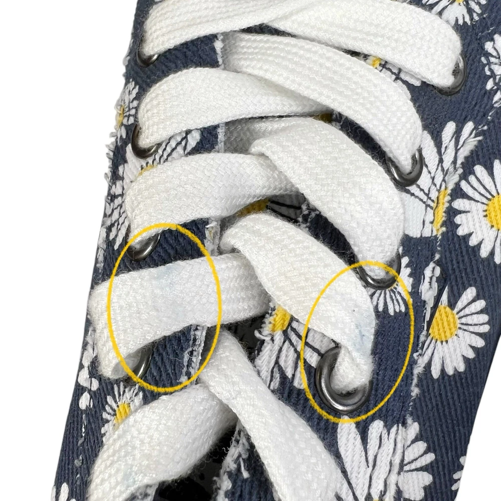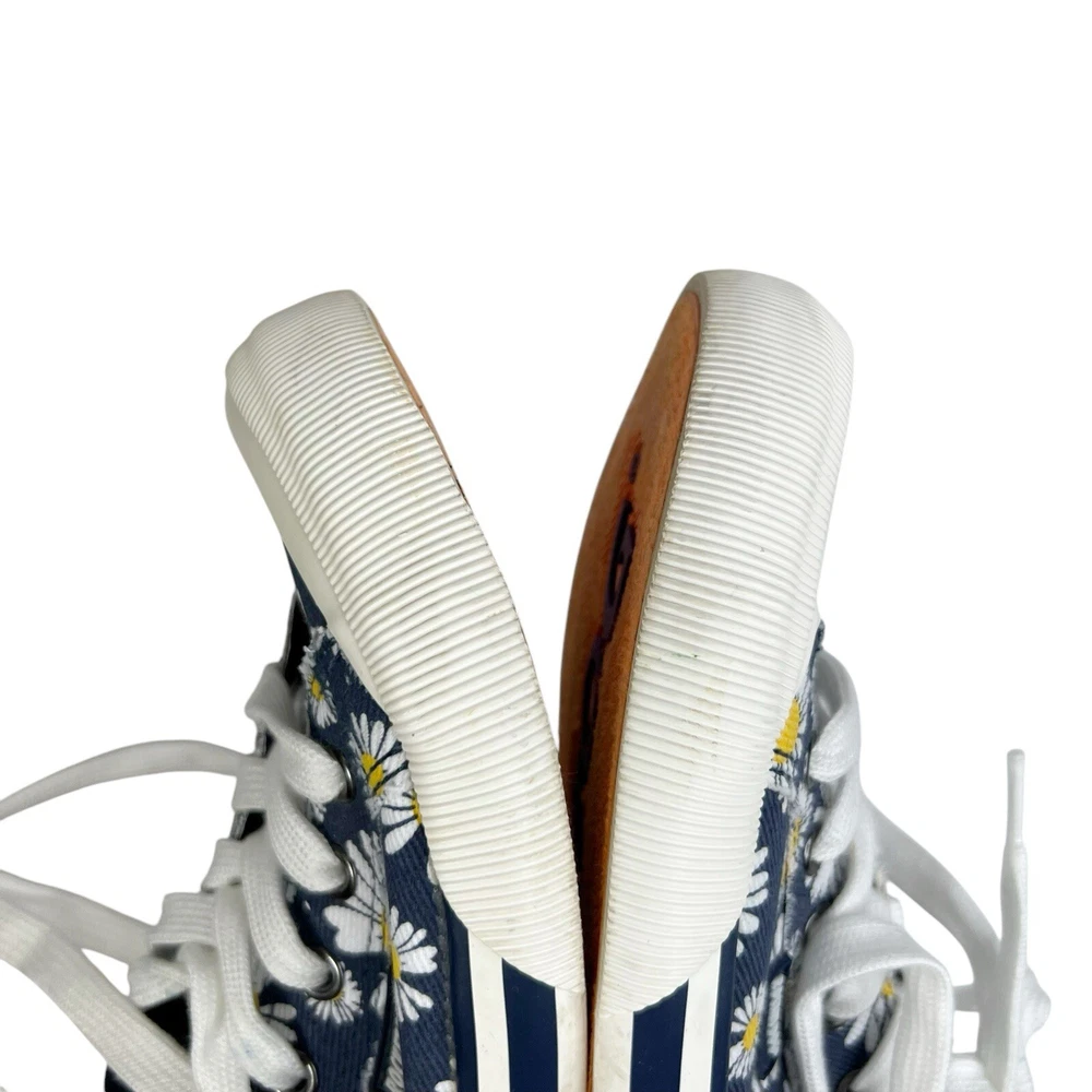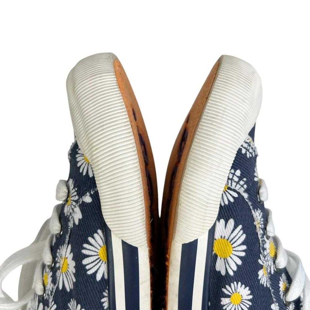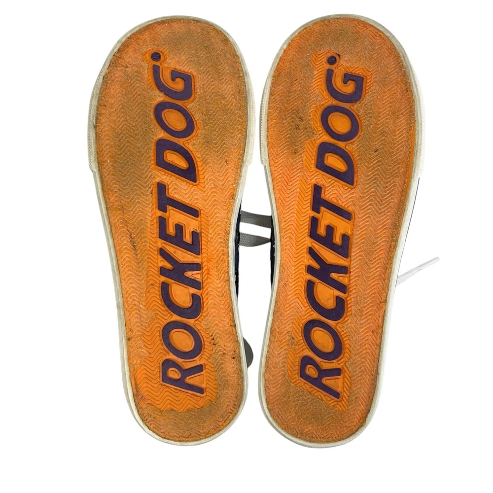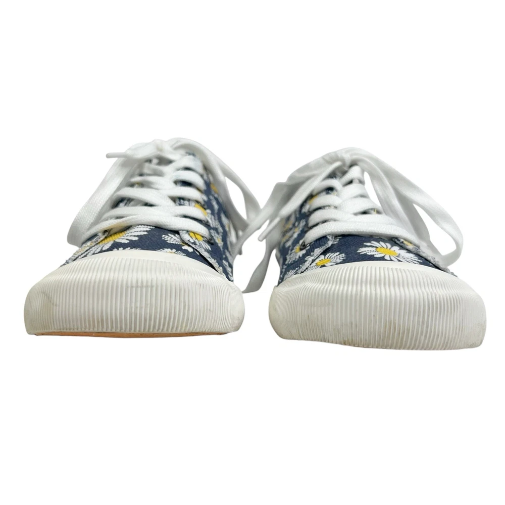 Rocket Dog Jazzin Navy Daisy Plush Foam Sneakers Shoes. Size 9. In gently preowned condition with some scuffing to the sides, wear to the soles and faint color transfer on the laces. Colorful daisy print with a navy blue background. Low top, lace up, cotton upper, rubber toe cap, Rocket Dog logo heel cap and plush foam comfort insole.