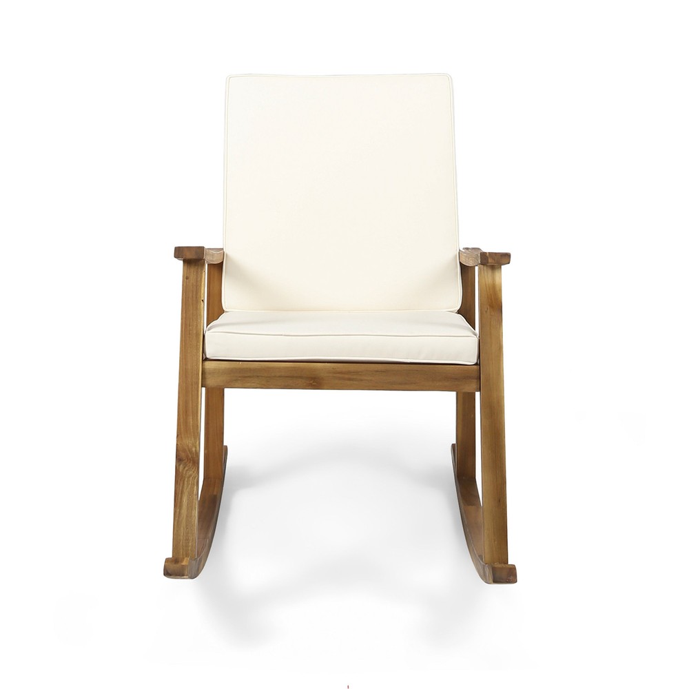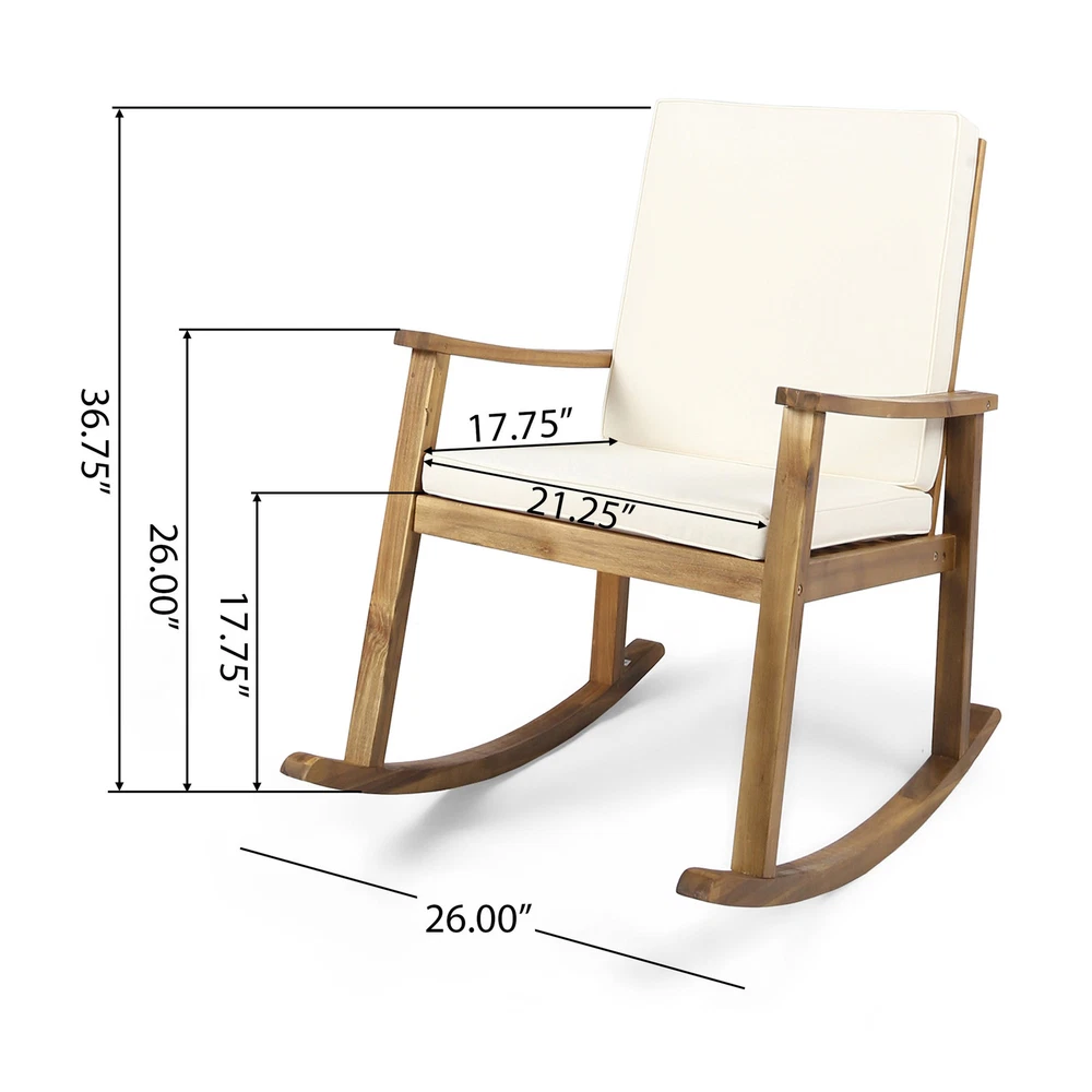 Specifications Place of Origin #originPlace# Main Color Cream Main Material Acacia Wood Dangerous Goods #dangerFlag# Dimensions & Weights Assembled Length (in.) 26.00 Assembled Width (in.) 35.75 Assembled Height (in.) 36.75 Weight (lbs) 23.15 Product Features Enjoy relaxed evenings and romantic sunsets in absolute luxury. Featuring a modern cross-back design and a gentle rocking feature, our rocking chairs bring both incredible comfort and breezy coastal vibes to your outdoor space. This charming chair is crafted from rich acacia wood and is topped with cozy cushions, making it your new favorite place to sit back and unwind. ACACIA WOOD: This durable hardwood is a solid, heavy frame that naturally withstands the elements and resists wear and tear. ROCKING FEATURE: This chair features long rockers that are ideal for deep, soothing rocking motions, excellent for relaxing. CUSHIONS INCLUDED: Our removable cushions offer soft padding for some much-needed comfort while you relax. WEATHER RESISTANT: This rocking chair is designed and tested to resist mild weather conditions. We always advise covering, storing, or providing other protection to our furniture in the event of heavy or repeated exposure to the elements, including water and UV rays. DIMENSIONS: Each rocking chair is 26.00' W x 35.75' D x 36.75' H. Frame Material Details : Acacia Wood Leg Material Details : Acacia Wood Care Instructions : Spot Clean Description