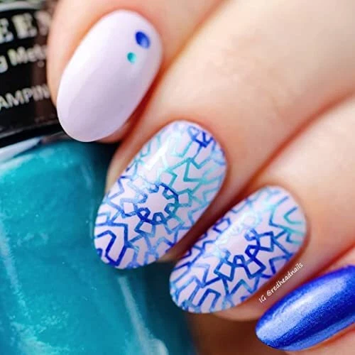 BIG5FREE FORMULA NAIL POLISH FOR STAMPING Highly pigmented formula is great for stamping Stamps great over black colors Colors: Silver Dust 601, Love Affair 605, Ocean Blue 607, Hathaway Gold 609, Mighty Aphrodite 610, Mexicali Turquoise 611, Golden Delicious 603, Twilight Magenta 604, Pink Ladies 606, Cool Aqua 608, Ruby Gem 612, Hot Fuchsia 613 12 metallic colors, 12ml each