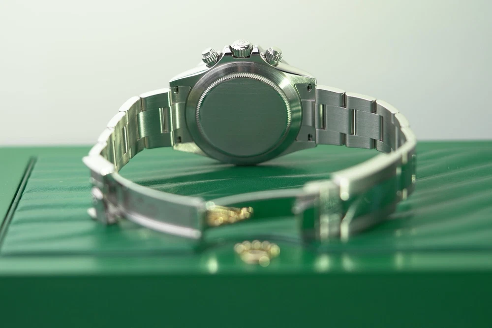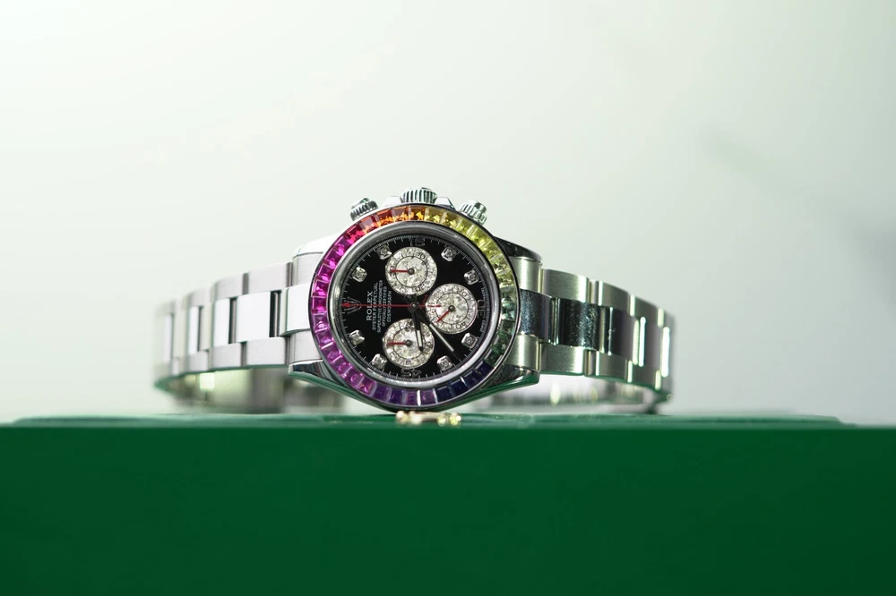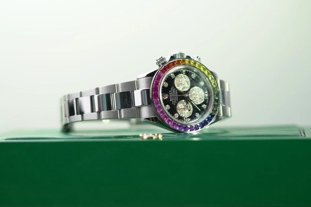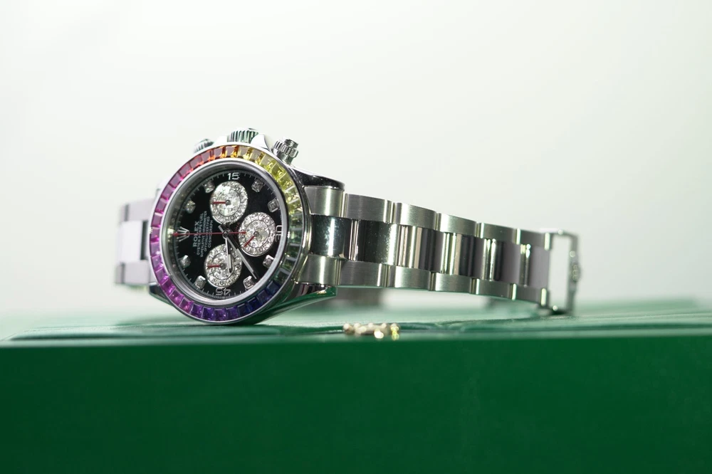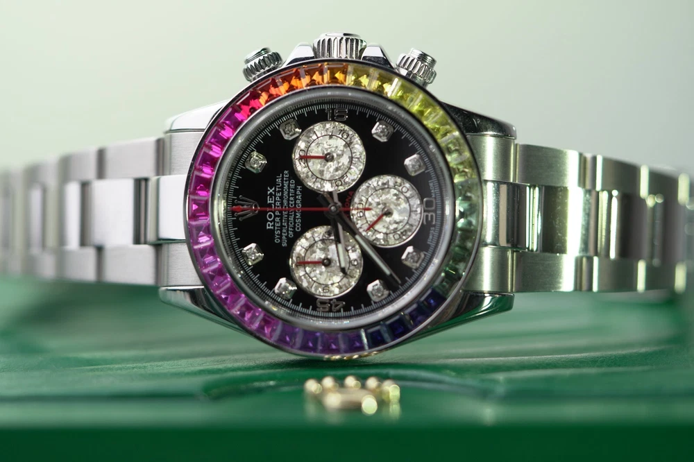 Rolex Daytona Stainless Steel 40mm Black Custom Rainbow Sapphire Bezel - 116520 DESCRIPTION Brand: Rolex Model: Daytona Reference: 116520 Size: 40mm Material: Stainless Steel FEATURES Dial: Black Diamond Bezel: Custom Rainbow Sapphire Crystal: Sapphire Crystal Case: Stainless Steel Bracelet: Oyster, Stainless Steel Box: No Papers: No Payment Method All Major Debit & Credit Cards are accepted! Shipping Policy All orders will be shipped via FedEX, Overnight Fully Insured. All orders will be delivered to a FedEX Office (Hold At Location) For Pickup Shipments will only be made on business days, not on weekends or national holidays Buyers are responsible for all duties and taxes. The purchase price does not include import duties, taxes, and/or charges for international shipments. Return Policy ALL SALES ARE FINAL, NO RETURNS OR REFUNDS Terms & Conditions Every watch we sell goes through a meticulous 7-step authentication process, done by our in-house watch professionals. An unauthentic watch has NEVER passed through our system undetected. If we sell it, you can be confident that you're buying a genuine, original product. Authenticity is the single most important part of our business, and makes up who we are. It is our promise to you. Please note that NY buyers will be subject to 8.875% sales tax WATCHXNYC INC.