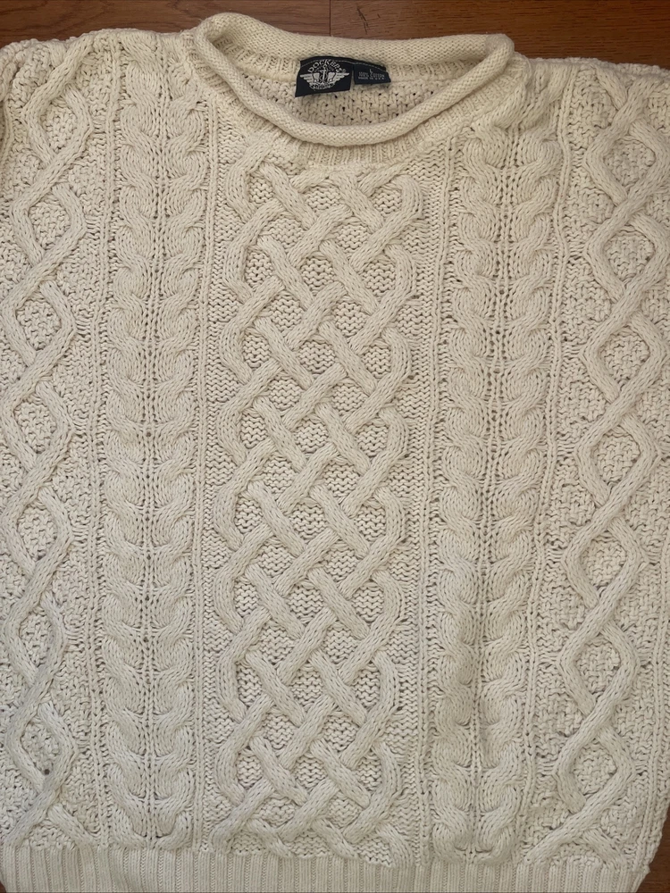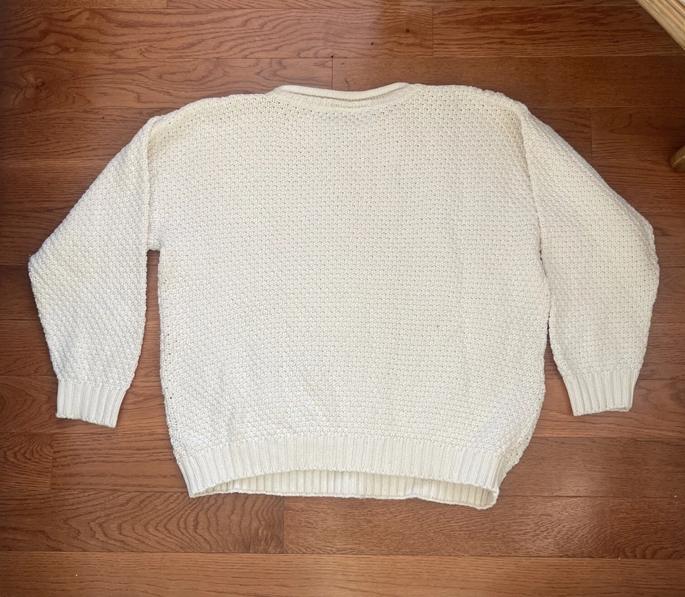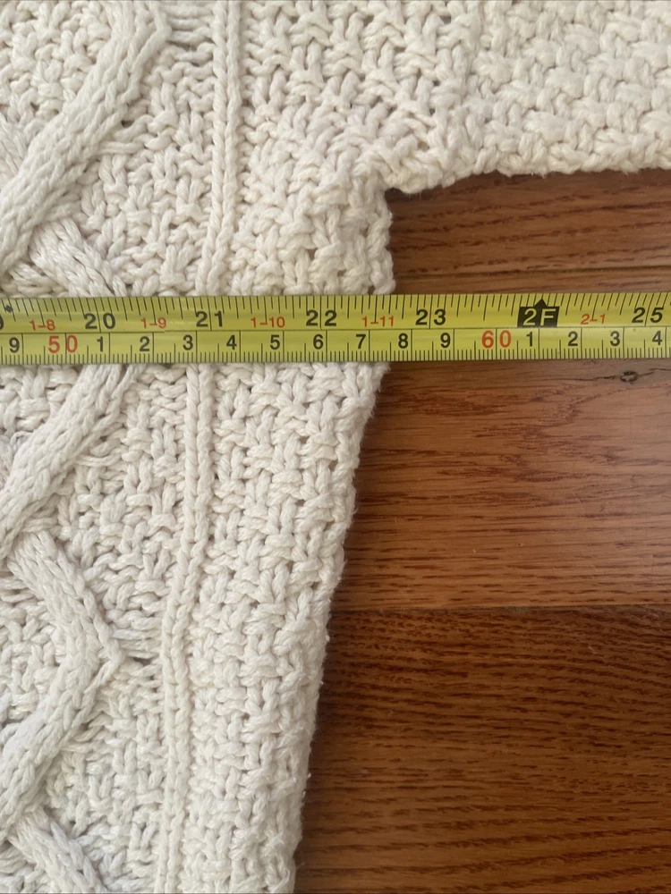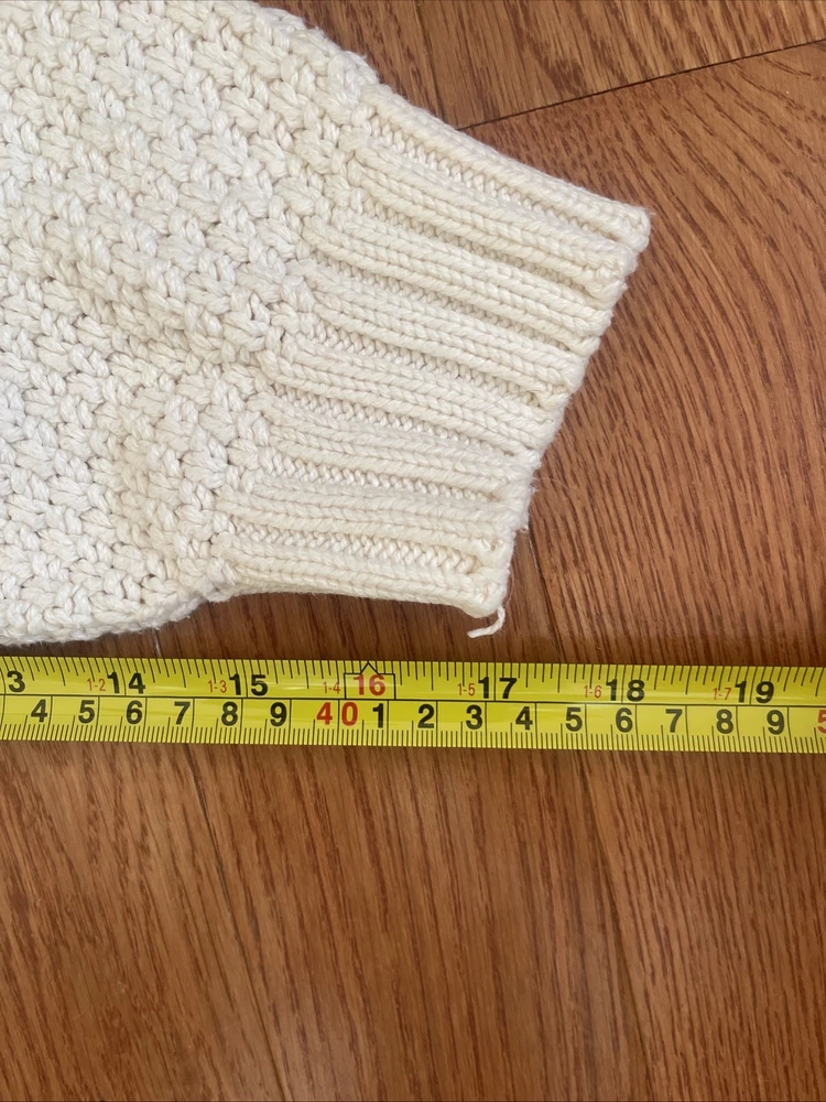 Nice vintage sweater. Please see photos for actual measurements. Sleeves are shorter than the usual long sleeves. Probably stretchable. There is an area at the top that could use a reinforcement stitch.