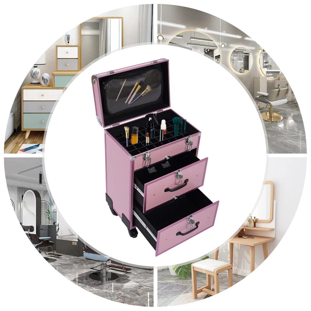 💖💖💖WELCOME TO AAERTU💖💖💖 Rolling Makeup Train Case Cosmetic Trolley Makeup Storage Organizer Luggage Box Description This is a movable multi-layered makeup case designed for professional beauty artists to make up anytime and anywhere. This rolling makeup case is constructed of high-quality aluminum alloy that is sturdy and durable. It has extra large capacity compartments and multi-layer drawers. This case is ideal for all people who love beauty or nail art. Key Features High-quality Materials: The frame of the makeup case is wrapped with high-quality aluminum alloy, which will not easily rust and fade. And the thicker, all-aluminum drawbar makes the case more stable, refusing to shake. Large Capacity: This makeup case has 3 layers, the top layer can store nail polish or lipstick; the bottom two drawers can store full-size cosmetics and beauty appliances, such as perms, manicure machines and light therapy supplies. This multifunctional product can meet your storage needs. Excellent Weight-bearing Capacity: The rectangular construction and aluminum alloy frame give the case a superb load-bearing capacity (up to 110.3 lbs). You can safely put all your hair and beauty tools on it. Sorted Storage: Beauty products with different functions and sizes are stored in the corresponding drawer and compartment, making the tools ranged orderly, so it is convenient for you to quickly find the tools you want. Easy to Move and Carry: The universal wheels are easy to move and very convenient, especially for nail salons and beauty salons that have a lot of tools and need to move frequently. And it comes with a telescopic pull bar (maximum length is 32.7inchs) and a top handle, which is easy to carry on trips and business trips. Stylish Appearance: This rolling make-up case gives a stylish and exquisite look with its simple construction and stylish pink. Such a retro make-up case will decorate your dressing room well and make a good impression when you are working outside. Secure & Reliable: The metal locks of the case protect the contents securely and the lockable design ensures security and privacy. Worry-free Service: We have been working hard to provide better service and quality for our customers, which is our goal. If there is any quality problem with our products. Please contact us in time. Details Transparent Storage Bag: The transparent storage bag on the inside of the lid allows for wet and dry storage, for example, you can store wet beauty eggs and powder puffs to avoid cross-contamination. Rounded Edges: The top of the cosmetic case has been designed with rounded corners rather than sharp edges to avoid scuffing. Reinforced Lock: Reinforced lock not only makes it convenient for you to open and close, but also does not affect the appearance, and solves the embarrassment of bursting when going out. Application This rolling make-up case is suitable for professional make-up artists, hairdressers, nail technicians, and beauticians in beauty centers, salons, private homes, parties, and other occasions. Specification Number of Layers: 3 Color: Pink Material: Aluminum Alloy Frame and Plastic Fireproof Board Panel Shape: Rectangular Processing Method: Frosted Rolling Wheel Style: Universal Wheel Carrying Parts: Retractable Handle Gross Weight: 9kg/ 19.8lbs Net Weight: 7.5kg/16.5lbs Package Size: 57*42*32cm/22.4*16.5*12.6inch Product Size: 36*23*58cm/14.2*9.1*22.8in Maximum Load:50kg/110.3lbs Package Included 1 x Makeup Case 4 x Universal Wheels 2 x Keys Notes Please allow the slight color difference caused by the shooting light and 1-3cm error due to manual measurement, and make sure you do not mind before you order. Payment Delivery details Terms of sales About us Contact us Payment We accept ebay payment 。 Fees such as import duties, taxes are not included in the item price or shipping costs. These charges are the buyer's responsibility. Delivery details Shipping: 2-9 working days to: USA Terms of sales We maintain high standards of excellence and strive for hundred percent customer satisfaction. Feedback is very important to us. We hope that you contact us immediately before you give neutral or negative feedback, so that we can address your concerns. It is impossible to address issues if we do not know about them! About us Your satis faction is our ultimate goal. We work hard to earn your trust and future business. Our certified technicians have tested each item before shipping. The unit comes with 1 year limited warranty on all manufacturing defects. a) If you receive a defective item, you may return it or ask for a discount. Please contact us within 14 days after you receive the package. b) What you returned must be intact and in its original packaging as re? u. Customer is responsible for shipping costs of the returned item. c) We will cover the cost of shipping back t with the shipping rate indicated in the registration page. We will send you a new unit or refund the full payment you paid. Thank you. Contact us Business Hour Business Hour: Monday To Friday: 8:30 AM to 5:00 PM (Beijing China time) Due to time zones, our reply to your questions may not be immediately. But within above working time, we will reply your email within 24 hours. If it's non-workdays, please kindly be patient and wait till Monday. Please contact us with ebay message. Please feel free to contact us if you have any questions. Monday To Friday: 8:30 AM to 5:00 PM (Beijing China time) Due to time zones, our reply to your questions may not be immediately. But within above working time, we will reply your email within 24 hours. If it's non-workdays, please kindly be patient and wait till Monday. Please contact us with ebay message. Please feel free to contact us if you have any questions.