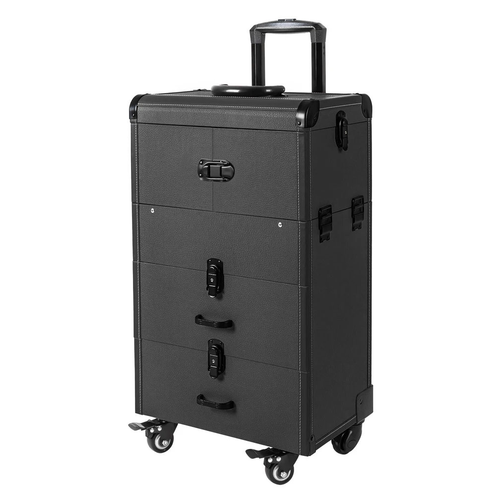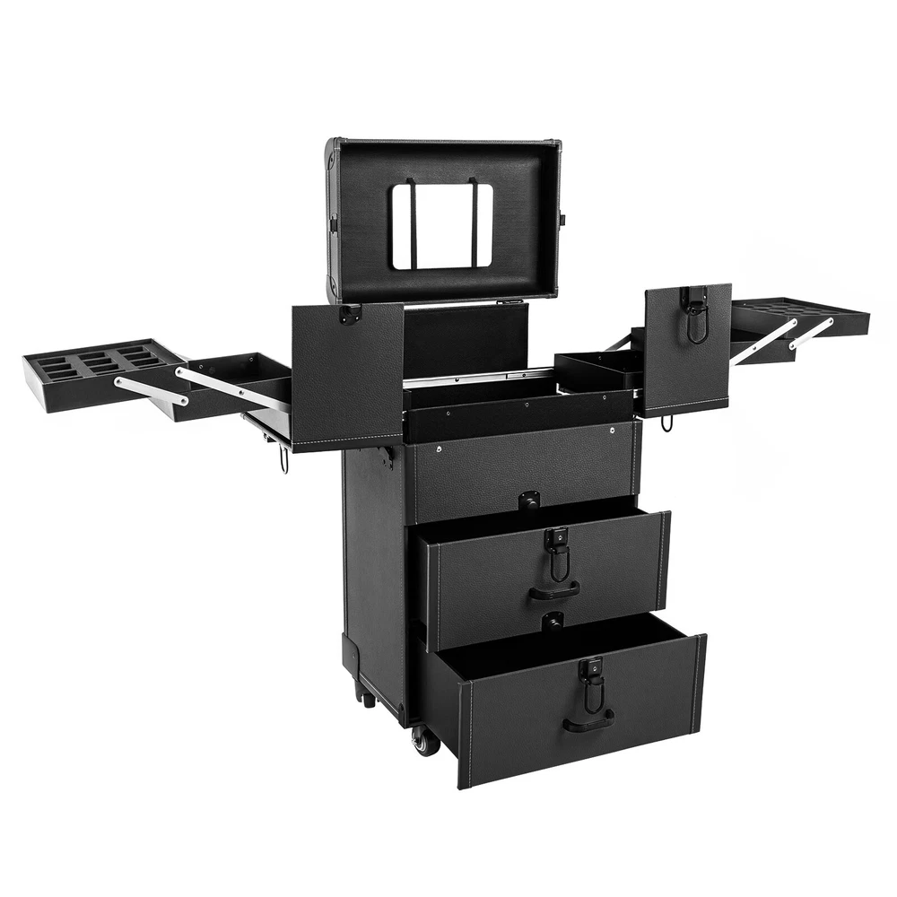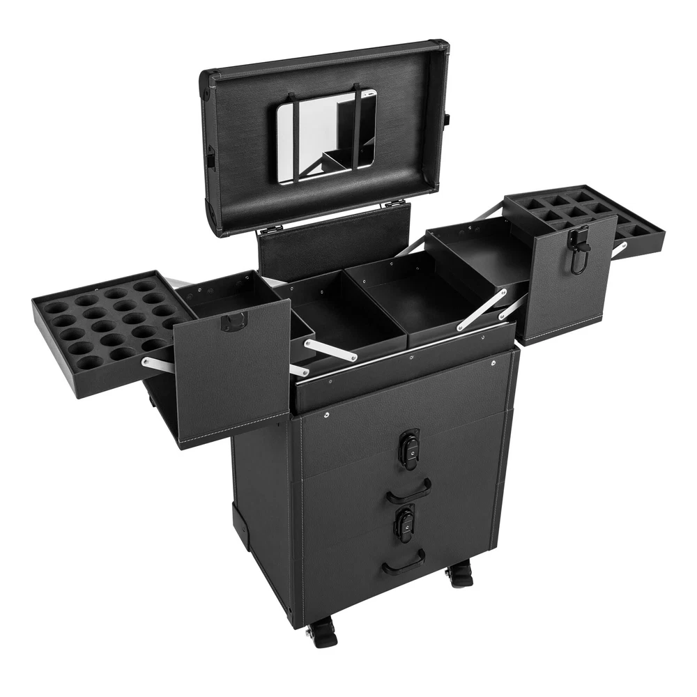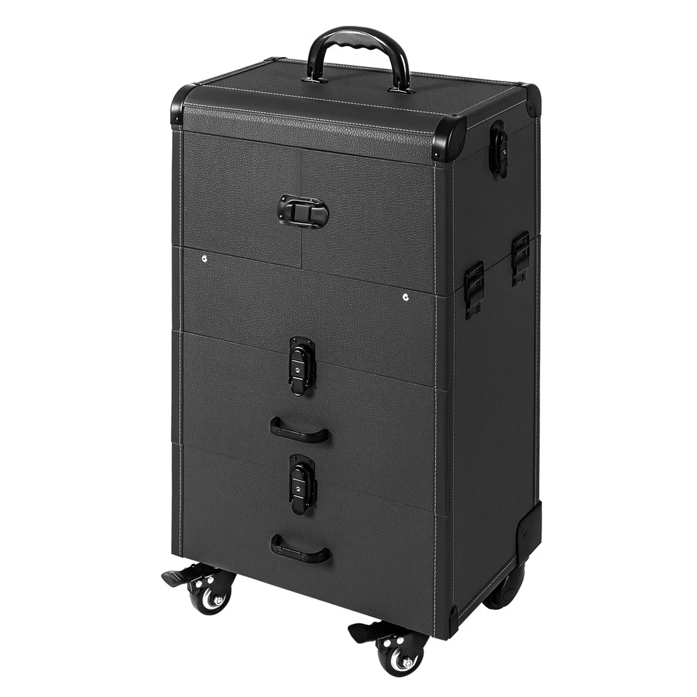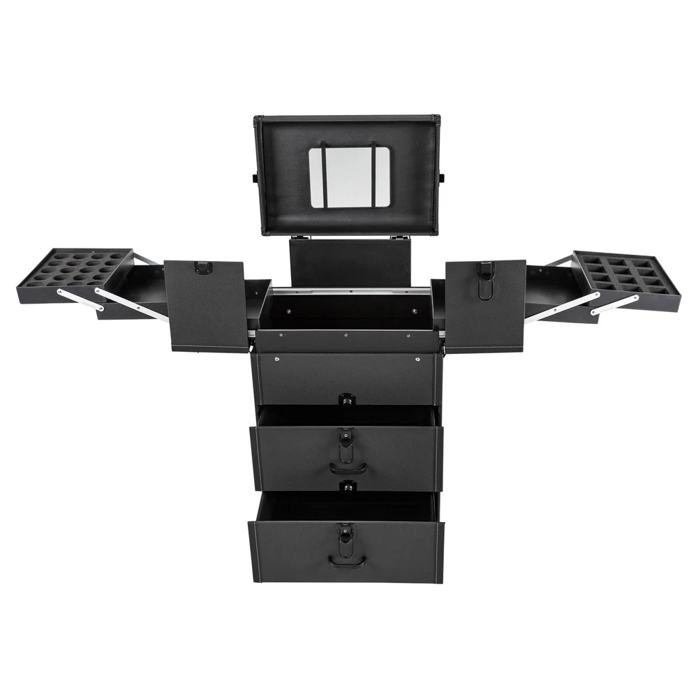 Rolling Makeup Travel Case Nail Tech Suitcase Cosmetic Train Case on Wheels Description If you are a make-up artist or embroiderer who often needs to go out to work, you will need our makeup train case. It is made of premium material, sturdy and durable. 4 universal wheels and a large capacity make it an excellent makeup assistant when outgoing. With its beautiful appearance, it is an ideal gift for your mother, sister, or wife. In addition, locks and latches can ensure high safety, so you can use this item confidently. Key Features Long Service Life: High-quality wood board and PVC make this product anti-corrosion, waterproof , and rustproof and not easily deform, thus ensuring a long service life. Easy to Move & Carry: The 4 universal wheels(2 with brakes) ensure silent and smooth rolling and you can fix it stably. With the practical pull rod and comfortable handle, you can carry this product with less effort. Large Capacity: 4 retractable trays on the top, a large space in the middle, and 2 large drawers at the bottom can provide enough storage space for various cosmetics and makeup tools, such as foundation, eye shadow, blush powder, skin care products, sprays, hair tools. Neat Storage: With different partitions, you can arrange cosmetics in an orderly manner, saving the countertop space and saving time searching for cosmetics, giving your dressing table a new look. Excellent Load-bearing Capacity: The premium materials and rectangular structure provide the make-up case with a maximum weight-bearing capacity of about 110.23 lbs. You can place all kinds of hairdressing and beauty tools on it with confidence. Ready to Use: You can use this product without tedious assembly after receiving it, which saves you time and energy. Stylish Appearance: The rectangular frame, low-key black color, and anti-scratch diamond patterns give this product a stylish look, which is a brilliant view when you are carrying it outside. Thoughtful Design: The clear and bright makeup mirror in the case is convenient for you to create the ideal makeup look. The EVA partition can protect your cosmetics from being damaged and allow for neat storage. Ideal Gift: Its exquisite design and large capacity make this product a great gift to your mother, girlfriend, sisters, wife and loved ones so that they can enjoy more convenient makeup time. Protective Shipping: To prevent the product from being damaged and bumped during transportation, we fill the package with an anti-collision sponge to protect your products to the maximum extent possible. Customer Service: We aim to provide quality products and services. If you have any problems, please feel free to contact us. We will reply and solve the problem for you as soon as possible. Details Zinc Alloy Corner Wrap: The zinc alloy corner wrap with a round design can not only protect your case from impact but also better care for your skin. Locks and Latch: They are solid and durable to effectively protect the inside items from loss. Application Professional makeup artists, hairdressers, beauticians, manicurists, beauty lovers, etc. can use this product to store cosmetics and makeup tools. It is ideal for makeup contests, wedding makeup scenarios, travel makeup, outdoor shooting, cinemas, dressing rooms, crew, tourism, beauty salons, and more. How to Lock 1. Lift the steel ring. 2. Press the lock plate. 3. Insert the key. 4. Turn clockwise to lock it, and turn counterclockwise to open it. 5. The case is locked. Specification Color: Black Shape: Rectangular Material: Zinc Alloy, Wood Board, PVC, EVA Style: Modern Assembly Required: 1 Number of Items: 1 Mounting Type: Free Standing Overall Load-bearing Capacity: About 50kg/110.23 lbs Wheel Height: 7cm/2.76in Overall Product Size: 37*24*66cm/14.57*9.45*25.98in Pull Rod Length: 43cm/16.93in Mirror Size: 16.5*11cm/6.5*4.33in Each Tray Size: 19.5*16.5*4.5cm/7.68*4.69*1.77in Middle Space Size: 34*21*12cm/13.39*8.27*4.72in Each Drawer Size: 34*20*11cm/13.39*7.87*4.33in Package Size: 42*32*72cm/16.54*12.6*28.35in Net Weight: 9.8kg/21.61 lbs Gross Weight: 12kg/26.46 lbs Package Included 1 x Makeup Train Case 2 x Keys Notes The service wear of the case is a normal phenomenon. In the process of daily use, please try to avoid excessive impact and drop to extend the lifespan of the product. Please use soft tools and water to clean. Please keep away from corrosive liquids. Please avoid long-term exposure to the sun. Please clear the wheels in time to maintain smooth movement. Please allow the slight color difference caused by the shooting light and the 1-3cm error due to manual measurement. Please make sure you do not mind before you order. Payment Delivery details Terms of sales About us Contact us Payment We accept ebay payment 。 Fees such as import duties, taxes are not included in the item price or shipping costs. These charges are the buyer's responsibility. Delivery details Shipping: 2-9 working days to: USA Terms of sales We maintain high standards of excellence and strive for hundred percent customer satisfaction. Feedback is very important to us. We hope that you contact us immediately before you give neutral or negative feedback, so that we can address your concerns. It is impossible to address issues if we do not know about them! About us Your satis faction is our ultimate goal. We work hard to earn your trust and future business. Our certified technicians have tested each item before shipping. The unit comes with 1 year limited warranty on all manufacturing defects. a) If you receive a defective item, you may return it or ask for a discount. Please contact us within 14 days after you receive the package. b) What you returned must be intact and in its original packaging as re? u. Customer is responsible for shipping costs of the returned item. c) We will cover the cost of shipping back t with the shipping rate indicated in the registration page. We will send you a new unit or refund the full payment you paid. Thank you. Contact