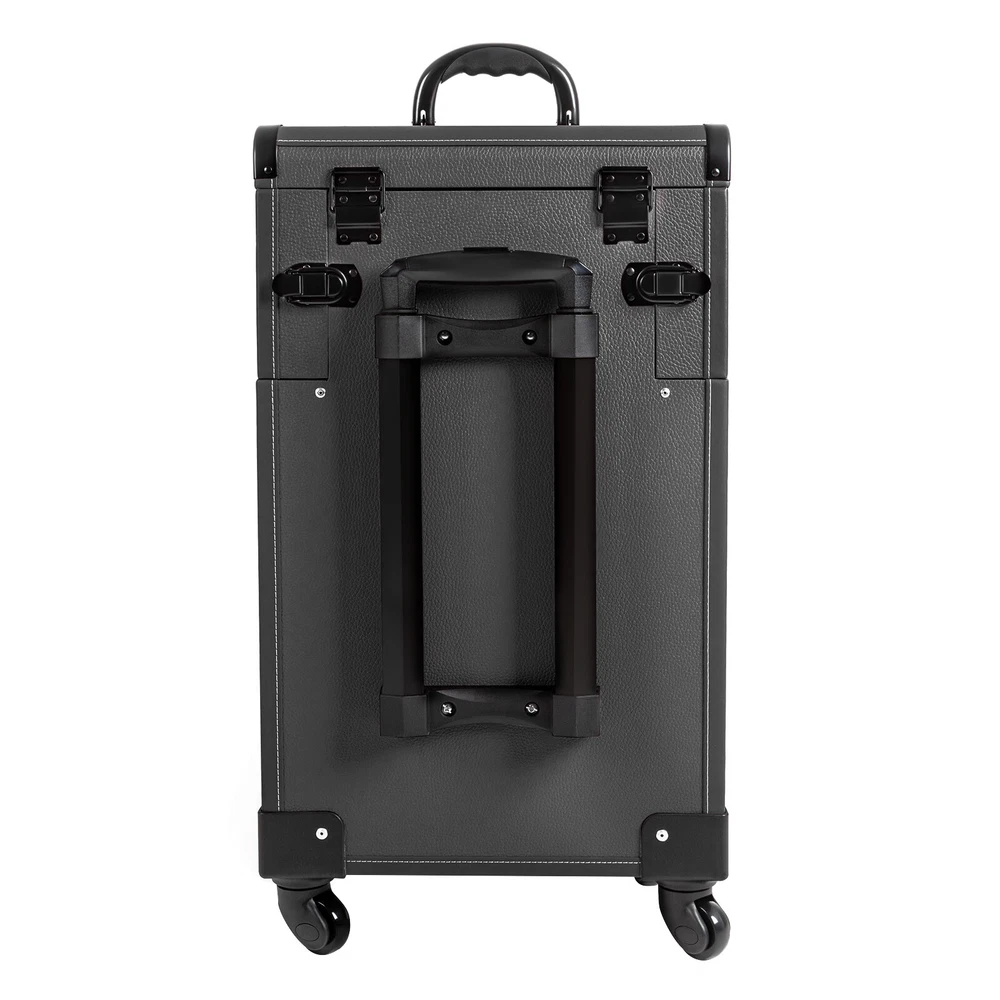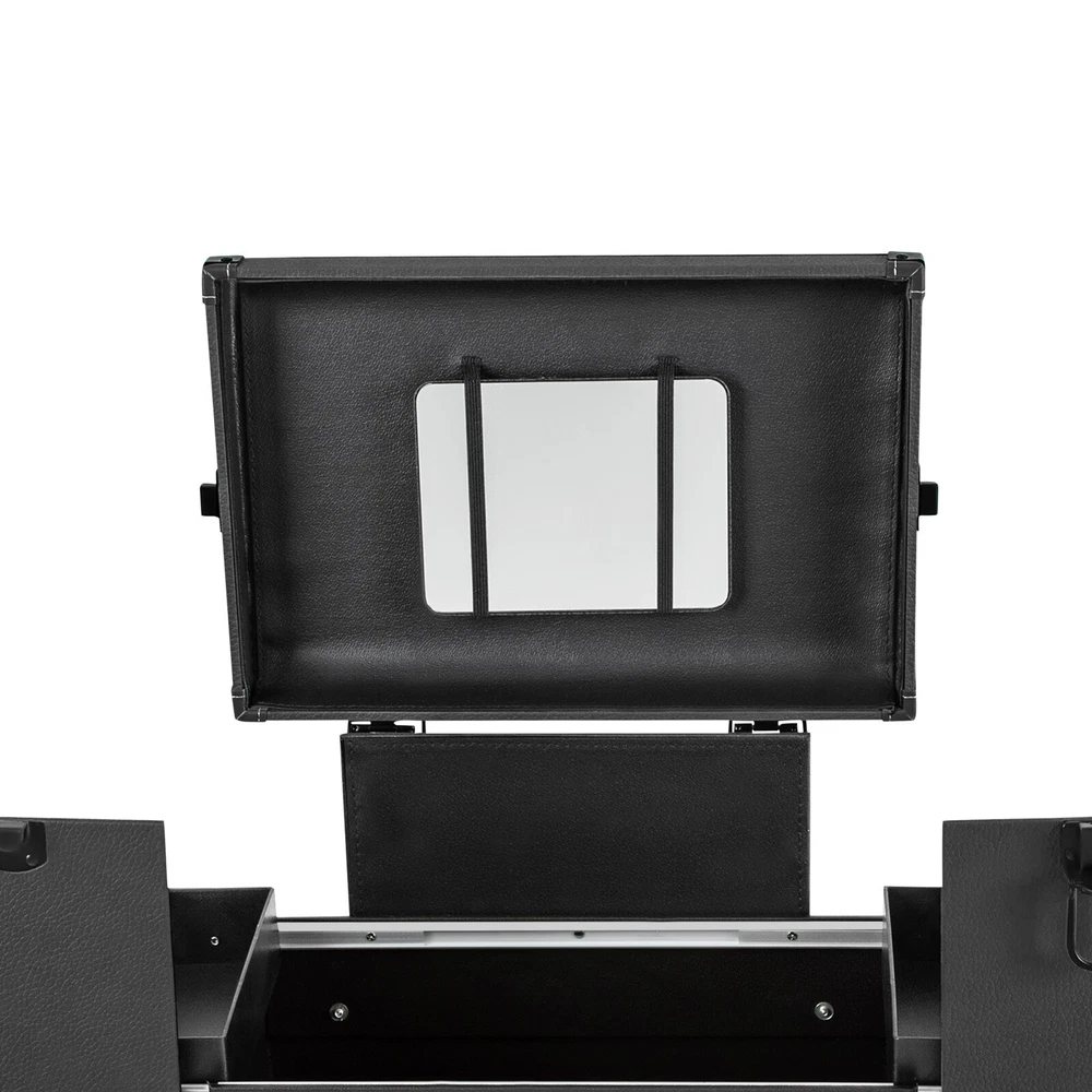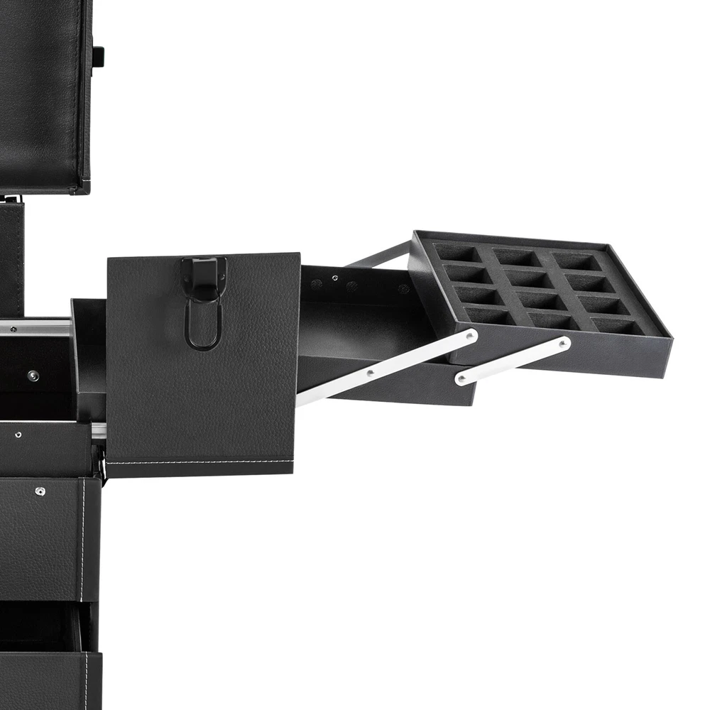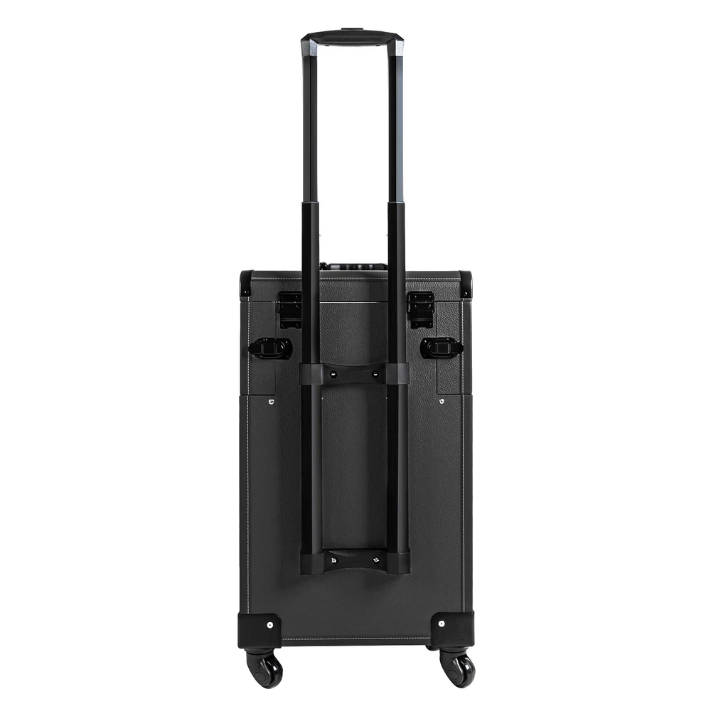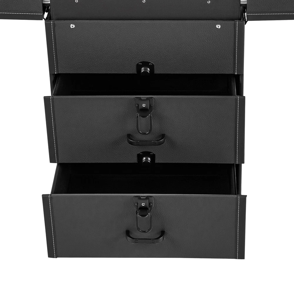 Rolling Makeup Travel Case Nail Tech Suitcase Cosmetic Train Case on Wheels Description If you are a make-up artist or embroiderer who often needs to go out to work, you will need our makeup train case. It is made of premium material, sturdy and durable. 4 universal wheels and a large capacity make it an excellent makeup assistant when outgoing. With its beautiful appearance, it is an ideal gift for your mother, sister, or wife. In addition, locks and latches can ensure high safety, so you can use this item confidently. Key Features Long Service Life: High-quality wood board and PVC make this product anti-corrosion, waterproof , and rustproof and not easily deform, thus ensuring a long service life. Easy to Move & Carry: The 4 universal wheels(2 with brakes) ensure silent and smooth rolling and you can fix it stably. With the practical pull rod and comfortable handle, you can carry this product with less effort. Large Capacity: 4 retractable trays on the top, a large space in the middle, and 2 large drawers at the bottom can provide enough storage space for various cosmetics and makeup tools, such as foundation, eye shadow, blush powder, skin care products, sprays, hair tools. Neat Storage: With different partitions, you can arrange cosmetics in an orderly manner, saving the countertop space and saving time searching for cosmetics, giving your dressing table a new look. Excellent Load-bearing Capacity: The premium materials and rectangular structure provide the make-up case with a maximum weight-bearing capacity of about 110.23 lbs. You can place all kinds of hairdressing and beauty tools on it with confidence. Ready to Use: You can use this product without tedious assembly after receiving it, which saves you time and energy. Stylish Appearance: The rectangular frame, low-key black color, and anti-scratch diamond patterns give this product a stylish look, which is a brilliant view when you are carrying it outside. Thoughtful Design: The clear and bright makeup mirror in the case is convenient for you to create the ideal makeup look. The EVA partition can protect your cosmetics from being damaged and allow for neat storage. Ideal Gift: Its exquisite design and large capacity make this product a great gift to your mother, girlfriend, sisters, wife and loved ones so that they can enjoy more convenient makeup time. Protective Shipping: To prevent the product from being damaged and bumped during transportation, we fill the package with an anti-collision sponge to protect your products to the maximum extent possible. Customer Service: We aim to provide quality products and services. If you have any problems, please feel free to contact us. We will reply and solve the problem for you as soon as possible. Details Zinc Alloy Corner Wrap: The zinc alloy corner wrap with a round design can not only protect your case from impact but also better care for your skin. Locks and Latch: They are solid and durable to effectively protect the inside items from loss. Application Professional makeup artists, hairdressers, beauticians, manicurists, beauty lovers, etc. can use this product to store cosmetics and makeup tools. It is ideal for makeup contests, wedding makeup scenarios, travel makeup, outdoor shooting, cinemas, dressing rooms, crew, tourism, beauty salons, and more. How to Lock 1. Lift the steel ring. 2. Press the lock plate. 3. Insert the key. 4. Turn clockwise to lock it, and turn counterclockwise to open it. 5. The case is locked. Specification Color: Black Shape: Rectangular Material: Zinc Alloy, Wood Board, PVC, EVA Style: Modern Assembly Required: 1 Number of Items: 1 Mounting Type: Free Standing Overall Load-bearing Capacity: About 50kg/110.23 lbs Wheel Height: 7cm/2.76in Overall Product Size: 37*24*66cm/14.57*9.45*25.98in Pull Rod Length: 43cm/16.93in Mirror Size: 16.5*11cm/6.5*4.33in Each Tray Size: 19.5*16.5*4.5cm/7.68*4.69*1.77in Middle Space Size: 34*21*12cm/13.39*8.27*4.72in Each Drawer Size: 34*20*11cm/13.39*7.87*4.33in Package Size: 42*32*72cm/16.54*12.6*28.35in Net Weight: 9.8kg/21.61 lbs Gross Weight: 12kg/26.46 lbs Package Included 1 x Makeup Train Case 2 x Keys Notes The service wear of the case is a normal phenomenon. In the process of daily use, please try to avoid excessive impact and drop to extend the lifespan of the product. Please use soft tools and water to clean. Please keep away from corrosive liquids. Please avoid long-term exposure to the sun. Please clear the wheels in time to maintain smooth movement. Please allow the slight color difference caused by the shooting light and the 1-3cm error due to manual measurement. Please make sure you do not mind before you order. Payment Delivery details Terms of sales About us Contact us Payment We accept ebay payment 。 Fees such as import duties, taxes are not included in the item price or shipping costs. These charges are the buyer's responsibility. Delivery details Shipping: 2-9 working days to: USA Terms of sales We maintain high standards of excellence and strive for hundred percent customer satisfaction. Feedback is very important to us. We hope that you contact us immediately before you give neutral or negative feedback, so that we can address your concerns. It is impossible to address issues if we do not know about them! About us Your satis faction is our ultimate goal. We work hard to earn your trust and future business. Our certified technicians have tested each item before shipping. The unit comes with 1 year limited warranty on all manufacturing defects. a) If you receive a defective item, you may return it or ask for a discount. Please contact us within 14 days after you receive the package. b) What you returned must be intact and in its original packaging as re? u. Customer is responsible for shipping costs of the returned item. c) We will cover the cost of shipping back t with the shipping rate indicated in the registration page. We will send you a new unit or refund the full payment you paid. Thank you. Contact
