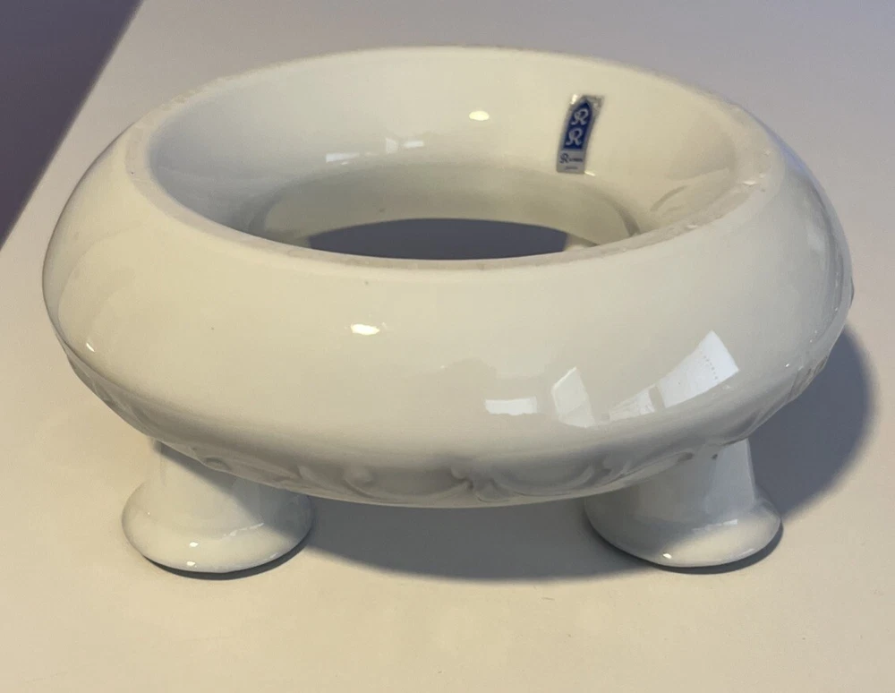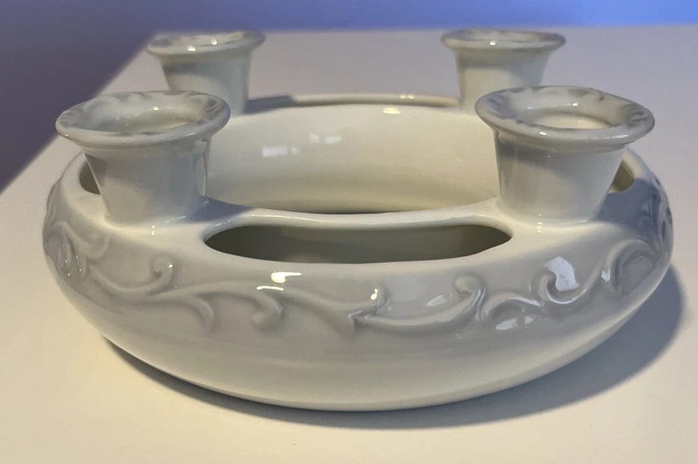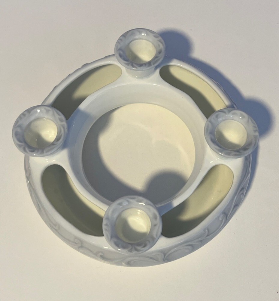 R.R. Roman Blue & White Porcelain Candle Holder Ring 4 Tapers w/Flower Trough - 6" Diameter Please review all pictures carefully as they are part of the description. Questions are welcome.