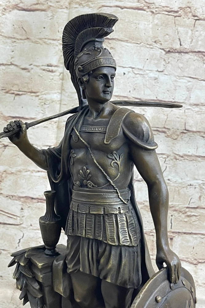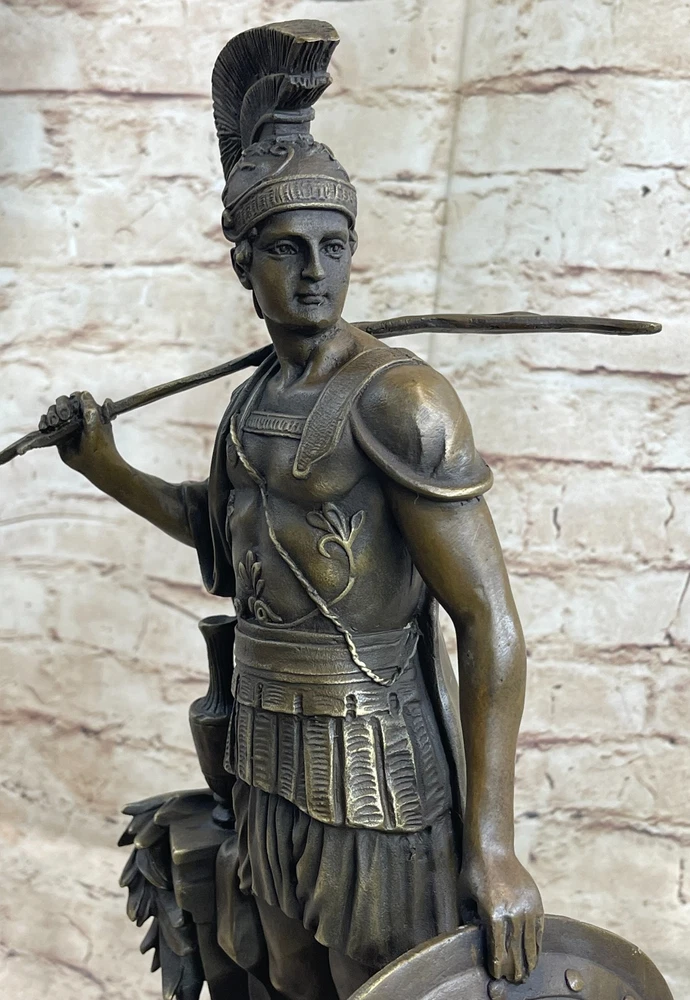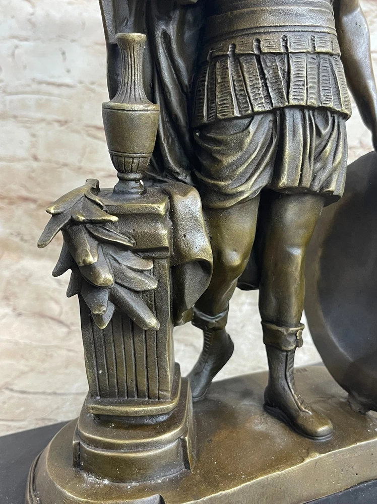 Roman Warrior Soldier Spear Shield Military Art Collector Bronze Marble Gift NR Roman Warrior Soldier Spear Shield Military Art Collector Bronze Marble Gift NR Condition : This sculpture is in perfect condition. Bronze Dimensions with Marble Base: Height 16" X Width 9.5" Marble Dimensions:9.5" X 6" Height without base:15" Weight:18 LBS Inventory:24STE64510542 Witness the powerful presence of the Roman legion soldier in this remarkable bronze sculpture. Captured in a moment of reflection on a scarred battlefield, the soldier stands with resolute determination and strength. His naked form, adorned only with select regalia, speaks to his unwavering commitment to duty and honor. The soldier wears a galea, a traditional soldier's helmet, atop his head, providing protection and symbolizing his role as a warrior. A baldric, a leather belt used for carrying weapons, rests across his chest, highlighting his readiness for battle. His paludamentum, a cloak draped over one shoulder, cascades down his back and between his legs, adding a touch of drama to the composition. This magnificent bronze sculpture is a testament to the artist's skill and attention to detail. Crafted using the ancient lost-wax casting method, each intricate feature of the soldier's form is meticulously rendered. The sculpture is finished with a rich brown patina, enhancing its timeless appeal. Mounted on a black marble base, it stands as a tribute to the artist Huzel's vision and craftsmanship. Embrace the spirit of ancient Rome with this stunning Roman legion soldier bronze sculpture. Whether displayed as a centerpiece in your home or as part of your art collection, it is sure to command attention and evoke a sense of awe. Immerse yourself in the legacy of the Roman empire and appreciate the enduring significance of this captivating artwork. Greek Spartan Warrior Roman Soldier Signed Original Bronze Sculpture Statue Sale Video will open in a new window Using the eBay App? Paste link into a browser window: [isdntekvideo] Shipping Terms : Most of our items are shipped via USPS (United States Postal Service) mail or UPS. Most orders are shipped within 24-48 hours of purchase. Please be aware that not all items are available for USPS shipping due to size and weight. We do ship to Hawaii, Alaska, Canada, Puerto Rico, APO/AE, and U.S. Virgin Islands, however, an additional charge may be required. Please contact us before making any purchases in these areas. For Non-USA customers, you may be responsible for all duty, tax, brokerage fees that may be due upon delivery (shipping costs cover freight charges only). We also ship internationally. Please refer to the "Shipping and Handling" chart for the rates for each area. Payment : We accept just about any form of payment. PayPal, Master Card, Visa or American Express credit cards. Money orders, cashiers checks, and even personal or business checks. For governmental institutions, we will also accept a purchase order. Please understand that for personal or business checks we have to wait for the check to clear (usually 7 days) before shipping. Condition : New Detailed Hand Crafted Hot Cast Bronze Satisfaction Guaranteed. This is Stock Photo, Slight Color Variation!! Listing and template services provided by inkFrog