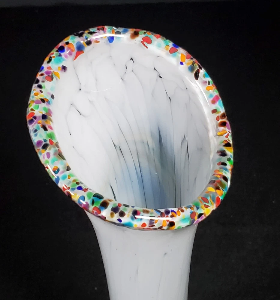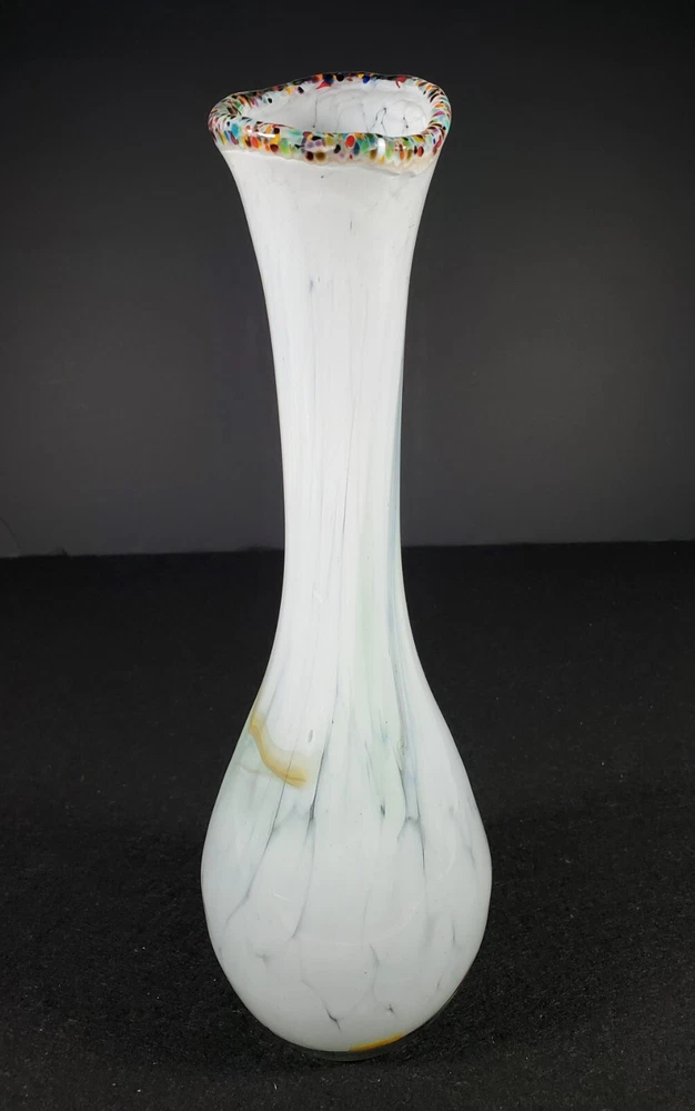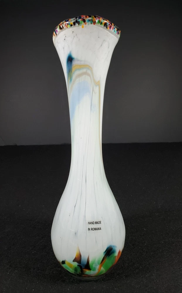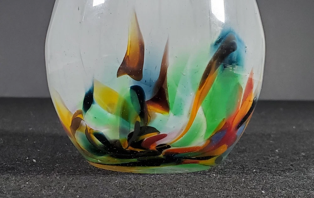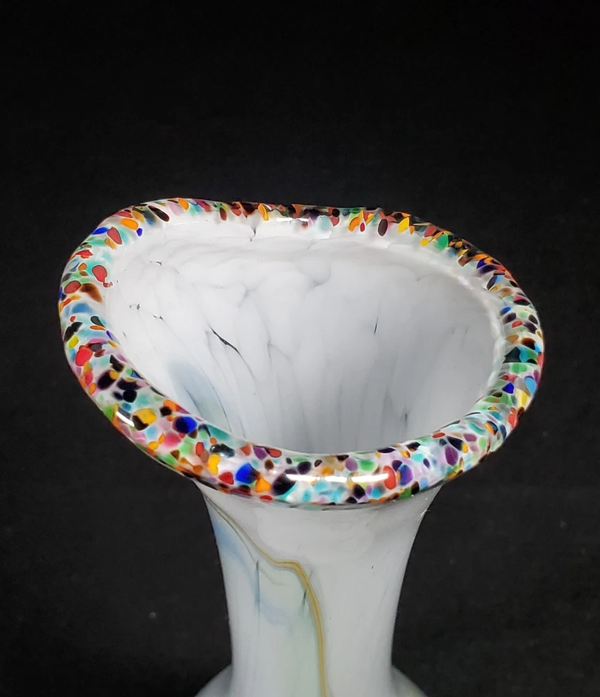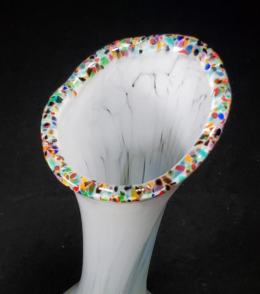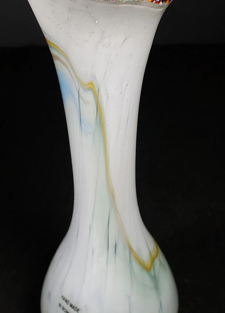 Romanian Art Vase With Millefiori Designed Rim & Colorful Abstract Hourglass.
