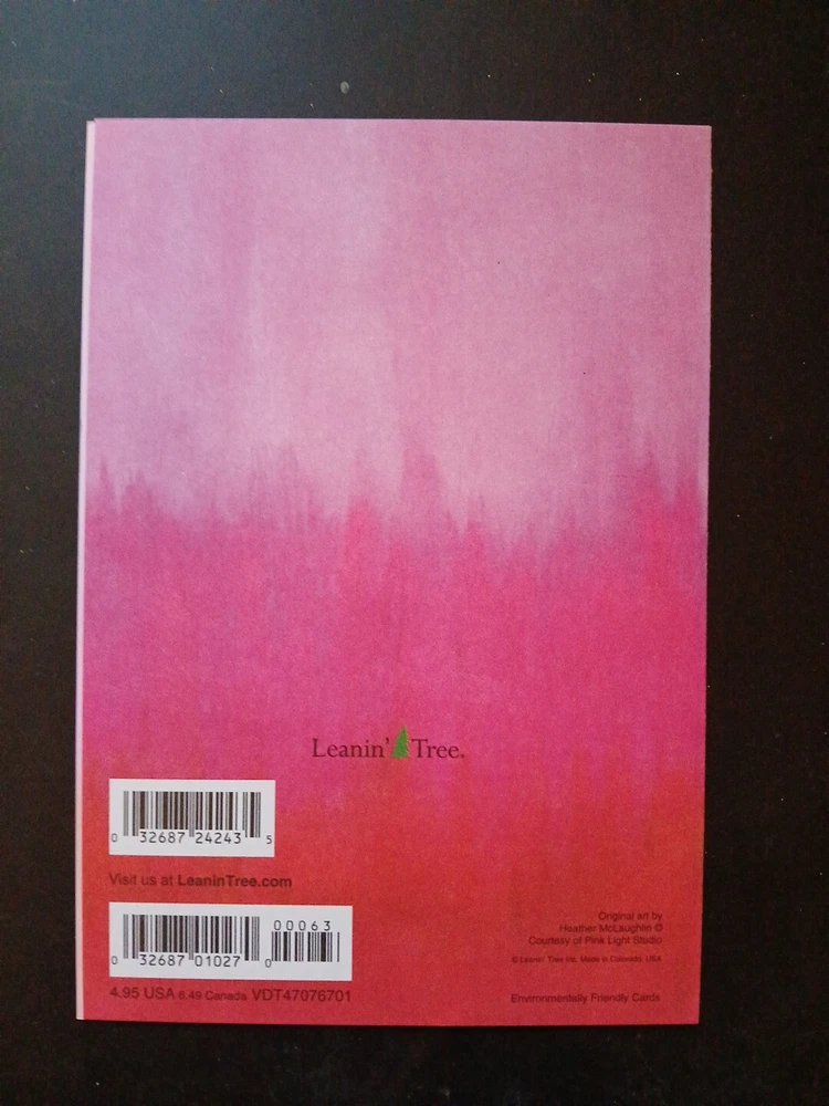 Made in the USA Leanin' Tree, Inc. All Rights Reserved. FAST shipping with USPS. Full size card & envelope. 5” X 7" No Tracking included. Environmentally friendly. Made in America. No tracking information will be uploaded as the card will be sent with a stamp USPS. Expect delivery within 3 - 8 business days. If you want expedited shipping in a padded envelope choose the flat rate envelope shipping option. With paid expedited shipping expect delivery within 1 - 4 business days. - international buyers pay $1.75 to ship and no tracking information will be available