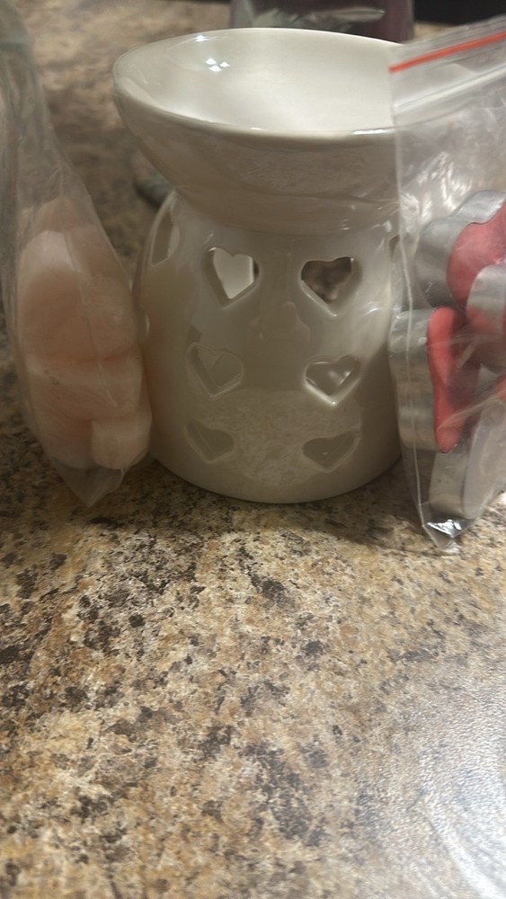 This wax warmer set includes a heart-shaped ceramic wax warmer in silver color, designed for everyday use. It is handmade and measures 5 inches in both length and width, making it small and modern in style. The set also includes wax melts with assorted scents like tea, perfect for aromatherapy in the living room. Additionally, tea lights are included for easy use of the wax warmer, providing a cozy and love-themed ambiance to the room. Made in China, this product is ideal for adults looking to create a soothing atmosphere in their home. Wax made by me