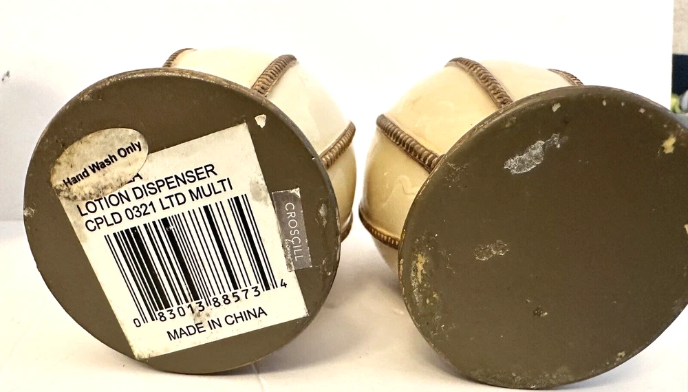 1- Romanza vanity potpourri, or trinket jar / dish with lid cover, hand painted bronze color metal rope and faux marble finish. Measurements: Diameter 4.5” Height 5” Weight 14.9 oz * Excellent condition 1 - Romanza toothbrush holder with ornate base and bronze metal rope accents. Height 5.5” Diameter 3” Weight 11 Oz 2 - Romanza lotion or soap dispensers (pumps are missing but generic pumps can be used instead or they can be used as bud vases) Height 7” Diameter 2.5” Weight each 11 oz