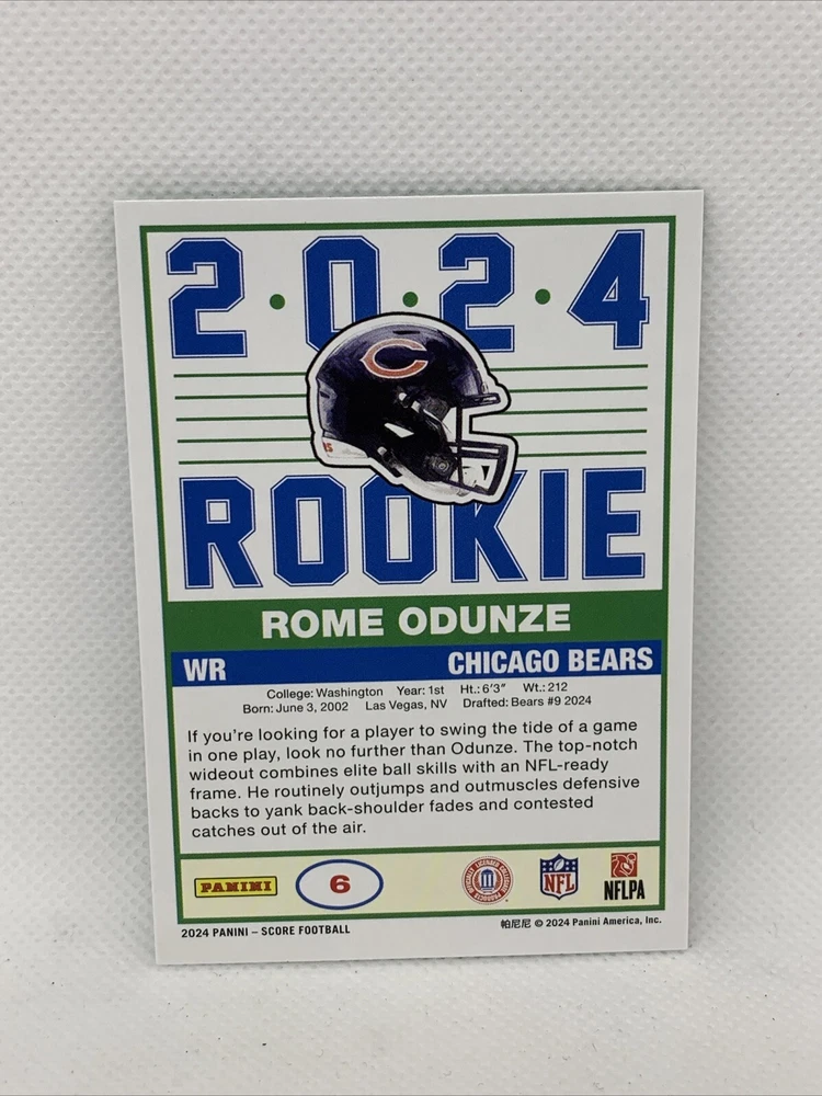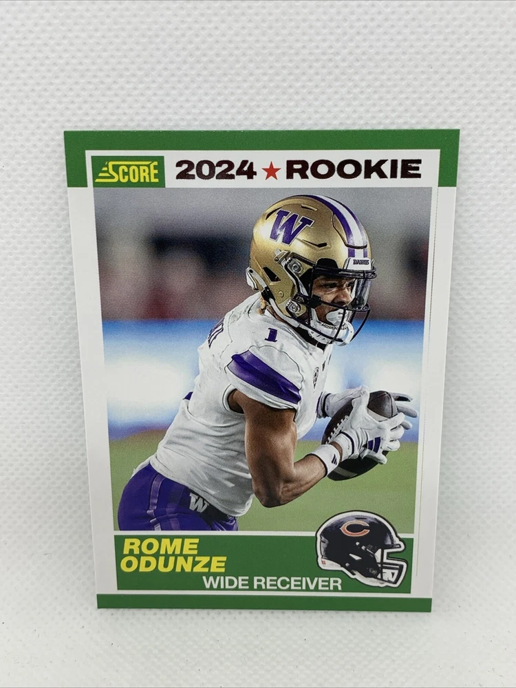 Rome Odunze Rookie 2024 Score Football 1989 Throwback RC #9 Chicago Bears trading card is a must-have for any football card collector. This original 2024 Score card features the rookie player in his Chicago Bears uniform, making it a valuable addition to your collection. With a Standard card size and National Football League (NFL) branding, this card is a perfect tribute to the sport and the player's promising career ahead.