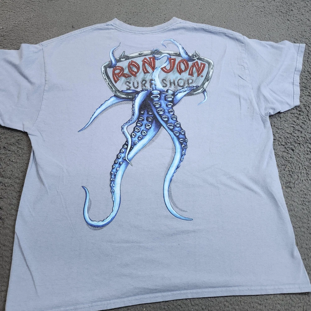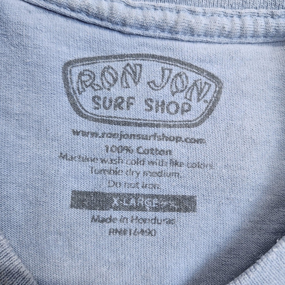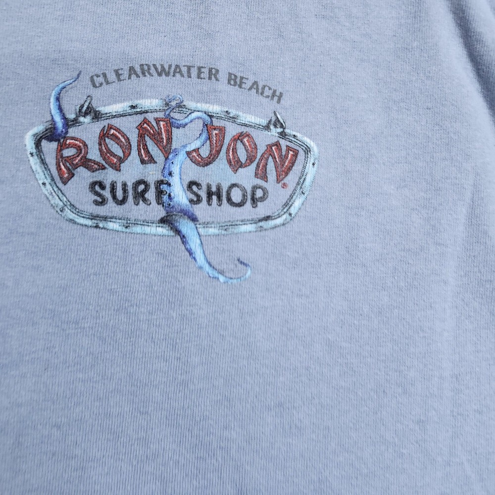 Brand: Ron Jon Surf Shop. Style: Mens short sleeve crew neck graphic T-shirt featuring Ron Jon Surf Shop logo artwork with bold octopus tentacle graphics. Color: Light blue knit body with multicolor screen-printed graphics in shades of blue, white, and red. Size: Mens XL (X-Large), as indicated on the interior printed neck label. Material: 100% cotton jersey knit fabric; fiber content and care instructions are printed on the interior tagless neck label. Country of origin: Made in Honduras, according to the interior labeling. Product details: Casual mens surf and beach-themed tee designed for everyday wear, vacations, or Ron Jon Surf Shop collectors, with a regular fit and soft cotton construction. Branding and labels: Tagless printed Ron Jon Surf Shop neck label with size designation, care information, and RN 11440 noted on the interior. Front design: Small left chest graphic reading CLEARWATER BEACH above a classic Ron Jon Surf Shop sign logo wrapped with a blue octopus tentacle. Back design: Large oversized Ron Jon Surf Shop sign logo centered across the back with detailed blue octopus tentacles extending vertically and diagonally for a bold nautical look. Fit and silhouette: Regular fit mens T-shirt with straight hem, relaxed body, and standard short sleeves intended to sit at the hip. Features: Soft cotton jersey fabrication, crew neckline, short sleeves, tagless printed neck label for comfort, surf shop branding, and octopus nautical graphic theme. Season and use: Suitable for all seasons, especially warm-weather and summer wear, ideal for beach trips, casual outings, or layered under hoodies and jackets. Additional details: Shirt is photographed laid flat front and back against a neutral background with a wooden measuring ruler visible in some images for general size reference, and a clear storage bag with a removable inventory sticker labeled 7590 appears in the final photo for organizational purposes.