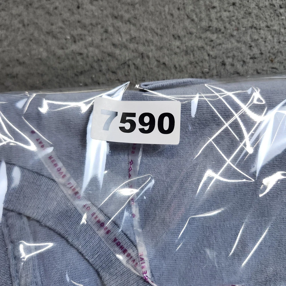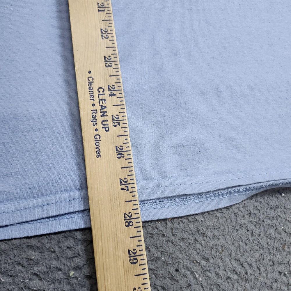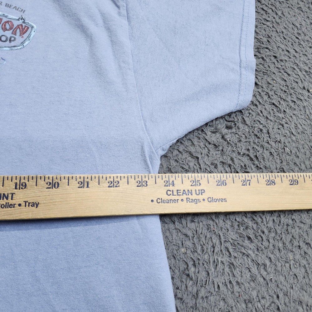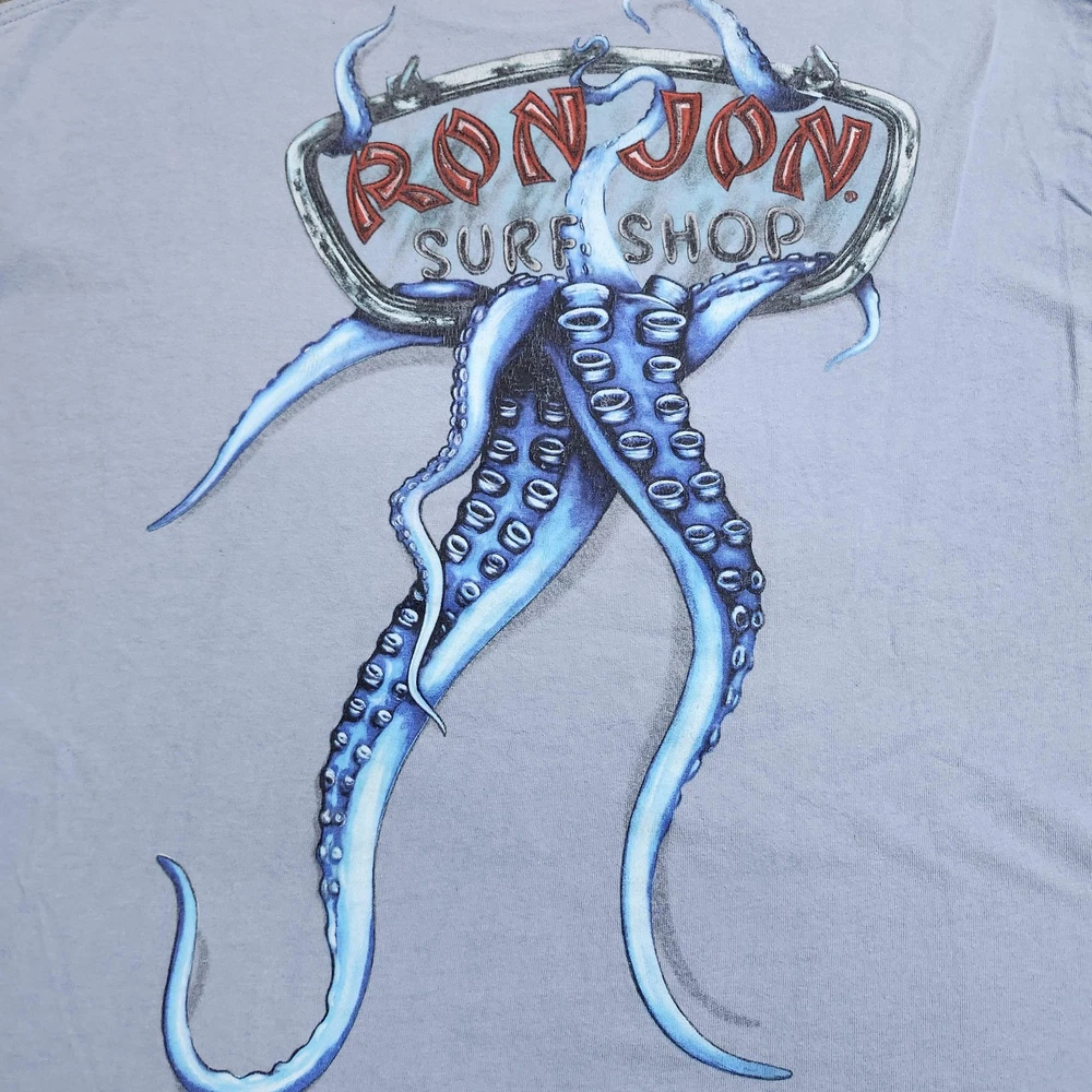 Brand: Ron Jon Surf Shop. Style: Mens short sleeve crew neck graphic T-shirt featuring Ron Jon Surf Shop logo artwork with bold octopus tentacle graphics. Color: Light blue knit body with multicolor screen-printed graphics in shades of blue, white, and red. Size: Mens XL (X-Large), as indicated on the interior printed neck label. Material: 100% cotton jersey knit fabric; fiber content and care instructions are printed on the interior tagless neck label. Country of origin: Made in Honduras, according to the interior labeling. Product details: Casual mens surf and beach-themed tee designed for everyday wear, vacations, or Ron Jon Surf Shop collectors, with a regular fit and soft cotton construction. Branding and labels: Tagless printed Ron Jon Surf Shop neck label with size designation, care information, and RN 11440 noted on the interior. Front design: Small left chest graphic reading CLEARWATER BEACH above a classic Ron Jon Surf Shop sign logo wrapped with a blue octopus tentacle. Back design: Large oversized Ron Jon Surf Shop sign logo centered across the back with detailed blue octopus tentacles extending vertically and diagonally for a bold nautical look. Fit and silhouette: Regular fit mens T-shirt with straight hem, relaxed body, and standard short sleeves intended to sit at the hip. Features: Soft cotton jersey fabrication, crew neckline, short sleeves, tagless printed neck label for comfort, surf shop branding, and octopus nautical graphic theme. Season and use: Suitable for all seasons, especially warm-weather and summer wear, ideal for beach trips, casual outings, or layered under hoodies and jackets. Additional details: Shirt is photographed laid flat front and back against a neutral background with a wooden measuring ruler visible in some images for general size reference, and a clear storage bag with a removable inventory sticker labeled 7590 appears in the final photo for organizational purposes.