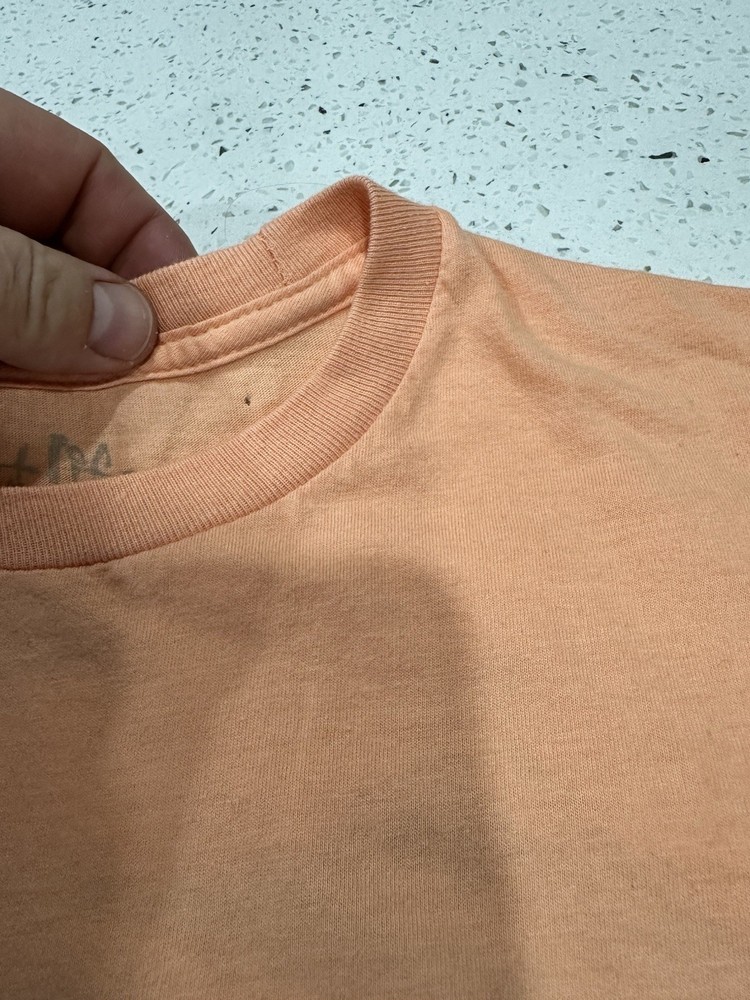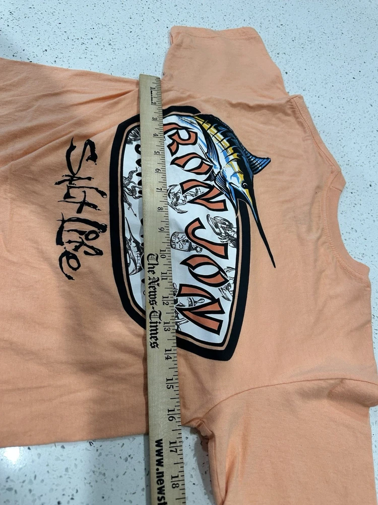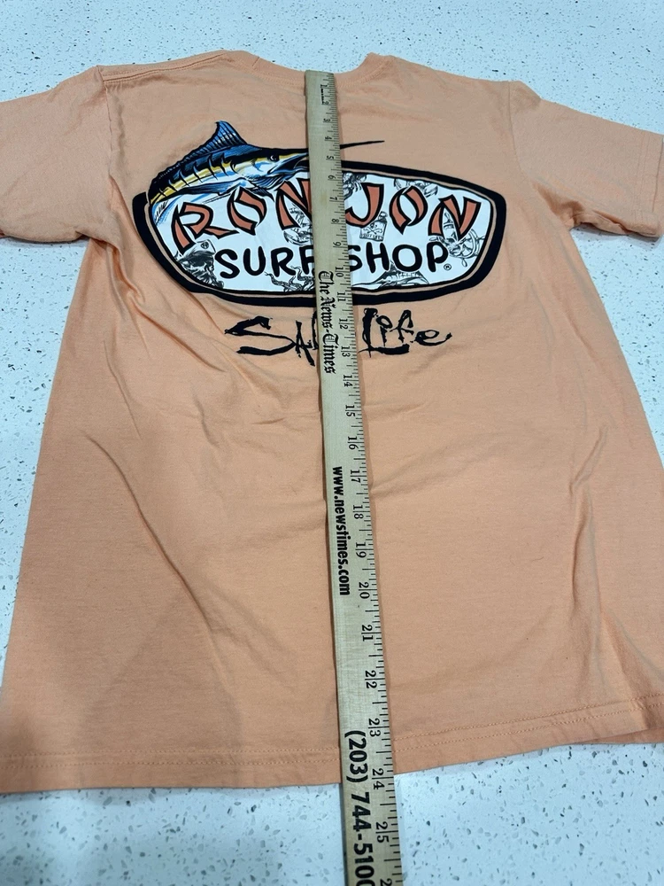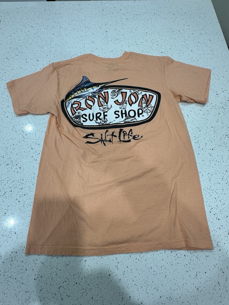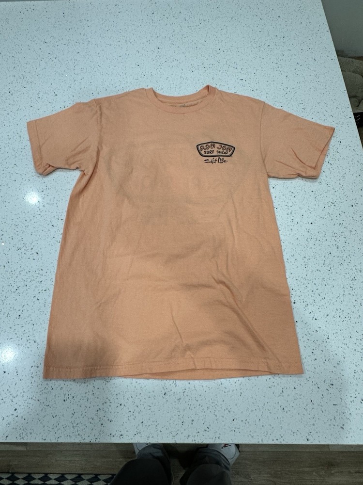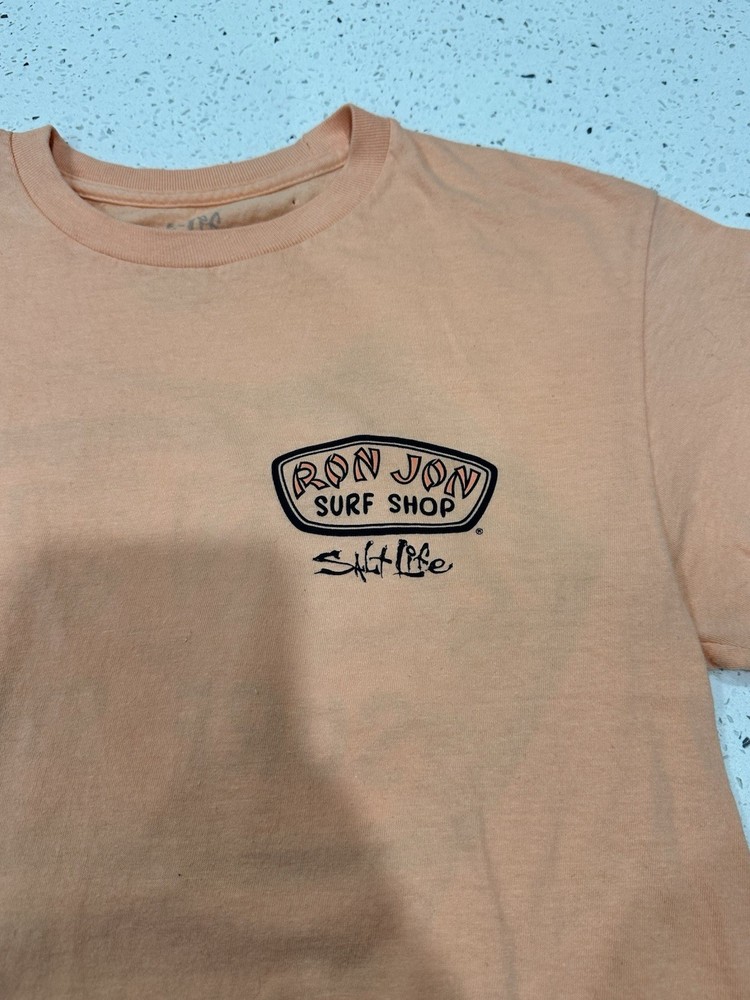 The Ron Jon X Salt Life x Back Hit Surf Shop Orange Small S Graphic T-Shirt Tee is a stylish and comfortable shirt perfect for men who love surfing. Made in collaboration with Ron Jon Surf Shop, this peach-colored tee features a graphic design that embodies the spirit of the ocean and the surfing lifestyle. The regular fit and small size make it a great option for those looking for a quality shirt that stands out with its unique design. Light pin hole on neck see pics Little dusty Nice graphic great vintage shape