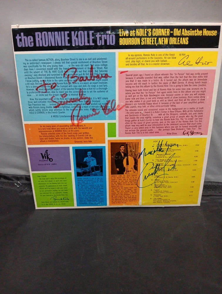 Experience the magic of the Ronnie Kole Trio with their limited edition vinyl record, Live at Koles Corner Old Absinthe House Bourbon Street New Orleans. This multicolor vinyl LP is a must-have for classical music enthusiasts and vinyl record collectors alike. The vinyl is in excellent (EX) condition, and the cardboard sleeve is also in excellent (EX) condition. This rare record from 1951 features the talents of Ronnie Kole, signed by the artist himself. Add this gem to your collection today.