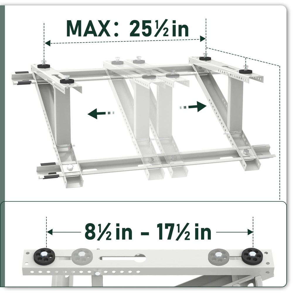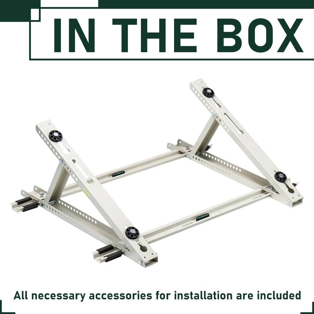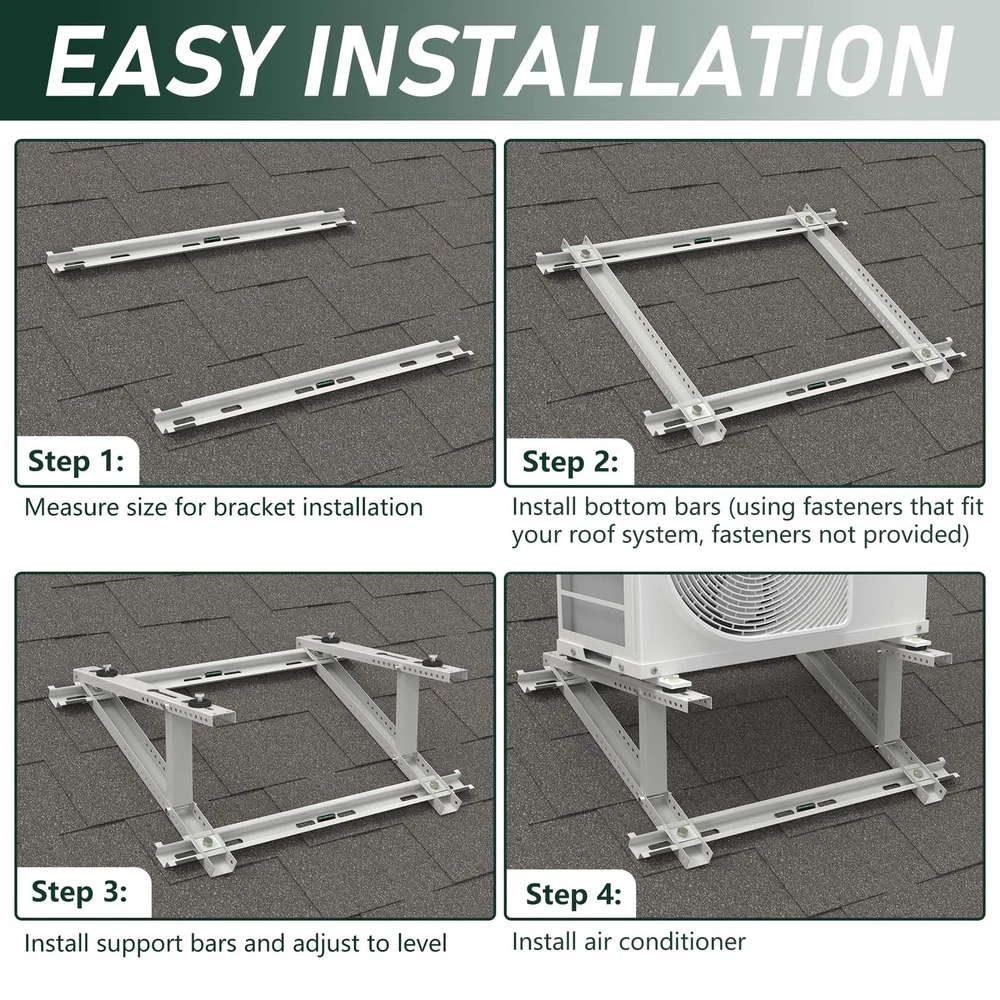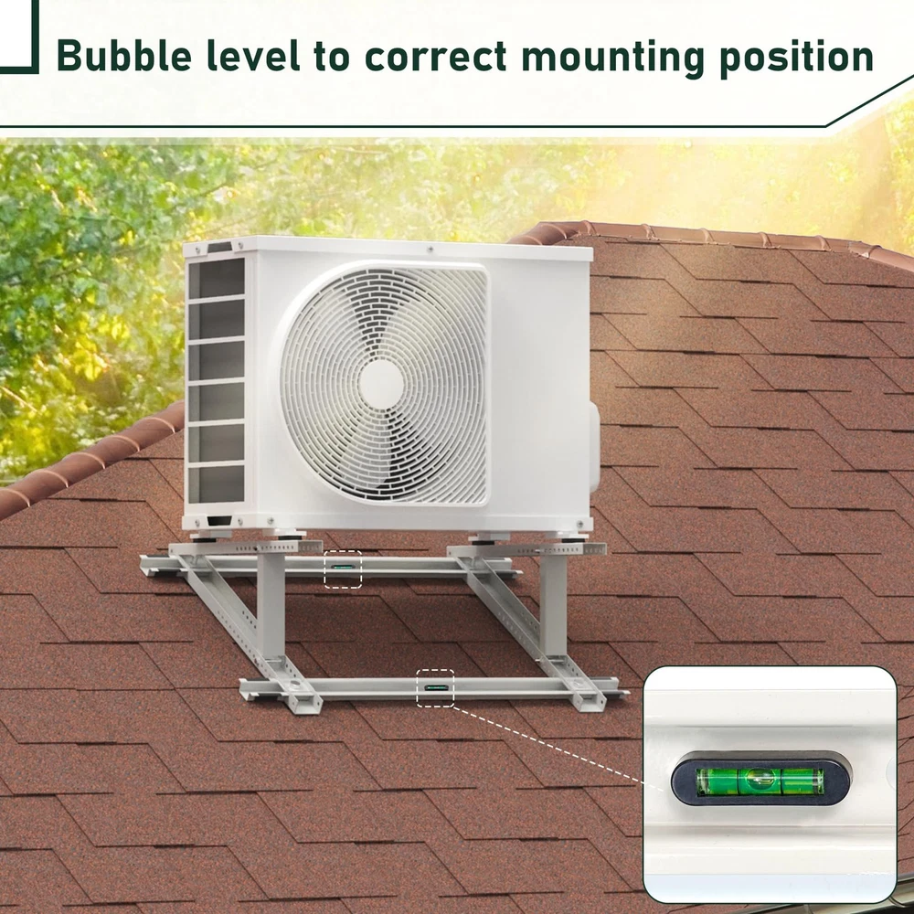 Air Conditioner Rooftop Mount Bracket for Mini Split Air Conditioners Heat Pump System, Adjustable Mounting Bracket for Rooftop, Heavy Duty Roof Bracket for 9,000-24,000 BTU HEAVY DUTY ROOFTOP BRACKET - The roof bracket is made of durable heavy galvanized steel with powder coating, sturdy and weather-proof for outdoor use, support up to 300 lbs SPECIFICALLY DESIGNED FOR ROOF - The adjustable roof bracket can be installed on roofs with a tilt angle from 10° -40°, designed to raise the height of the mini split unit horizontally on pitch roof so that the unit will be stable and run properly ADJUSTABLE DESIGN - The width of the rooftop mount bracket can be adjusted up to from 25-1/2'', compatible with most mini split air conditioner units on the market. Please kindly check your ac unit's size for the best compatibility GREAT AIR CONDITIONER ACCESSORIESS - Equipped with anti-vibration rubber pads on the roof bracket, help to avoid unnecessary movement and reduce vibration noise, prevent the heat pump unit from falling. The bubble level helps to correct mounting position EASY TO USE & INSTALL - The air conditioner rooftop mount bracket can be fast installed on the roof, installation instruction and necessary screws are provided